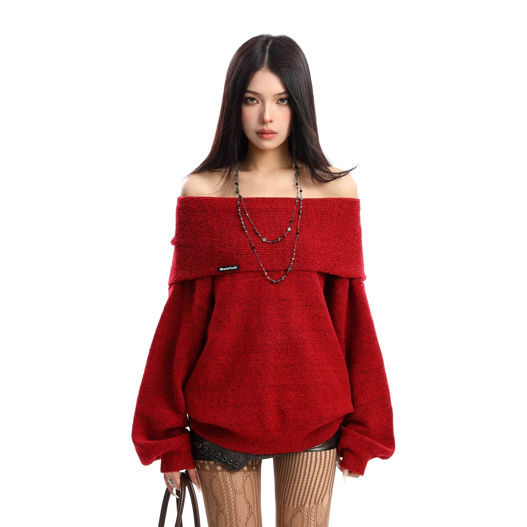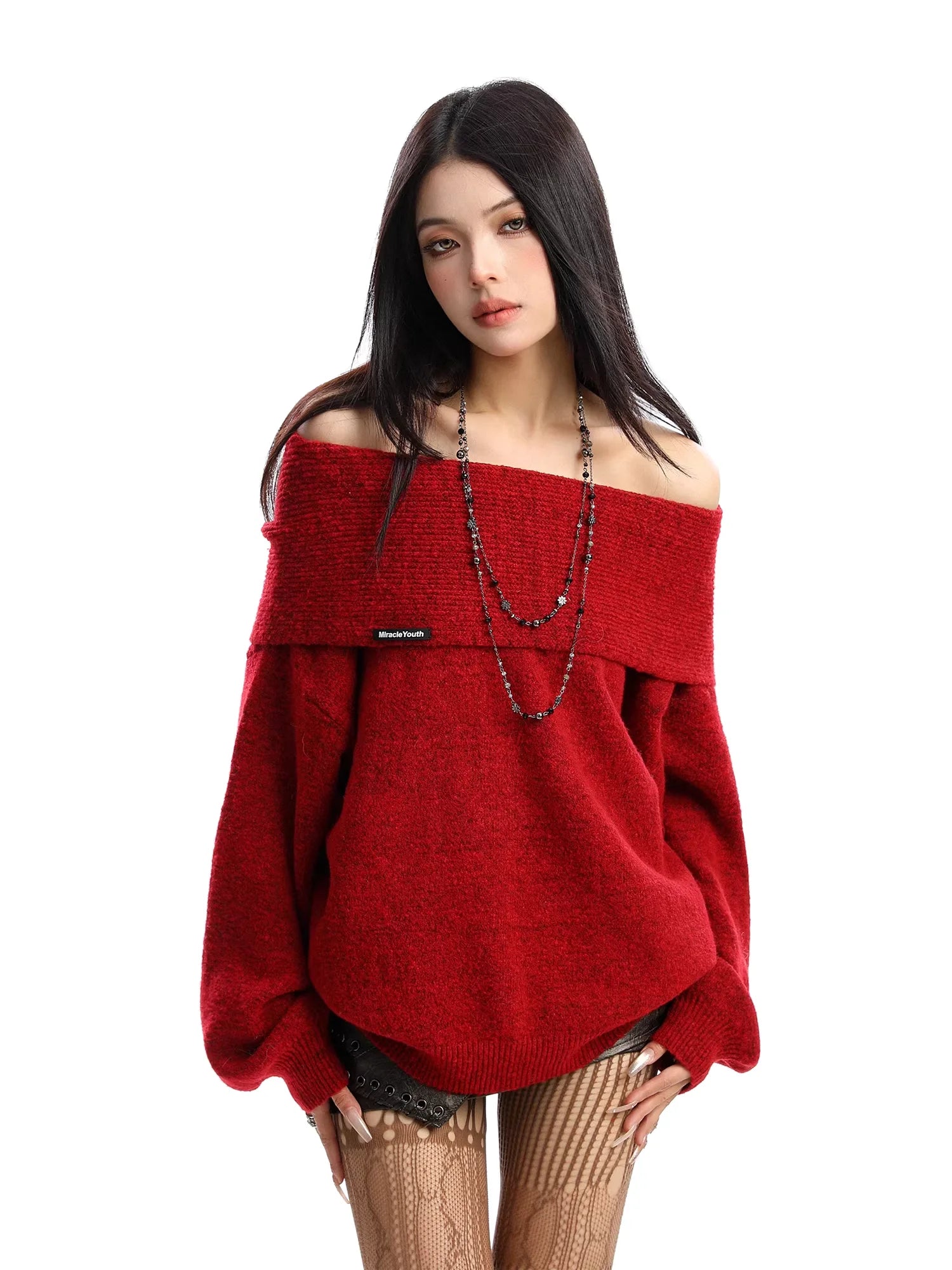 The bold red hue is beautifully contrasted with black textured shorts and beige patterned tights, creating a striking layered look. Finished with a subtle black label accent and styled with layered black beaded necklaces, this sweater is ideal for adding warmth and fashion-forward flair to your wardrobe.