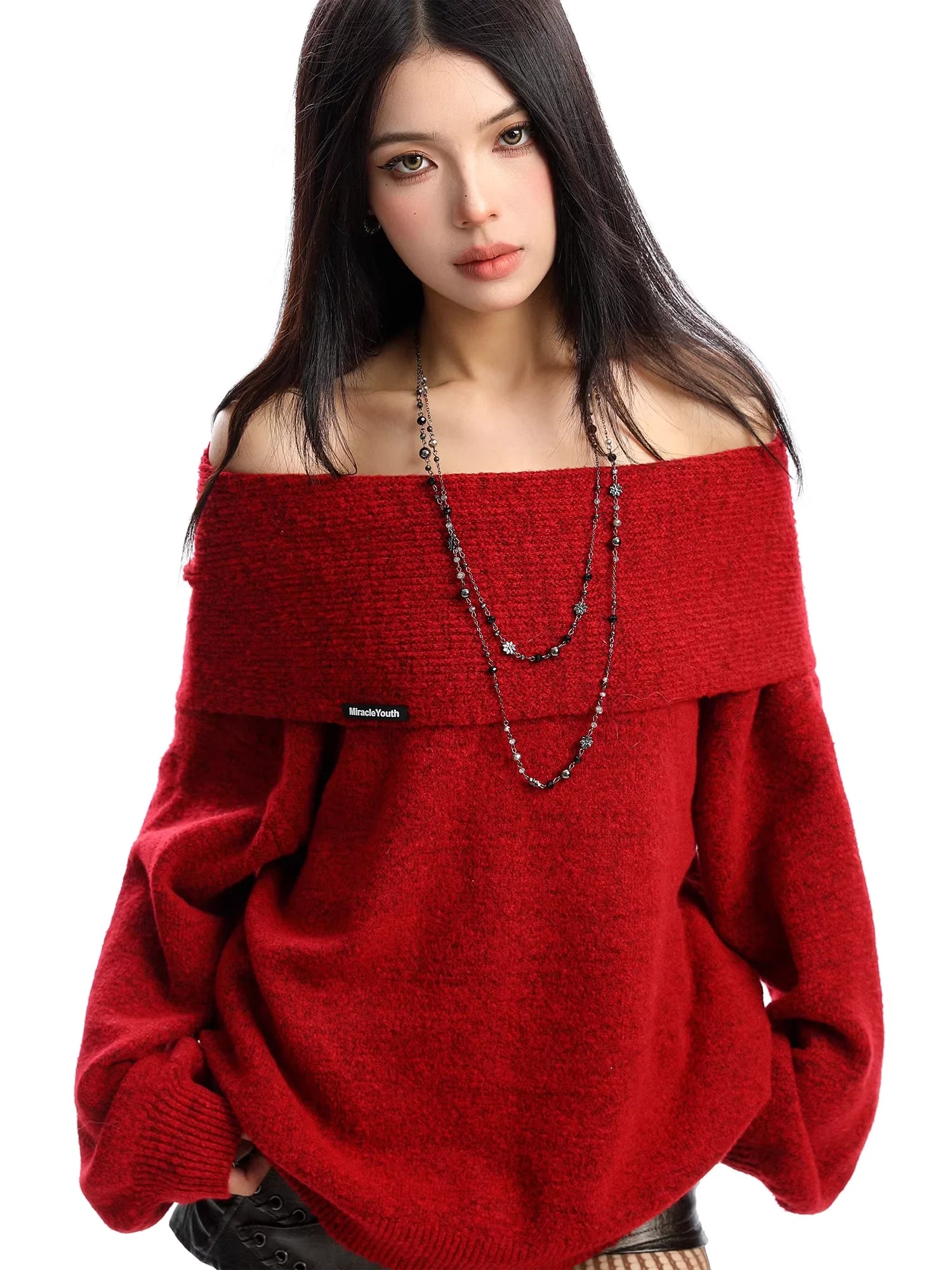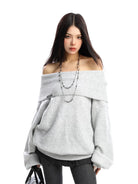 Embrace cozy elegance with this women's off-shoulder knit sweater, perfect for the cooler autumn and winter seasons. Featuring a wide fold-over neckline and long puff sleeves, this thick textured pullover offers a relaxed oversized fit for both comfort and style.