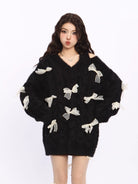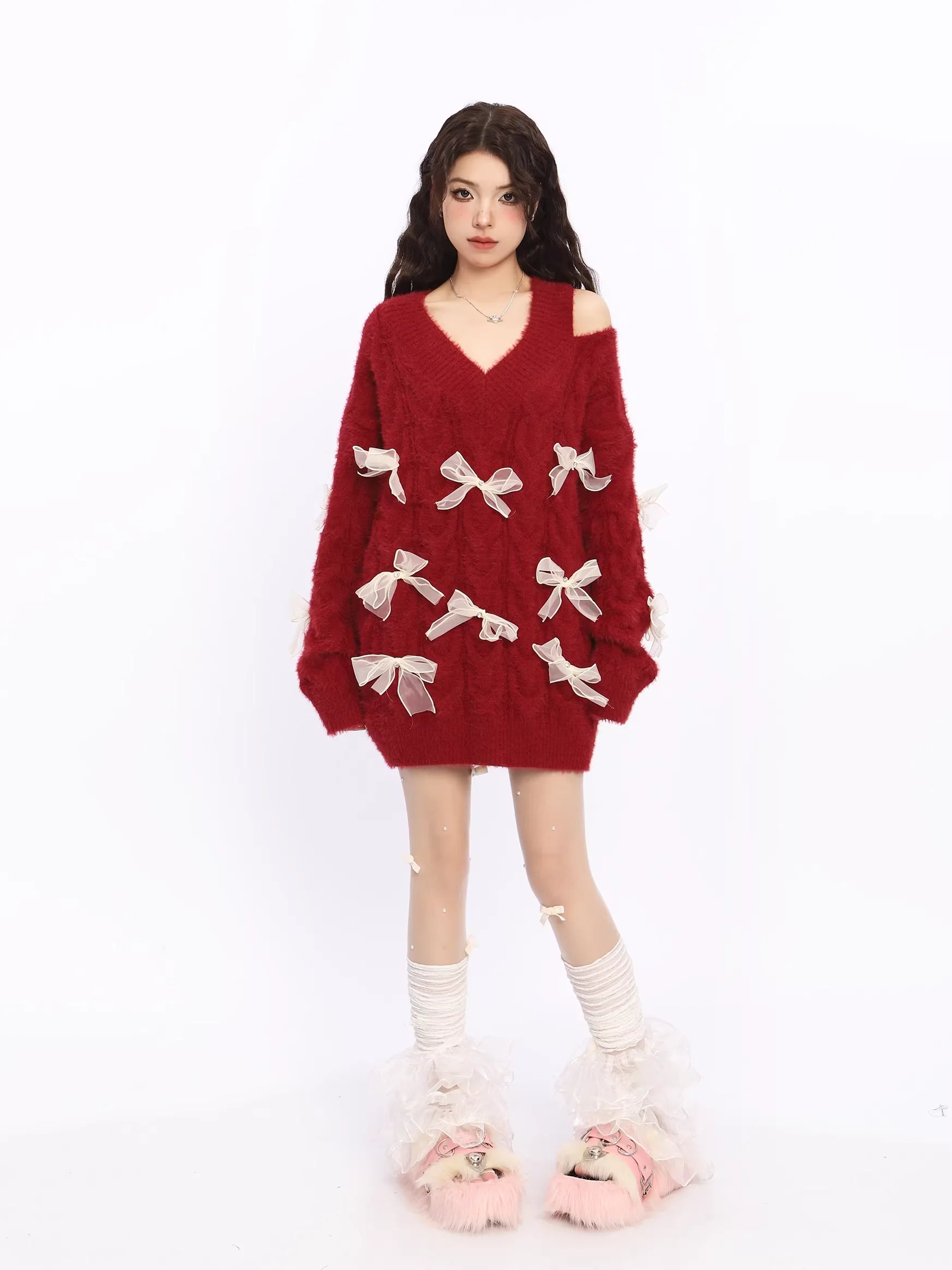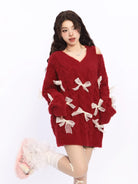 Elevate your autumn and winter wardrobe with this cozy and stylish off-shoulder red knit sweater dress for women. Designed with a flattering deep V-neckline and a trendy asymmetrical shoulder cut, this piece combines warmth with a touch of playful charm. Decorative white sheer ribbon bows embellish the front and sleeves, adding a whimsical and feminine touch. The soft, fluffy texture ensures comfort, while the oversized silhouette offers a relaxed, fashionable fit. Perfect for casual outings or festive occasions, this sweater dress is a standout choice for the colder seasons.