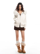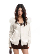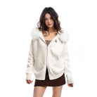 Stay cozy and stylish this autumn and winter with this women's white knit hooded sweater. Designed for comfort and warmth, it features a relaxed fit with ribbed cuffs and hem, two front patch pockets, and a soft zip-up front. The detachable faux fur collar adds a touch of elegance while allowing for versatile wear. A subtle embroidered logo on the chest adds a refined detail to this casual yet chic outerwear essential.