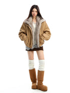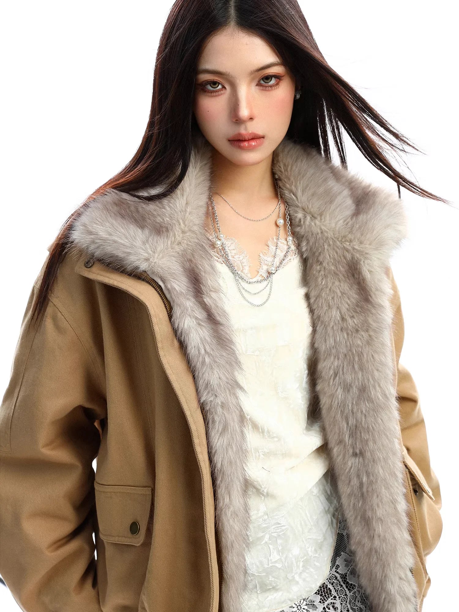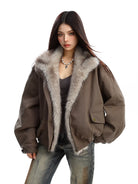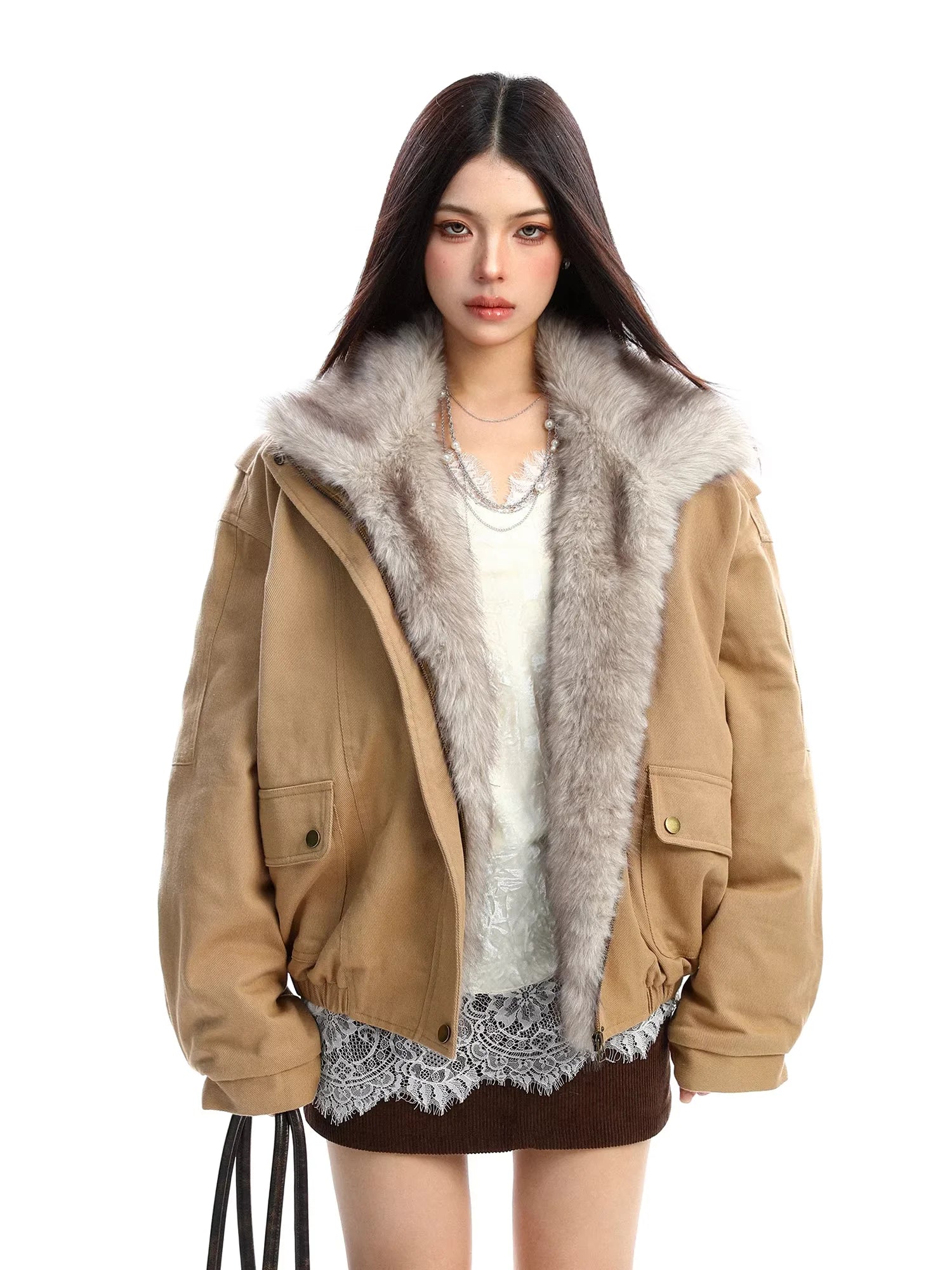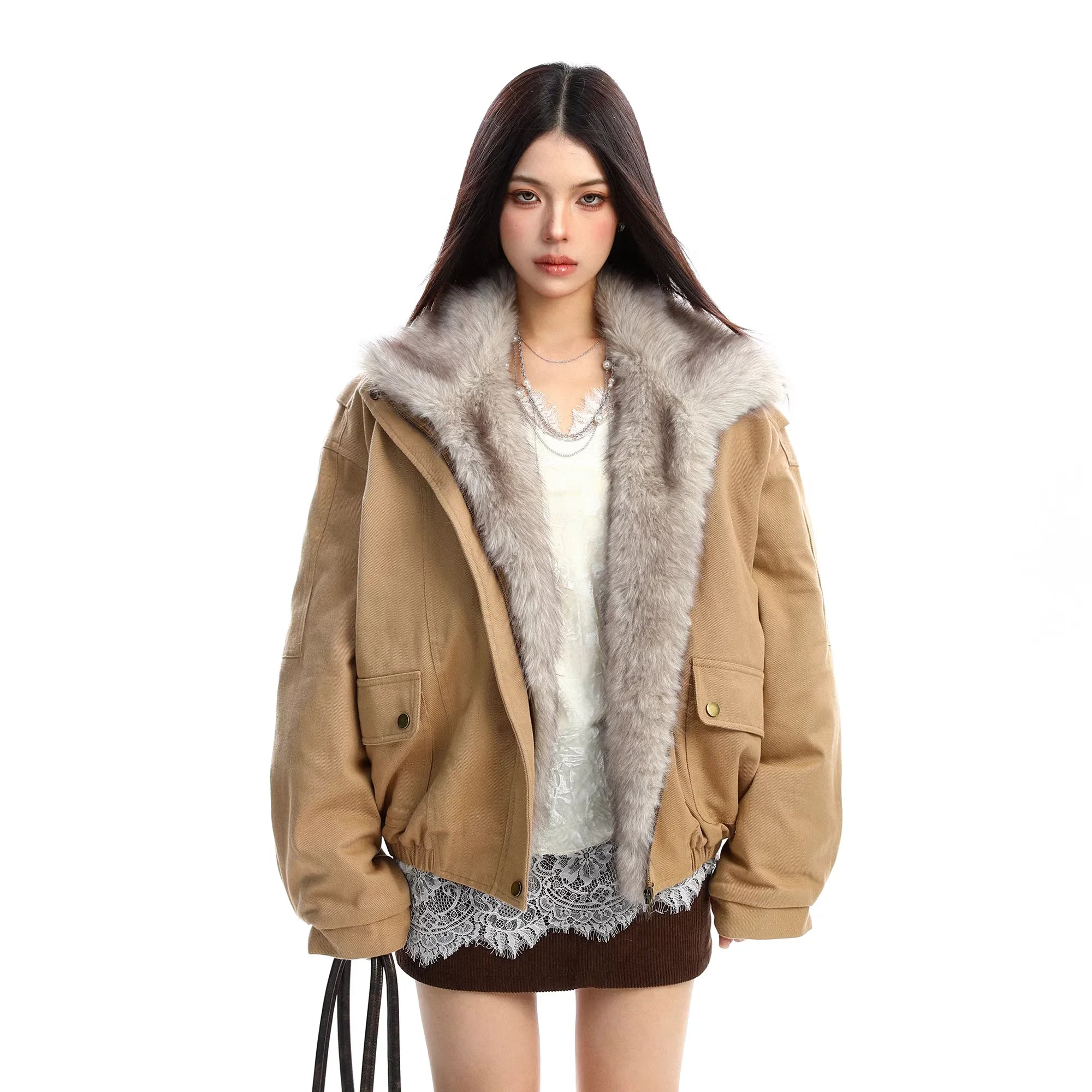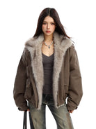 Stay warm and stylish this winter with this women's cotton parka jacket. Featuring a voluminous faux fur collar and cozy inner lining, this thick, oversized coat offers both warmth and modern elegance. The jacket includes long sleeves, flap pockets with snap buttons, and a loose fit for comfortable wear. Perfectly paired with layered outfits, this chic winter essential delivers functionality without compromising on style.