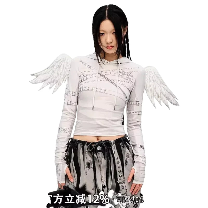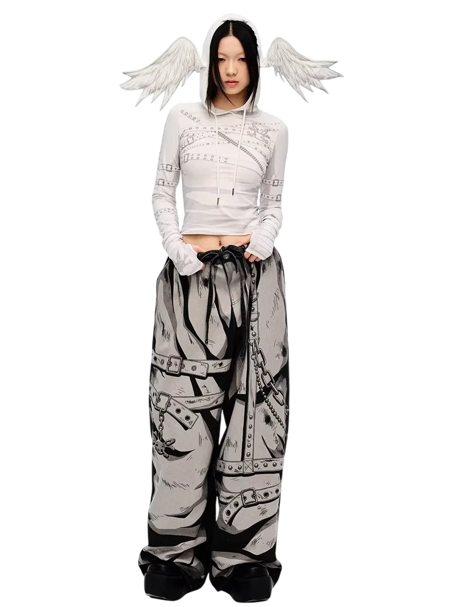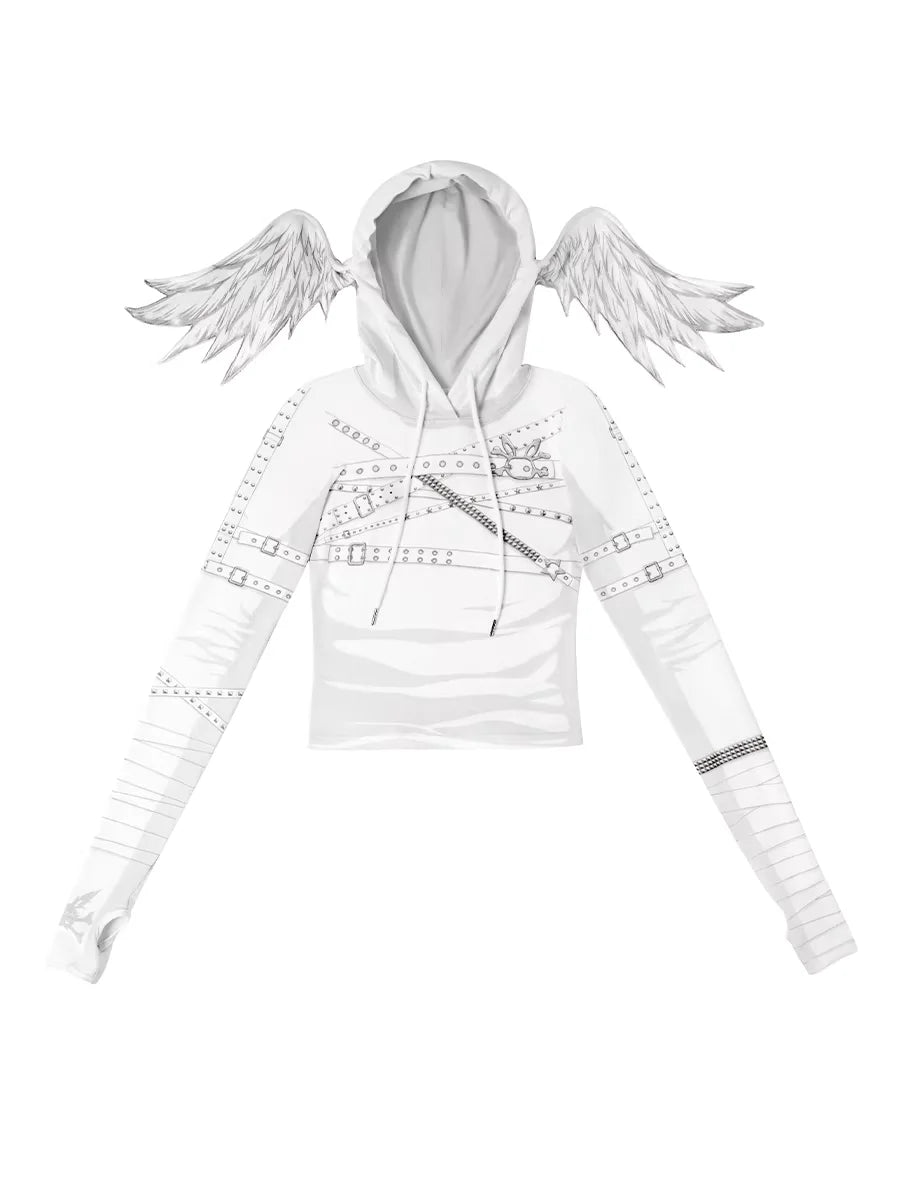 This fitted, long-sleeved crop hoodie features an artistic design with faux metal strap detailing and a subtle camouflage print. Designed for a fashion-forward look, the hoodie includes thumb holes, a drawstring hood, and a slim silhouette. Worn by a female model, it's a statement piece perfect for streetwear or edgy, punk-inspired styles.