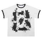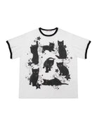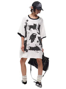 Make a bold statement with this oversized women's T-shirt dress, featuring a playful all-over print of black cartoon-style cats. Designed with a relaxed, loose fit and half sleeves, it offers both comfort and contemporary street style. Contrasting black trim accents the collar and sleeve edges, while decorative stars and swirls add a whimsical touch. Perfect for casual outings or urban-inspired looks.