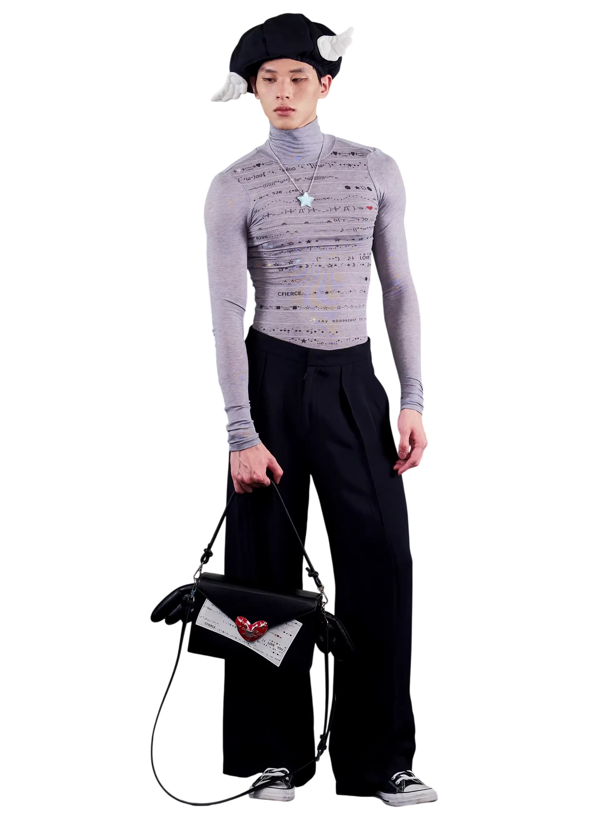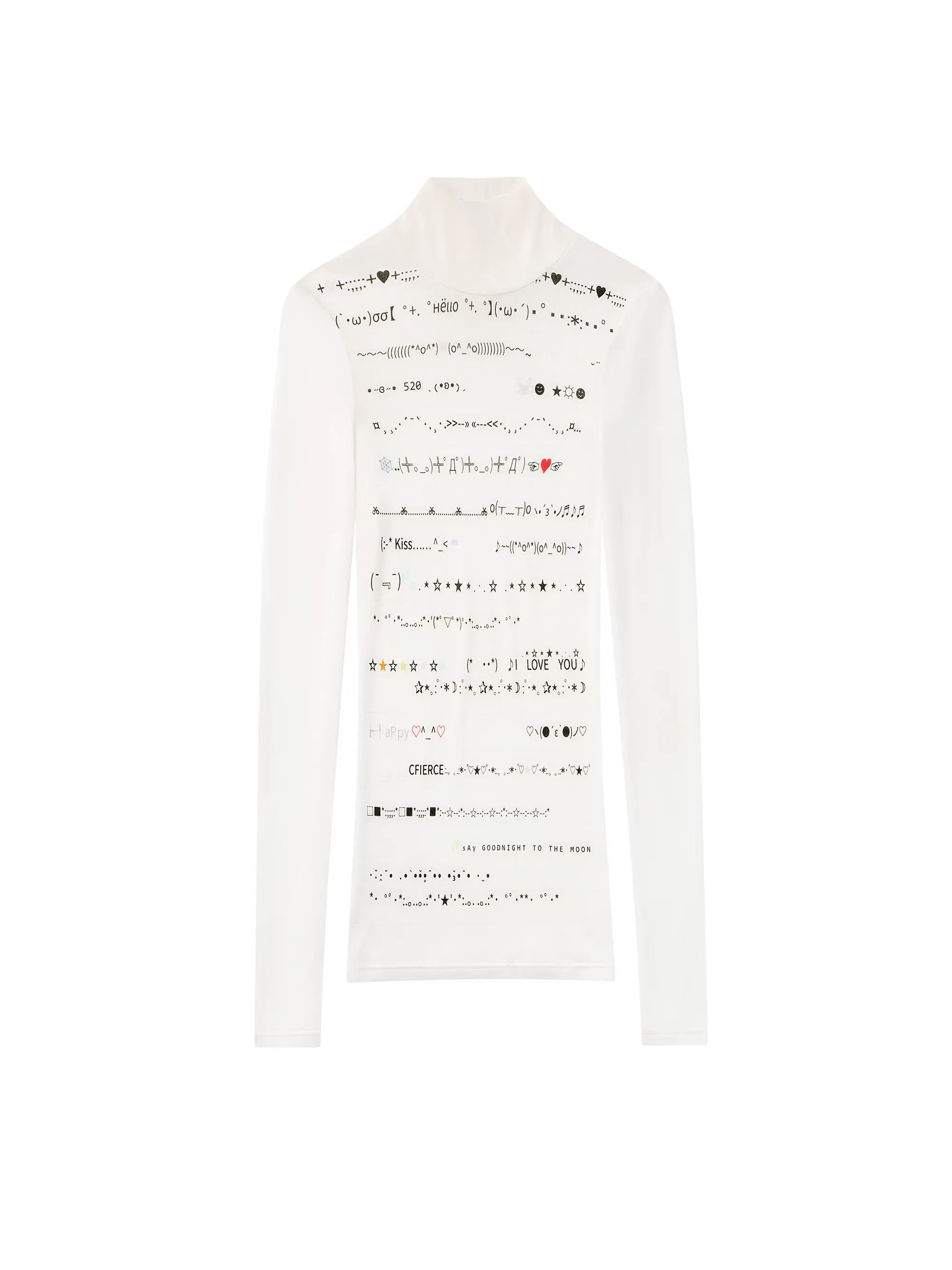This women's long-sleeve turtleneck top features a semi-sheer wool blend fabric with playful ASCII-style emoticon prints and text graphics like 'I LOVE YOU.' Designed with a slim fit, it offers a modern, tech-inspired aesthetic perfect for edgy and alternative fashion styles.