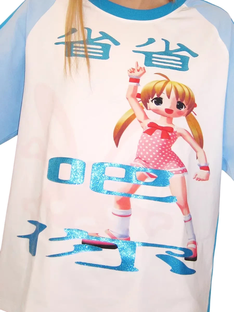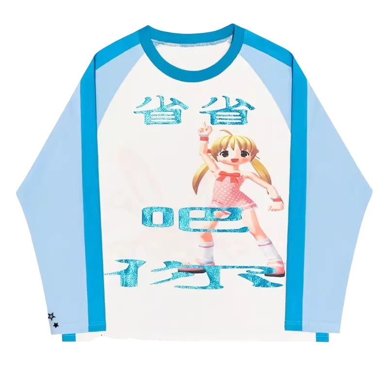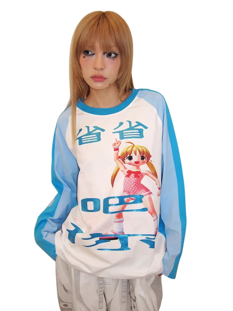 This unisex long-sleeve T-shirt features a stylish raglan sleeve design with a white body contrasted by sky blue and turquoise blue sleeves. The shirt showcases a playful cartoon girl in a pink polka-dot outfit, accented with sparkling blue Chinese characters for added flair. Ideal for spring and summer wear, this vibrant tee offers a fun and youthful look perfect for casual outfits.