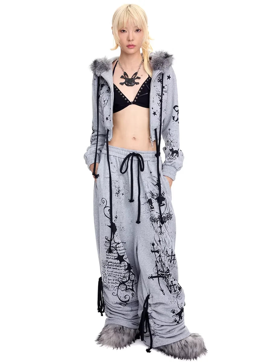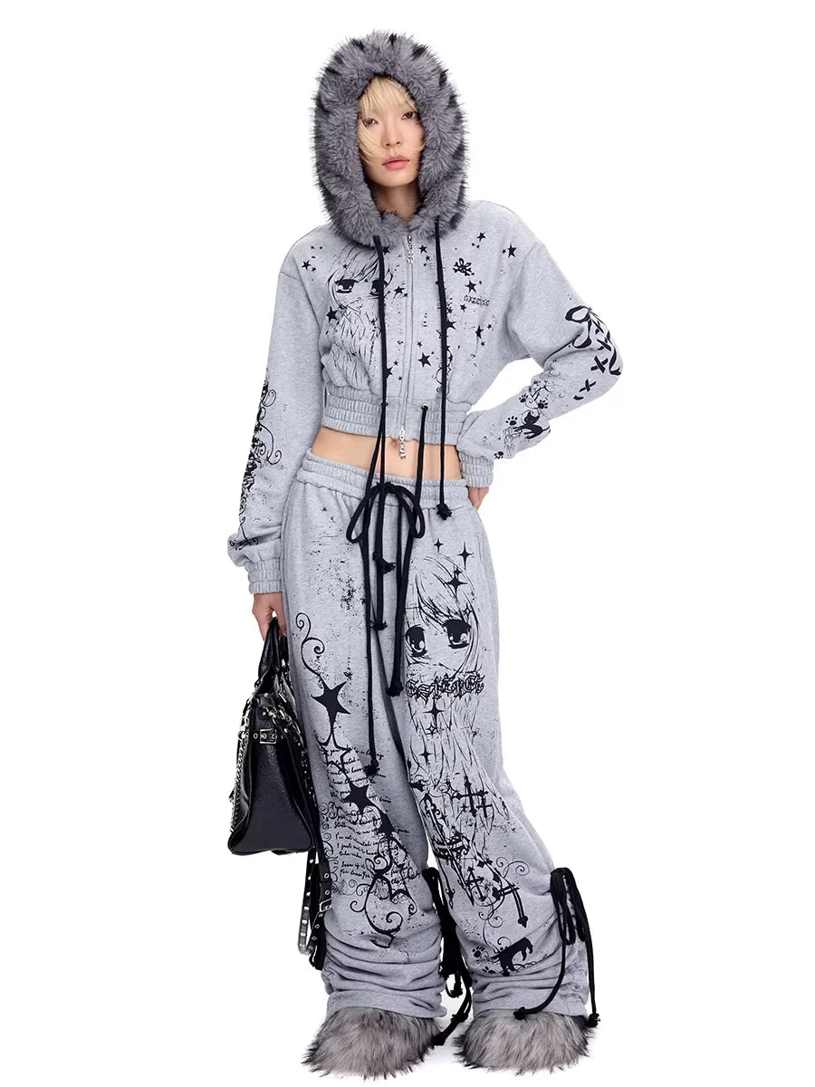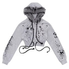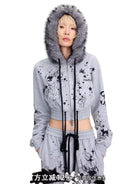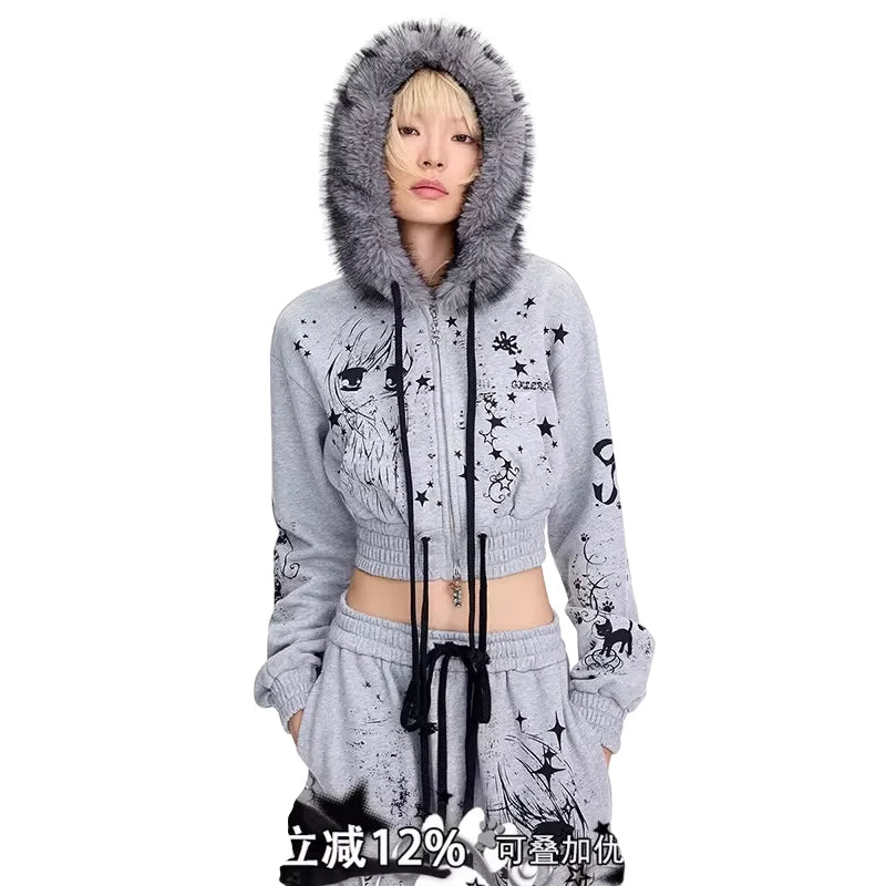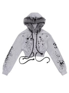 Make a bold statement with this eye-catching cropped sweatshirt featuring dramatic black and white graffiti-style graphics, stars, and anime-inspired artwork. Designed with a cozy faux fur-trimmed hood, this grey sweatshirt offers both comfort and streetwear flair. The zip-up front and soft knit fabric make it perfect for casual wear with an edgy twist. Styled for young women who love playful and artistic fashion.
