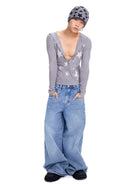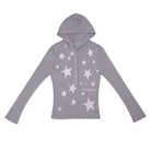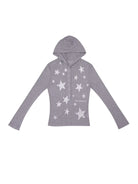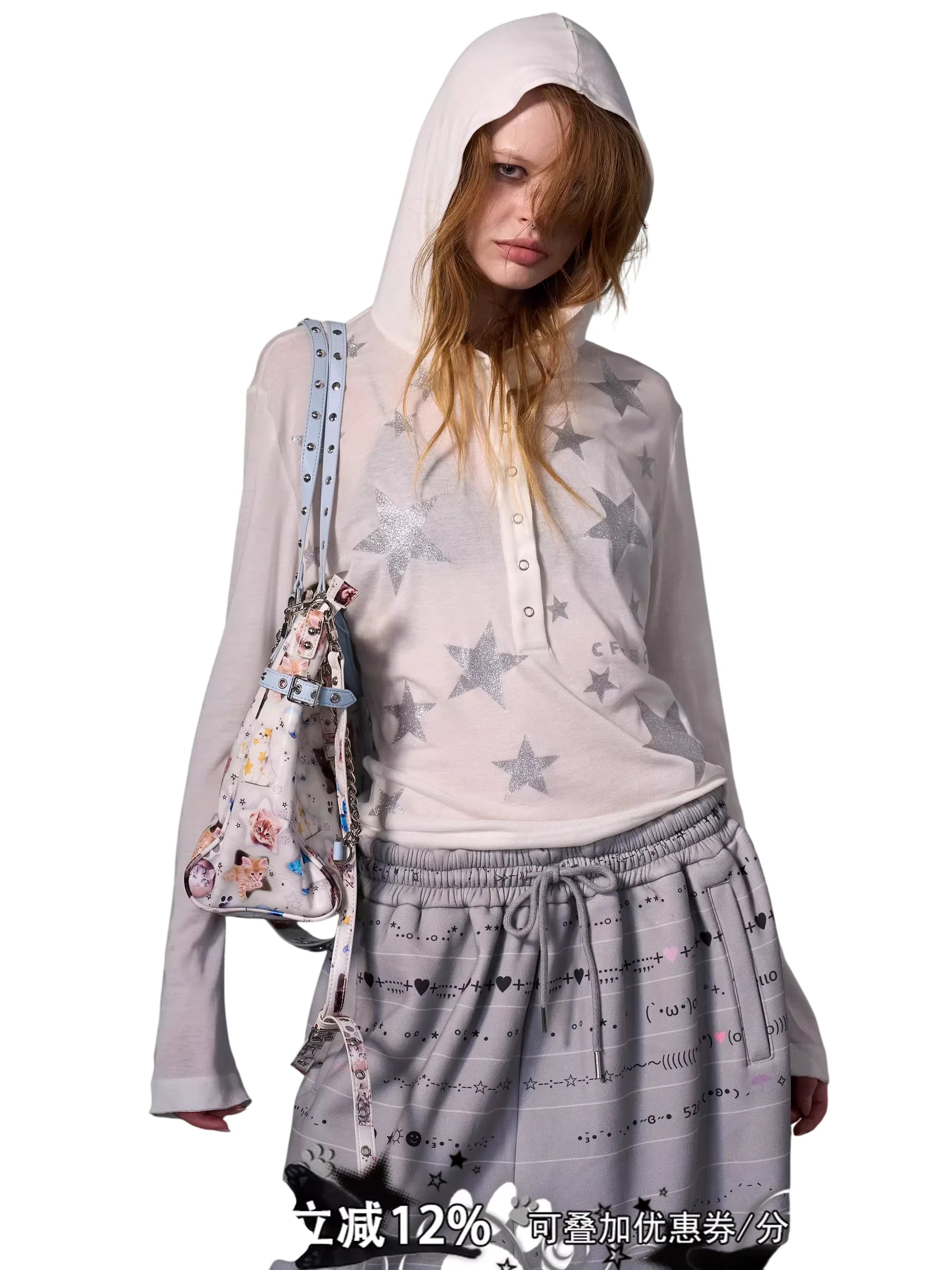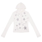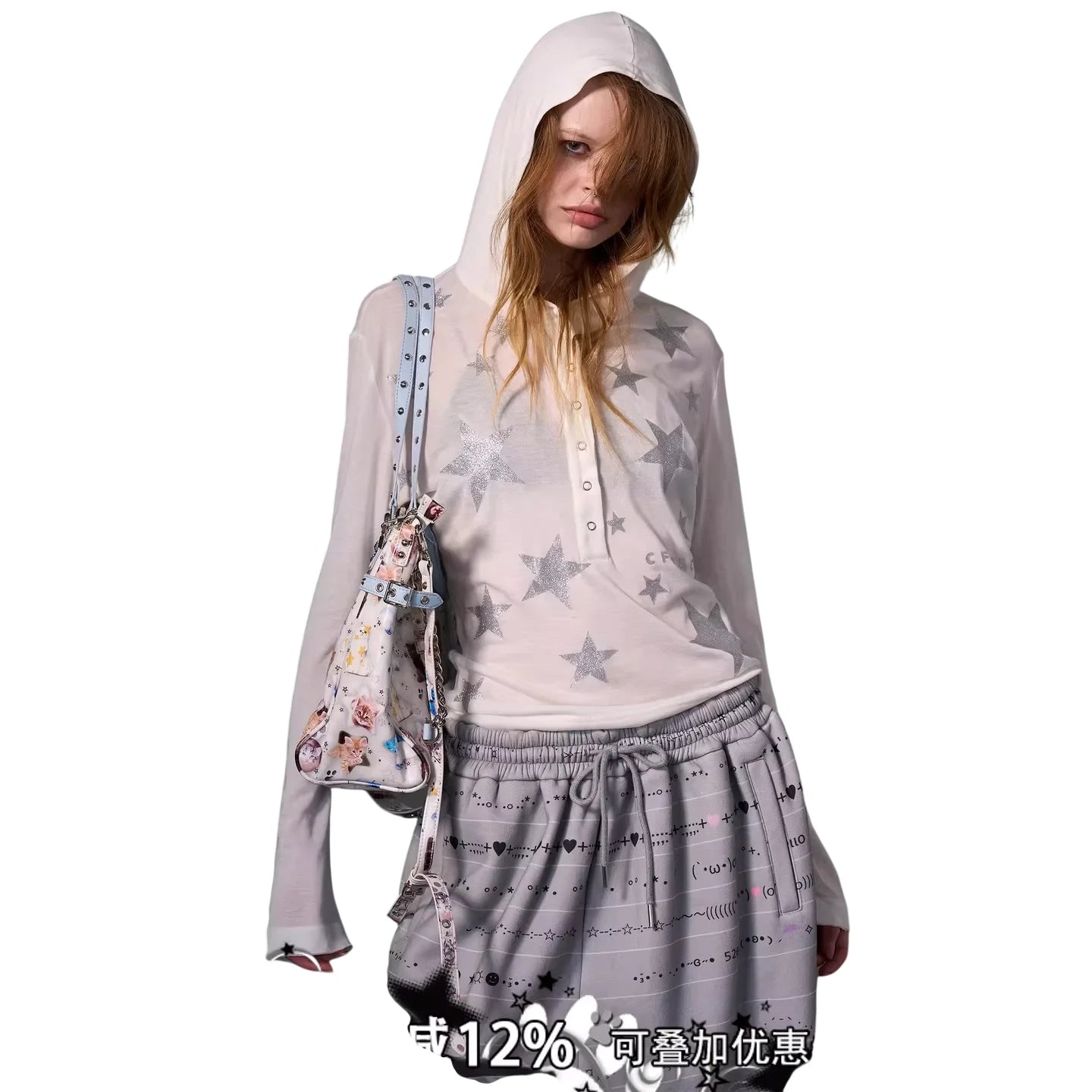 This stylish long-sleeve hoodie top features a sheer white fabric with a buttoned placket and metallic glitter star prints, offering a unique blend of casual comfort and artistic flair. Designed for women, it’s perfect for layering and making a bold fashion statement.