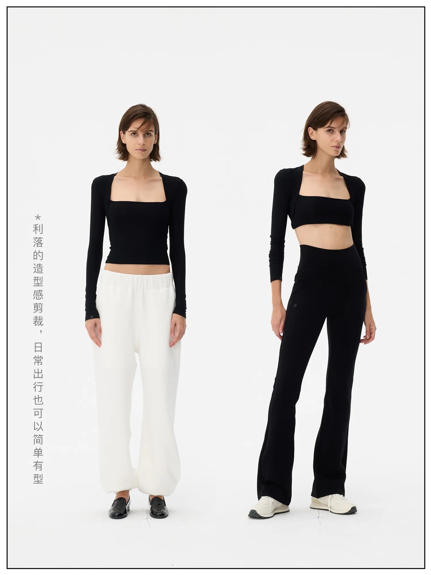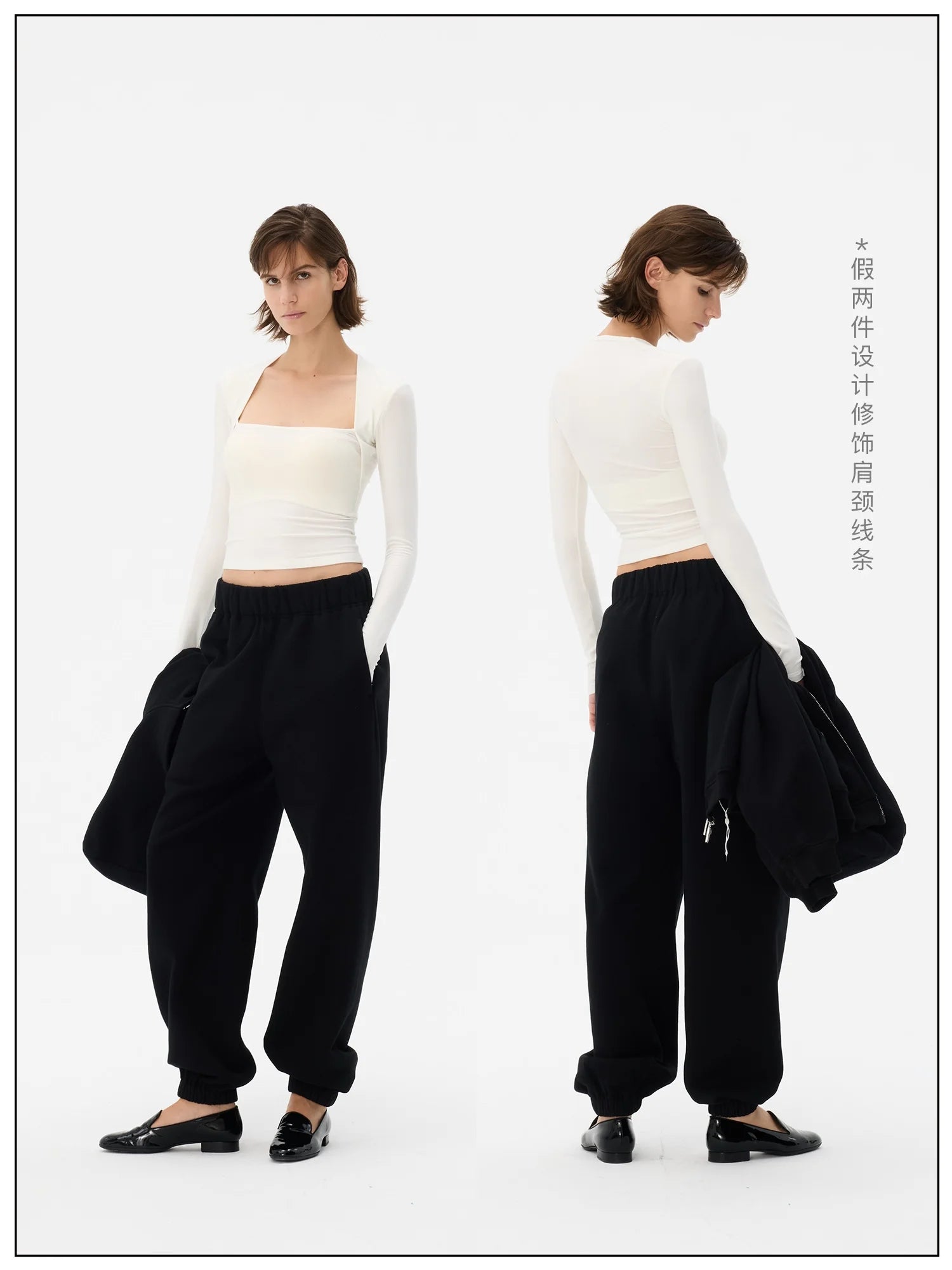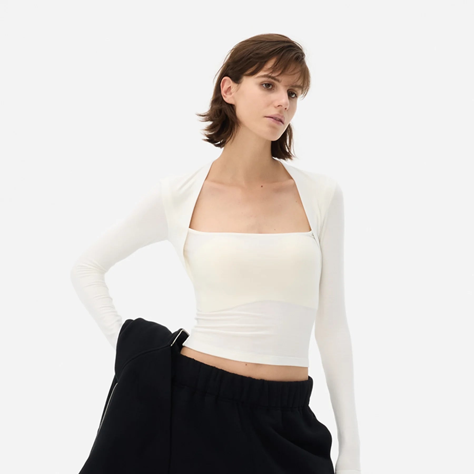 This women's stylish crop top features a faux two-piece design with a slim-fit silhouette that enhances the figure. The long sleeves and square neckline create a bolero-inspired effect for a modern layered look. Slightly sheer and snug, this top pairs effortlessly with casual or elevated bottoms, offering versatile styling options. Ideal for contemporary wardrobes seeking both elegance and comfort.