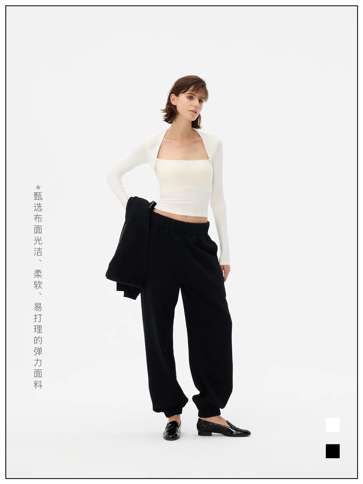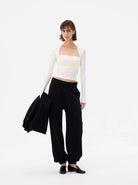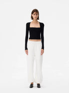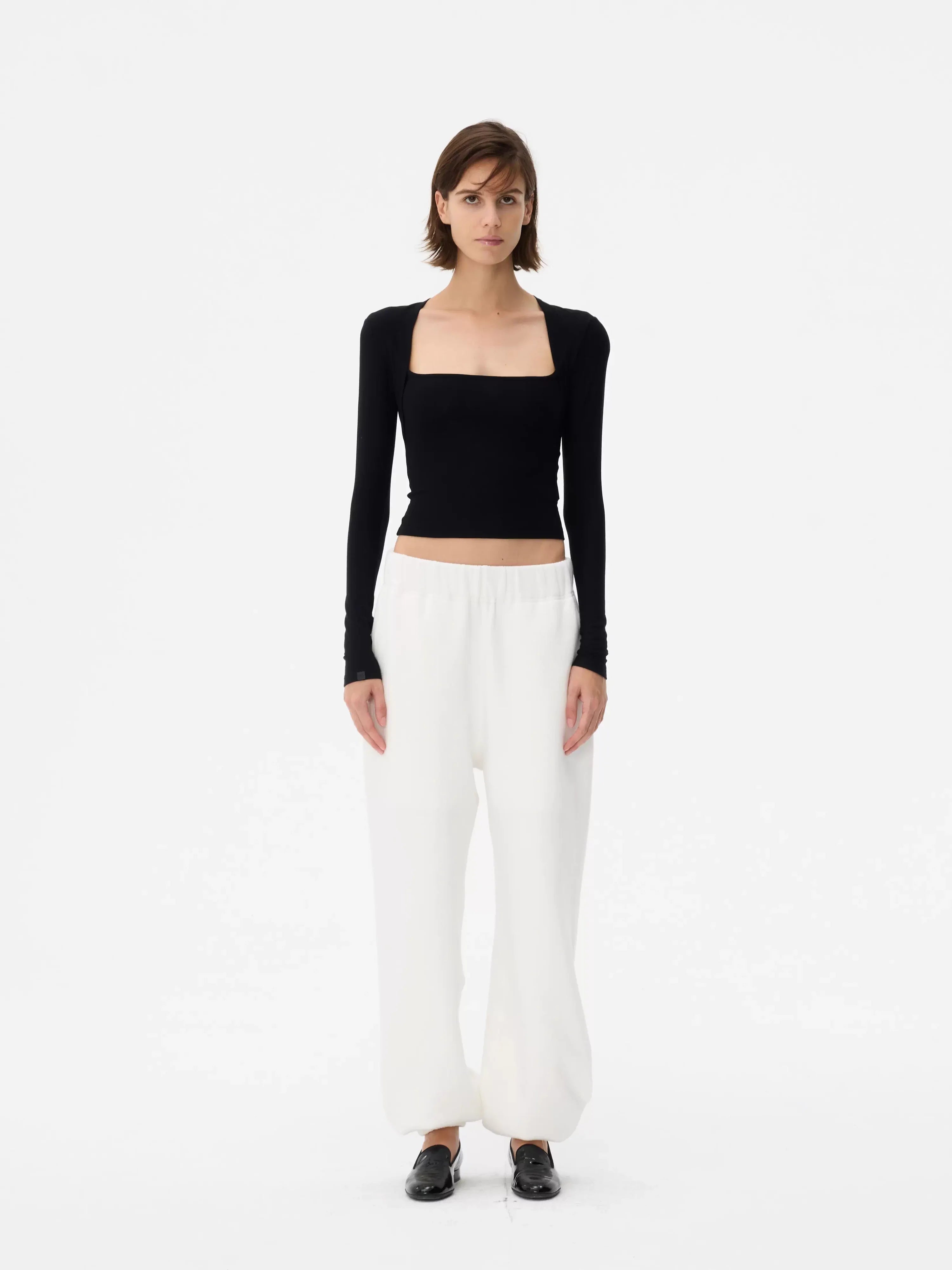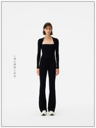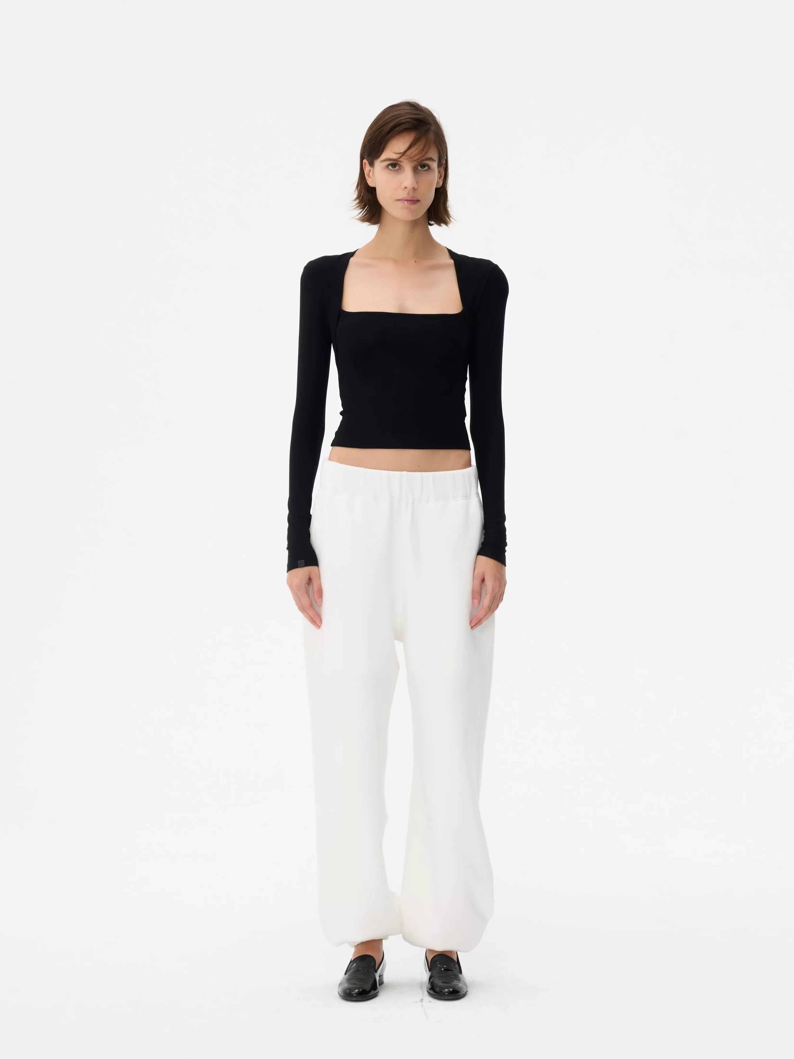 This women's stylish crop top features a faux two-piece design with a slim-fit silhouette that enhances the figure. The long sleeves and square neckline create a bolero-inspired effect for a modern layered look. Slightly sheer and snug, this top pairs effortlessly with casual or elevated bottoms, offering versatile styling options. Ideal for contemporary wardrobes seeking both elegance and comfort.