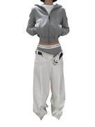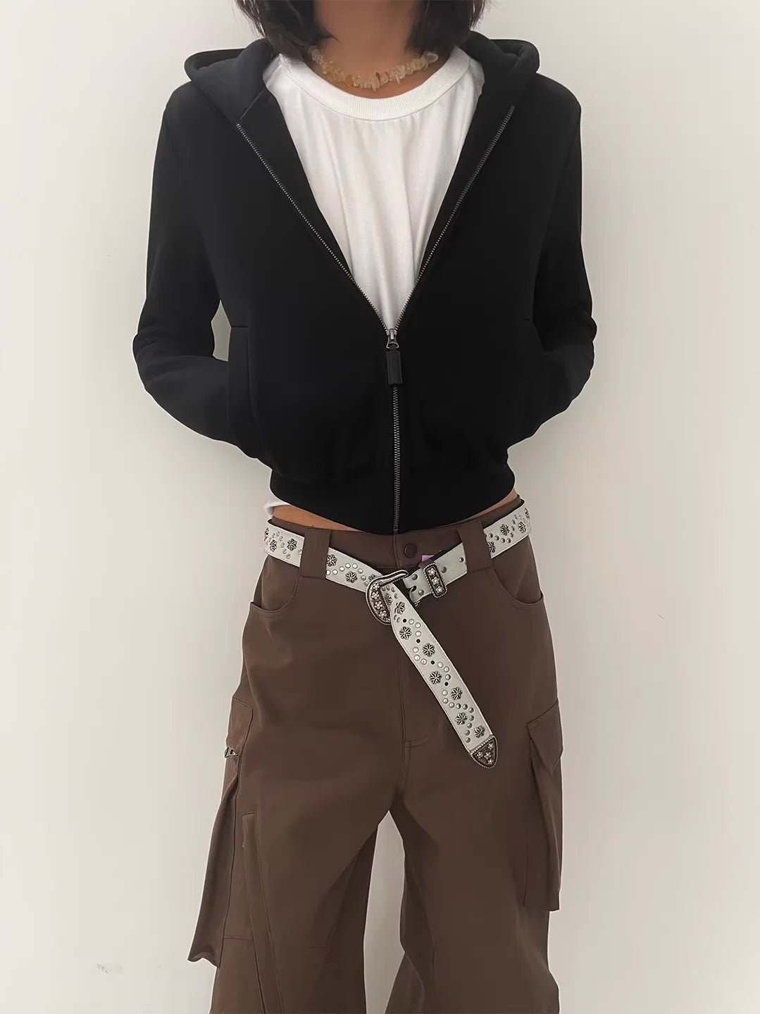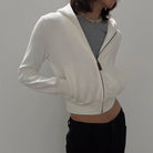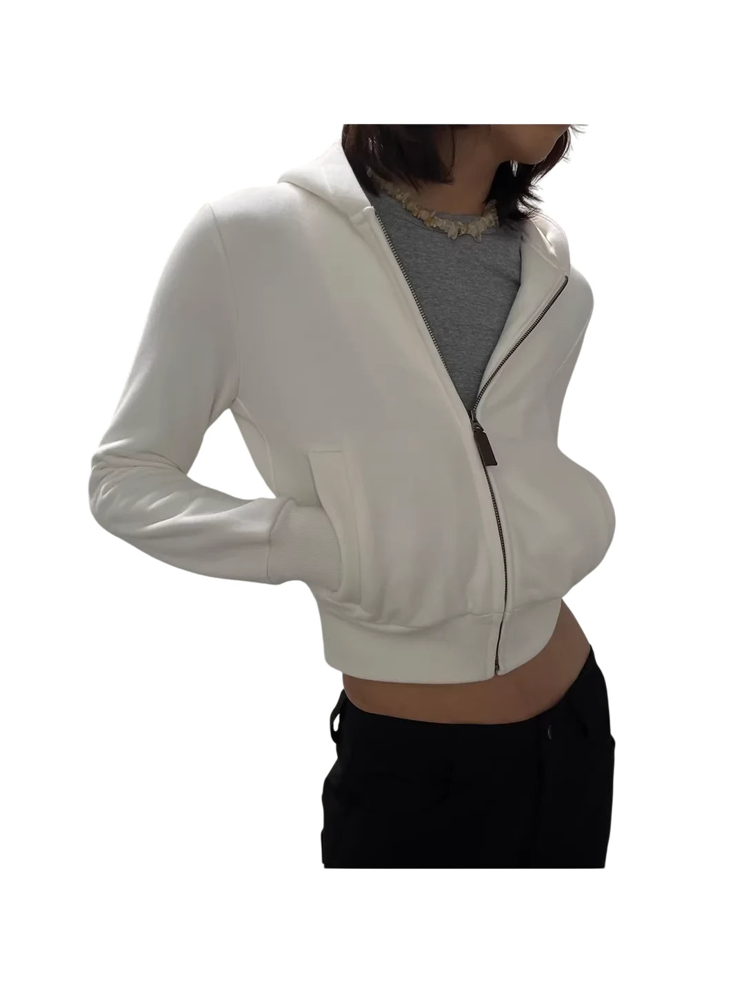 This women's cropped hoodie features a snug fit and is fleece-lined for added warmth and comfort. Designed with a zip-up front in a light grey hue, it layers effortlessly over an inner top. Ideal for casual wear, this hoodie pairs well with a variety of bottoms for a modern, laid-back look.