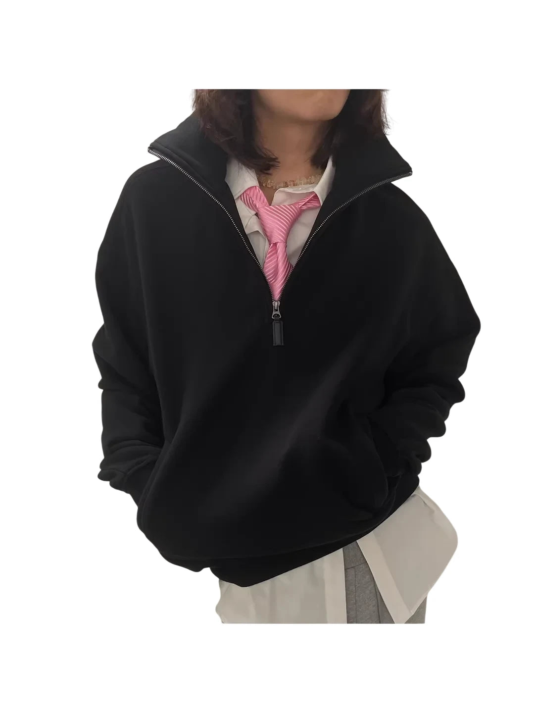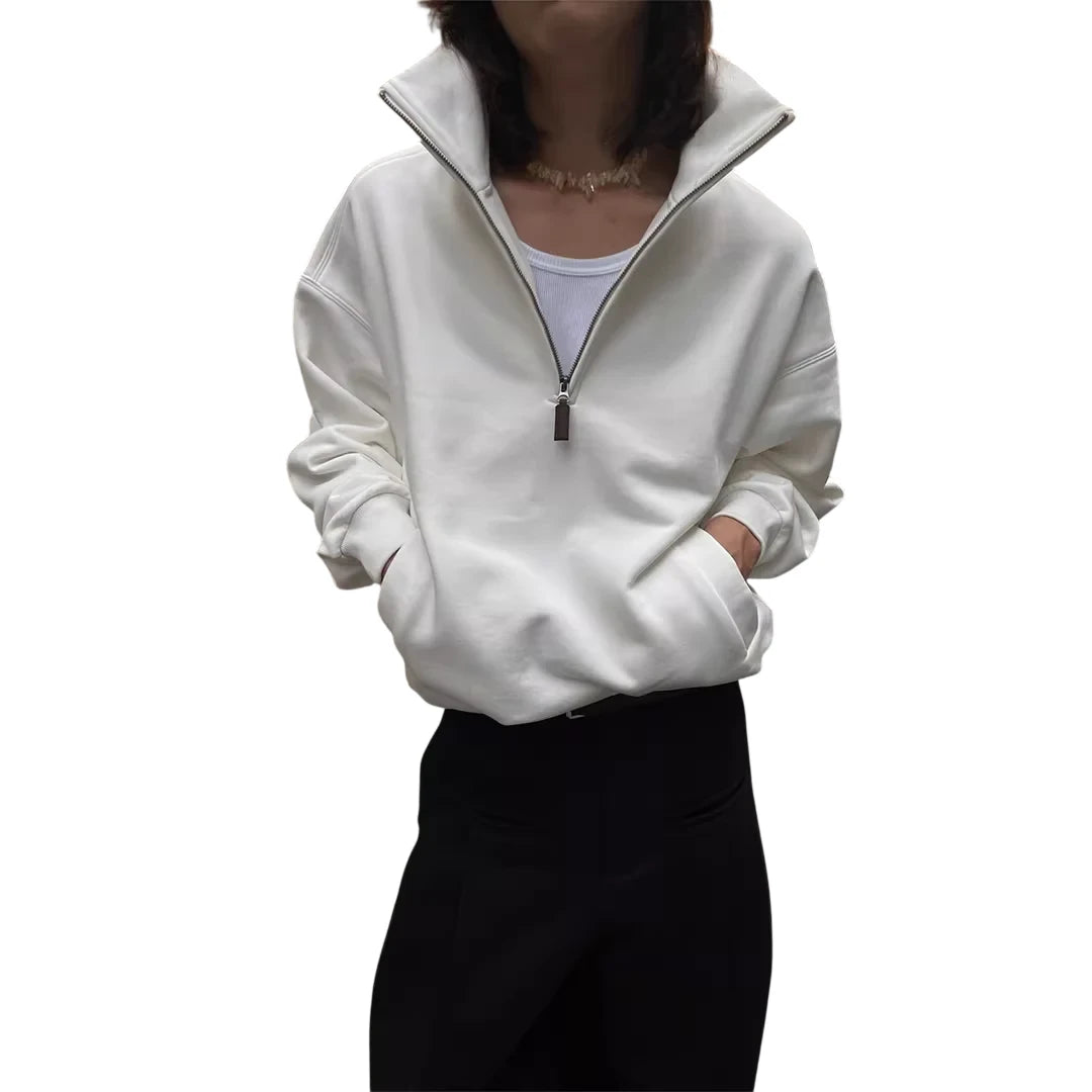 Stay cozy and stylish with this fleece-lined half-zip pullover hoodie. Designed for a unisex fit, this casual sweatshirt features a high stand collar and long sleeves for added warmth. The slightly oversized silhouette pairs perfectly with both casual and elevated looks. Side pockets provide practical comfort, making it ideal for everyday wear. Layer it over your favorite basics for an effortlessly cool urban outfit.