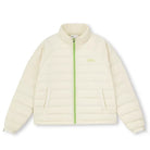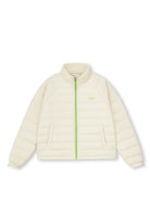The sporty, color-blocked design in lime green and off-white adds style, while features like a high collar, waterproof zipper pockets, and drawstring hem enhance functionality. Whether on the trail or in the city, this versatile coat offers outdoor performance and modern appeal.