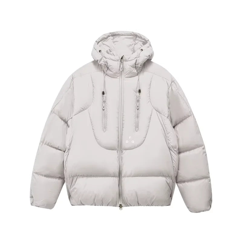 Stay warm and stylish during the coldest months with this men's winter down jacket, featuring a three-dimensional design tailored for a modern silhouette. Built to provide superior insulation, the jacket is filled with 90% white duck down and includes a high collar, adjustable hood, and double front zippers for extra protection against the elements.