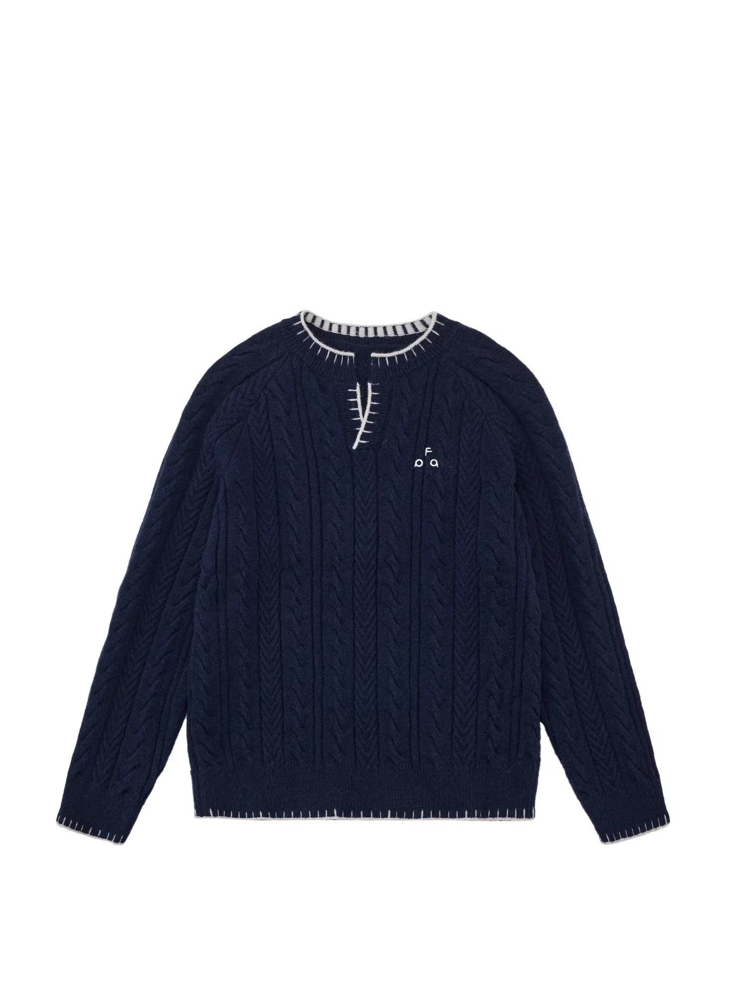 Elevate your seasonal wardrobe with this men's vintage-inspired pullover sweater, perfect for spring and autumn. Featuring a classic Henley collar and V-neck design, this high-end knit sweater offers timeless cable-knit texture with distinctive contrast stitching at the collar, hem, and cuffs. An embroidered chest logo adds a subtle touch of style, while the relaxed fit ensures casual comfort. Layer it easily over a T-shirt for a laid-back, refined look.