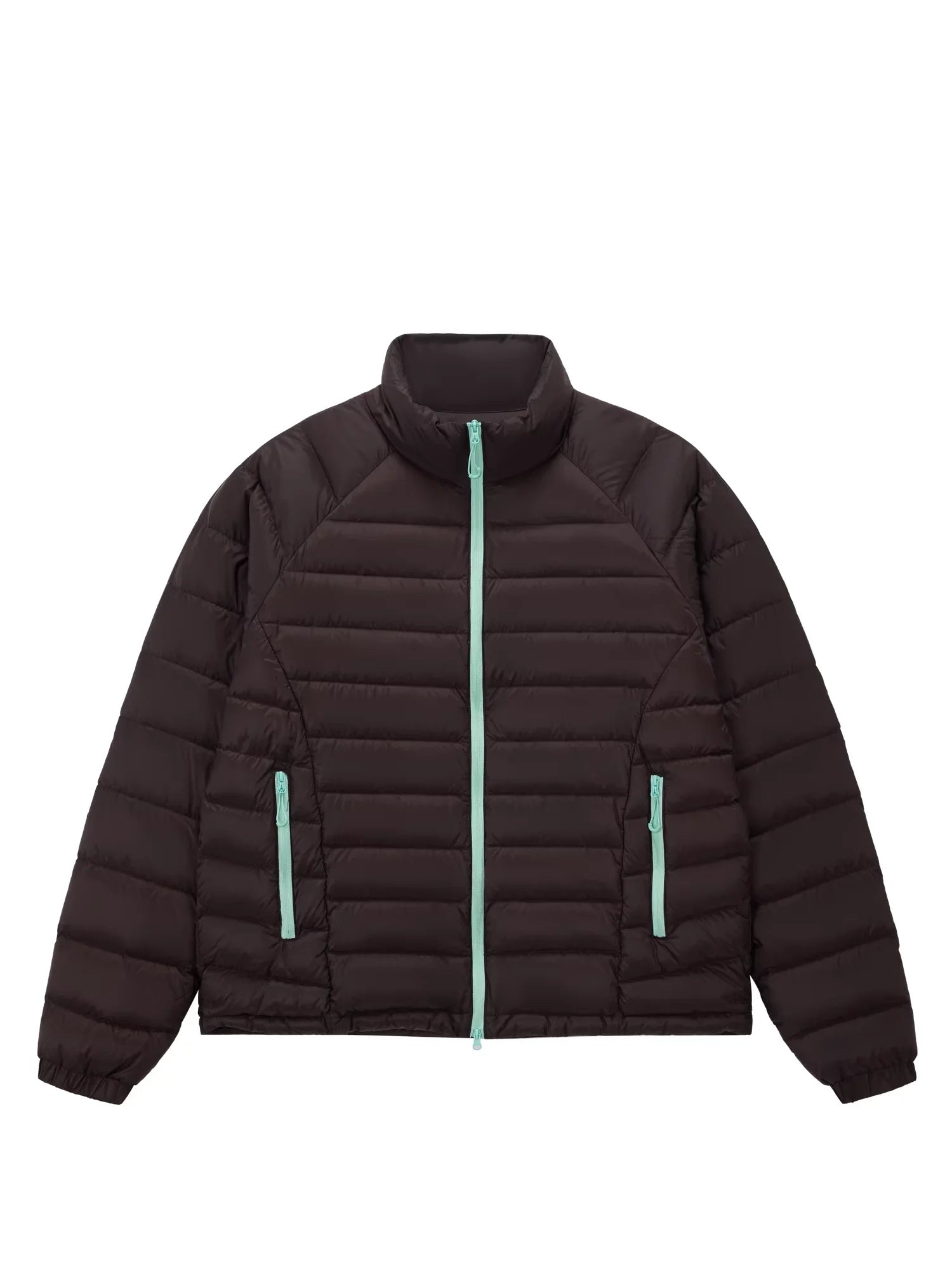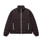 The jacket showcases a modern colorblocked design, with a dark brown base accented by contrasting mint green zipper and trim. Horizontal quilted stitching enhances its structure, while the high collar provides additional coverage and warmth. A small chest logo adds a subtle branding detail.