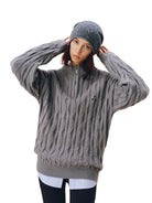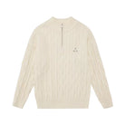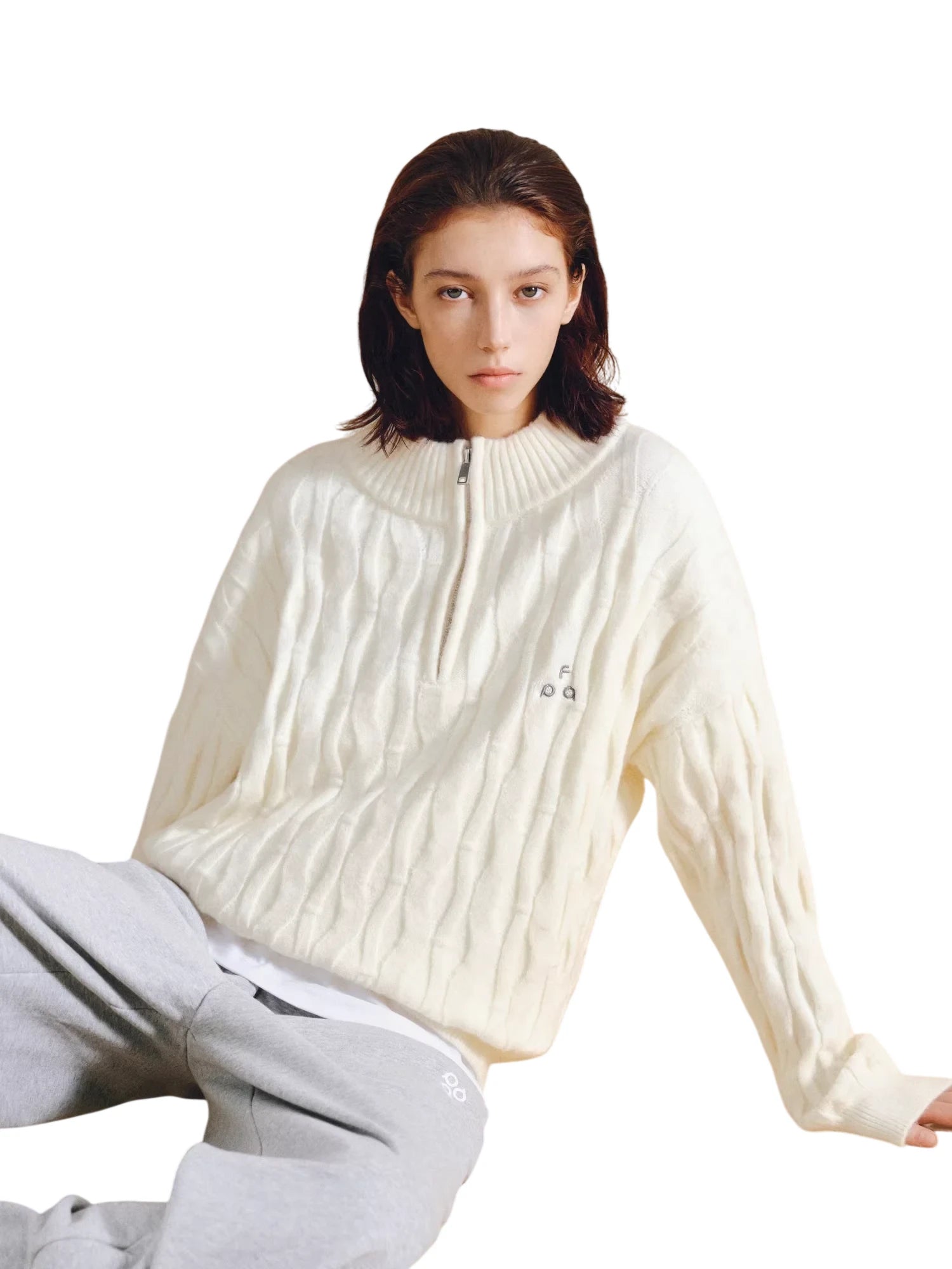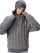 Stay cozy and stylish with this women's cream-colored pullover sweater, crafted with a soft twisted cable knit design. Featuring a half-zip mock neck, ribbed cuffs, collar, and hem, this sweater offers a relaxed fit perfect for cooler autumn days. A subtle embroidered detail on the chest adds a touch of minimalistic charm, making it ideal for casual, everyday wear.