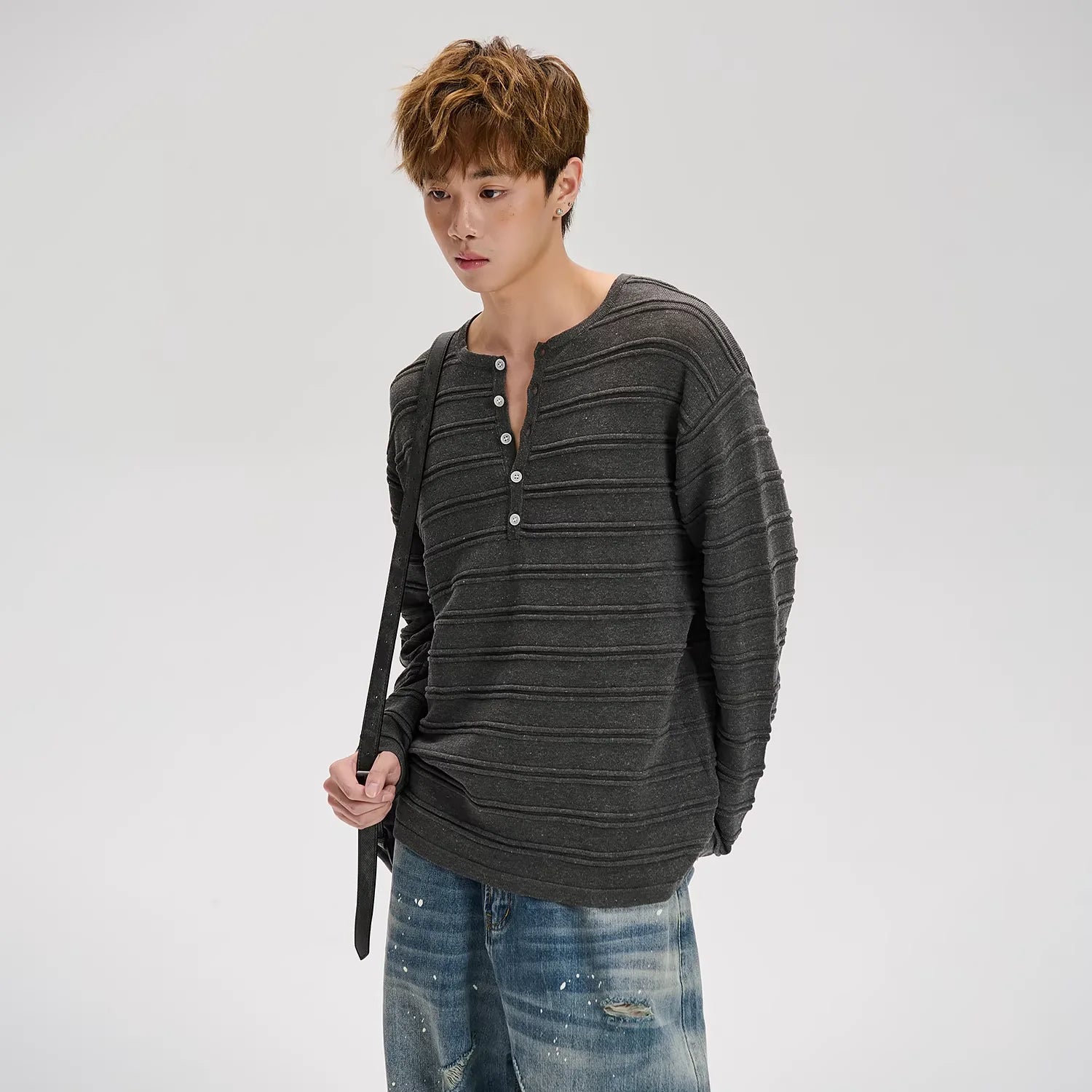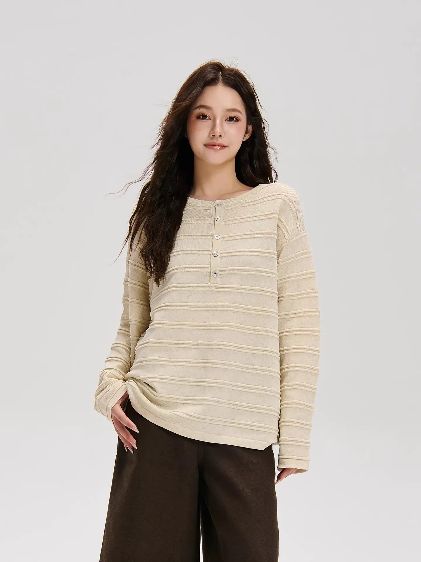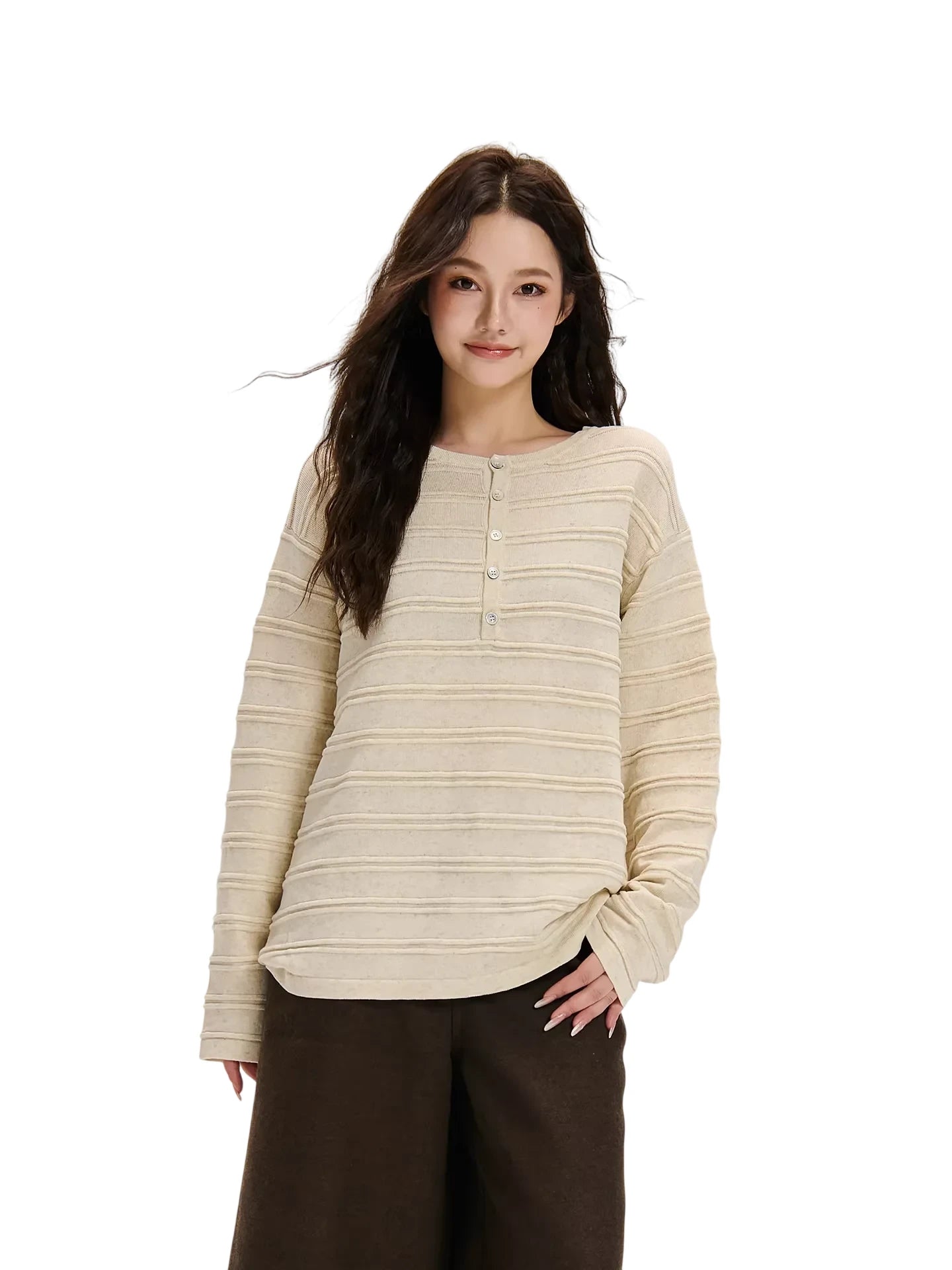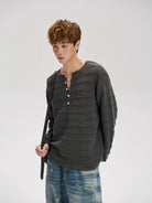 Embrace effortless style with this retro-inspired Henley shirt, designed for both men and women. Featuring a horizontal striped pattern and a comfy, textured knit feel, this button-down long sleeve top offers a loose, casual drape ideal for autumn wear. Pair it with anything from jeans to shorts for a laid-back, timeless look.
