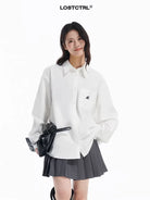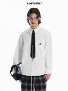 This unisex white shirt features a classic button-up design with a pointed collar, perfect for both spring and autumn wear. A minimalist black embroidered logo on the chest pocket adds a stylish, modern touch. Designed for comfort and versatility, it is ideal for creating a relaxed yet professional look. Styled here by a female model, it pairs effortlessly with accessories like ties or chain details for an edgy fashion statement.