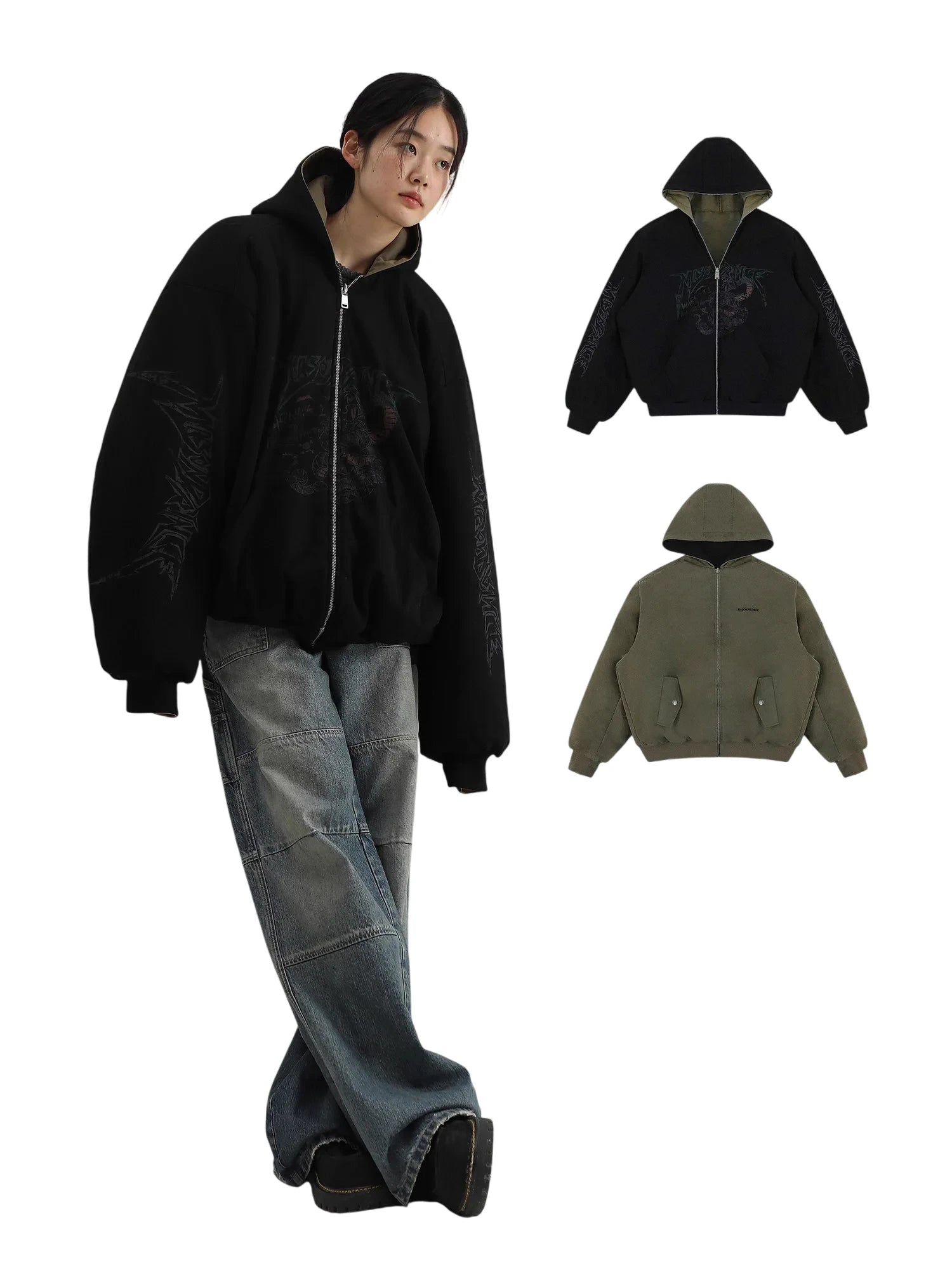 The standout feature is its reversible design—one side showcases bold printed graphics while the other offers a solid color for a more classic look. Its comfortable oversized fit makes it suitable for women or unisex wear.