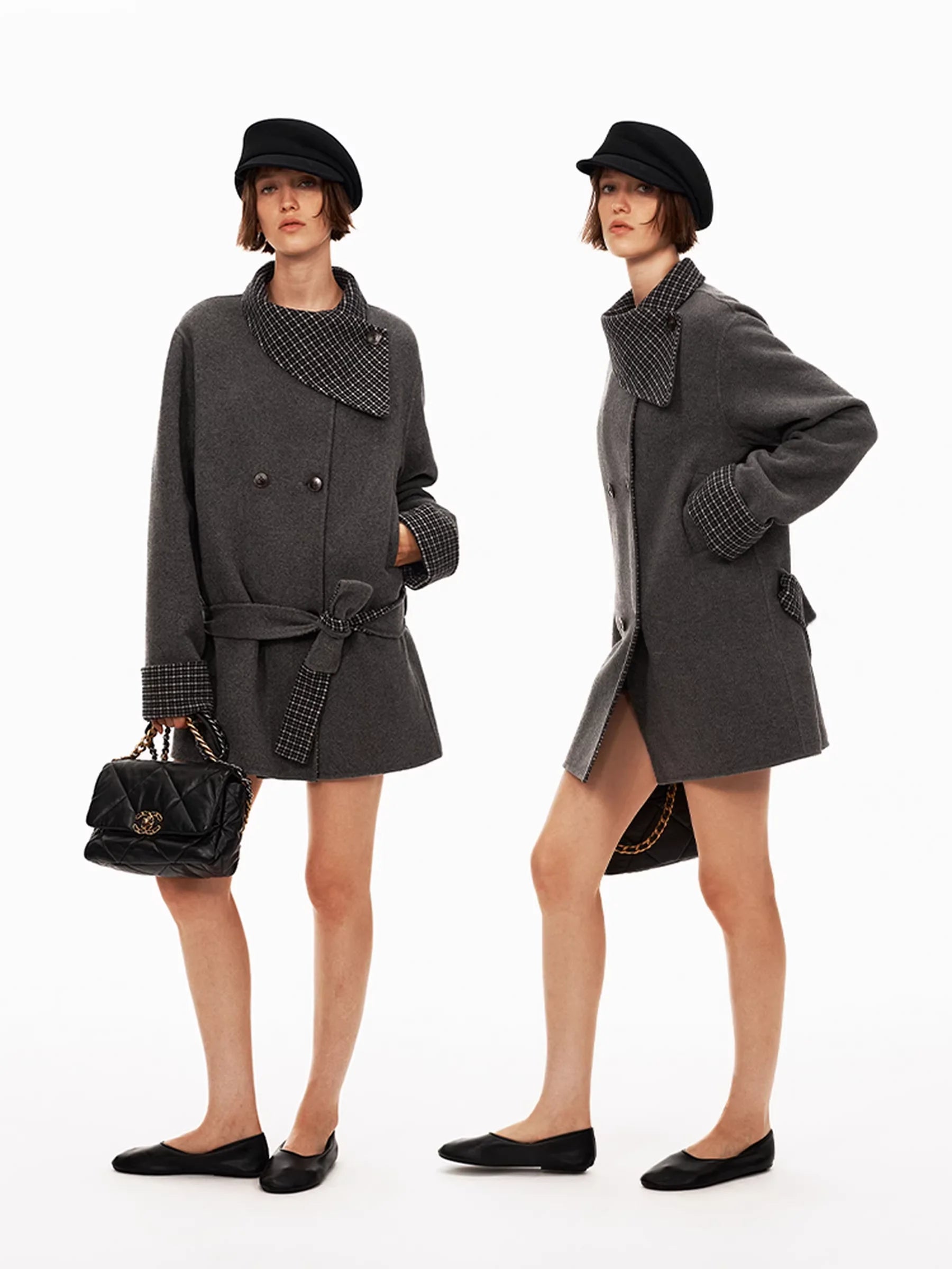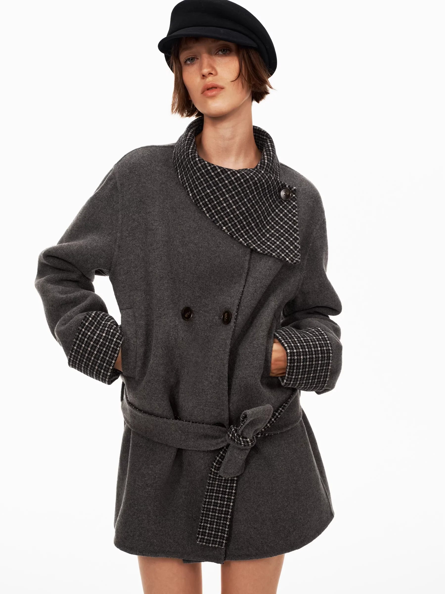 Elevate your autumn and winter wardrobe with this women's double-sided wool coat, crafted with 45% Merino wool for premium warmth and softness. Designed in a classic peacoat silhouette, it features a stylish scarf collar, oversized lapels, and turned-up cuffs with a contrasting black-and-white checkered lining. The coat includes a double-breasted front and a matching fabric belt to cinch the waist for a flattering fit. A perfect blend of vintage elegance and contemporary style, this coat is ideal for cold-weather layering.