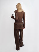 This women's ribbed turtleneck sweater is crafted from a luxurious alpaca blend, offering both warmth and softness. It features a fitted silhouette with rich texture in a classic ribbed knit design. The earthy brown color adds a timeless, elegant touch, making it a versatile piece for cooler seasons.