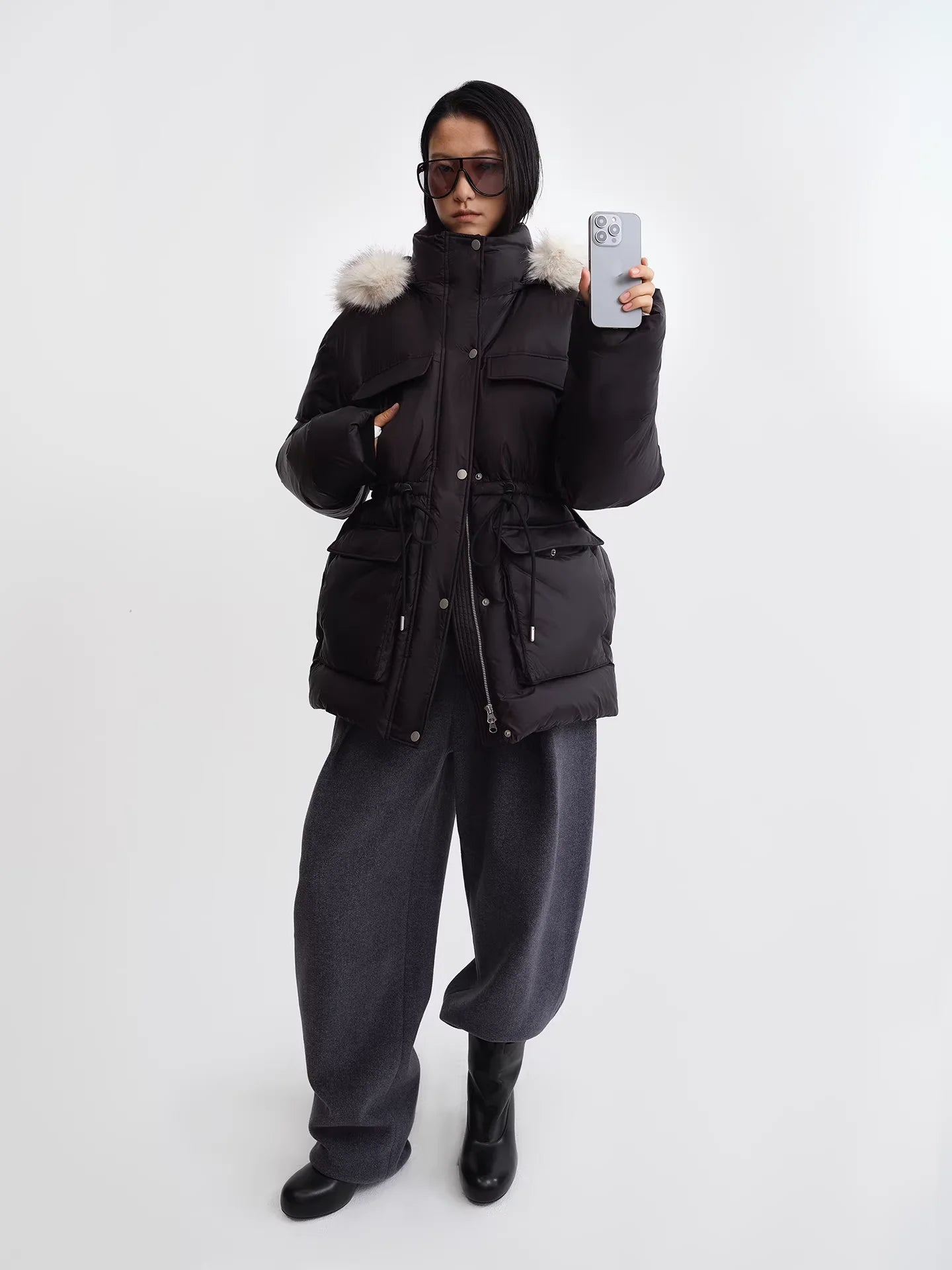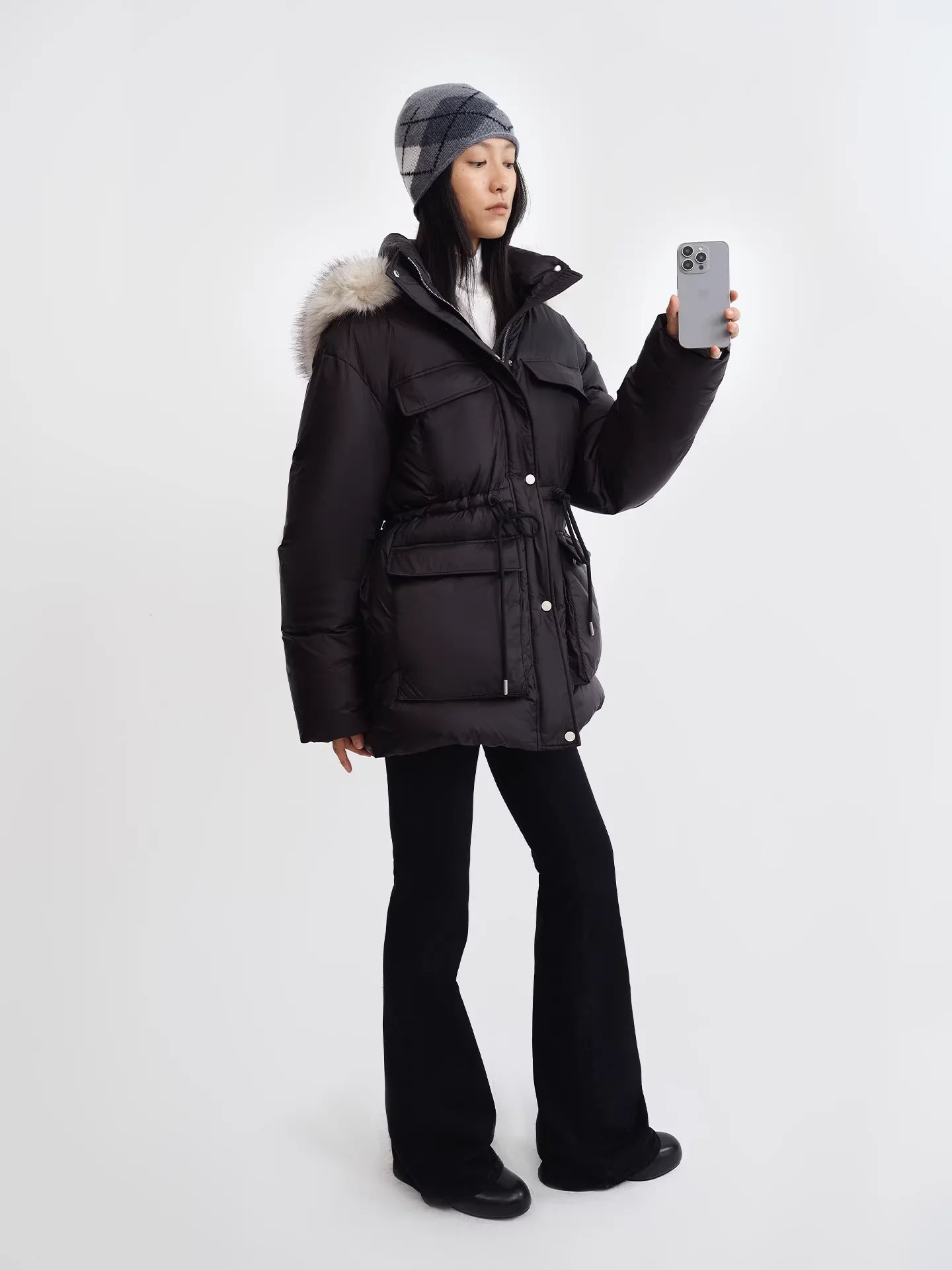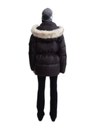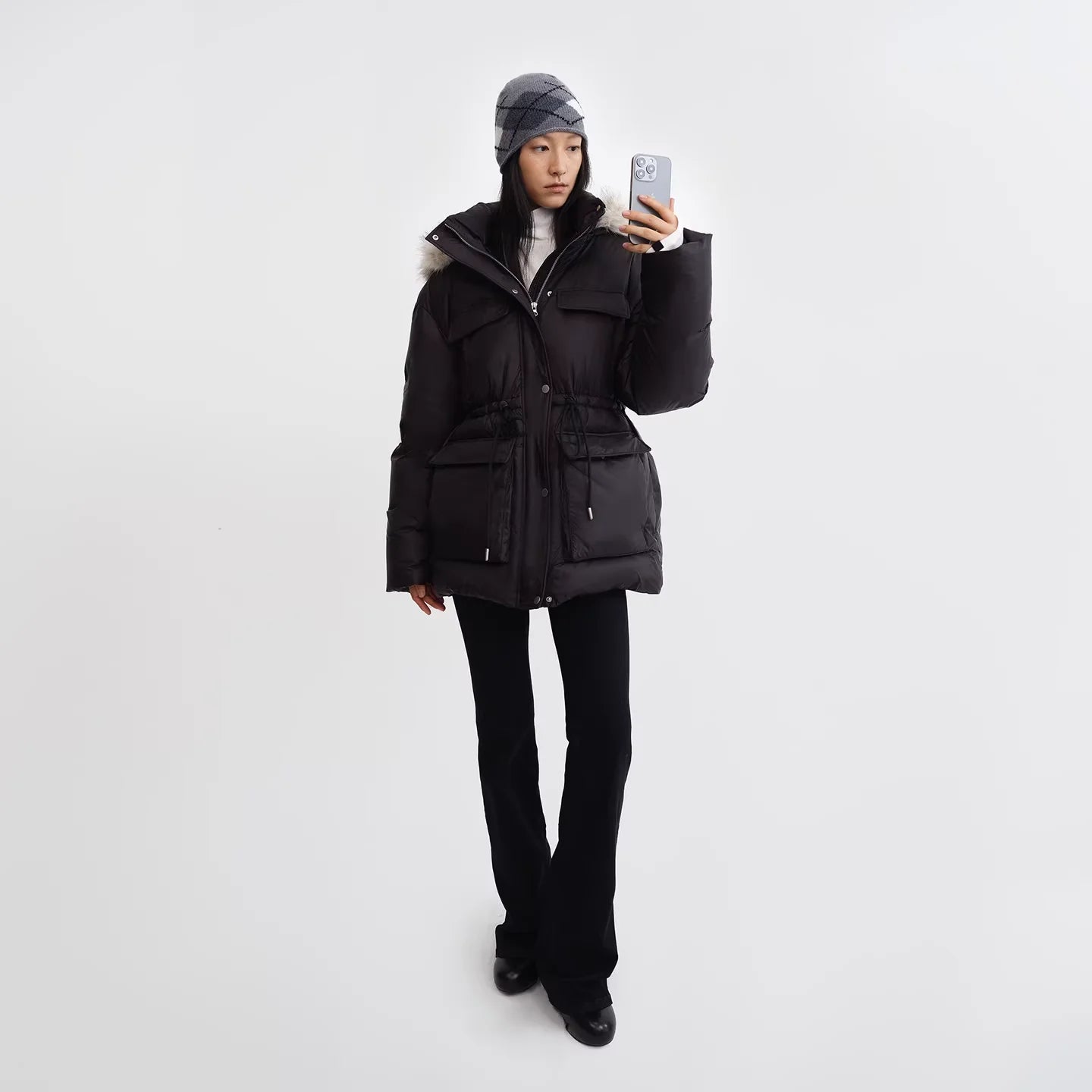 This women's mid-length down jacket features a sleek black design with a cinched waist for a flattering silhouette. The jacket includes a detachable hood adorned with soft fur trim for added warmth and style. Functional details such as flap and zipper utility pockets provide practicality and a modern touch. Layered over a white high-neck top, this cold-weather essential pairs effortlessly with fitted pants and accessories for a versatile winter look.