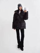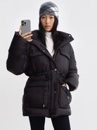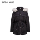 RARELY ALIKE Women's Black Waist-Cinched Mid-Length Down Jacket with Detachable Hood