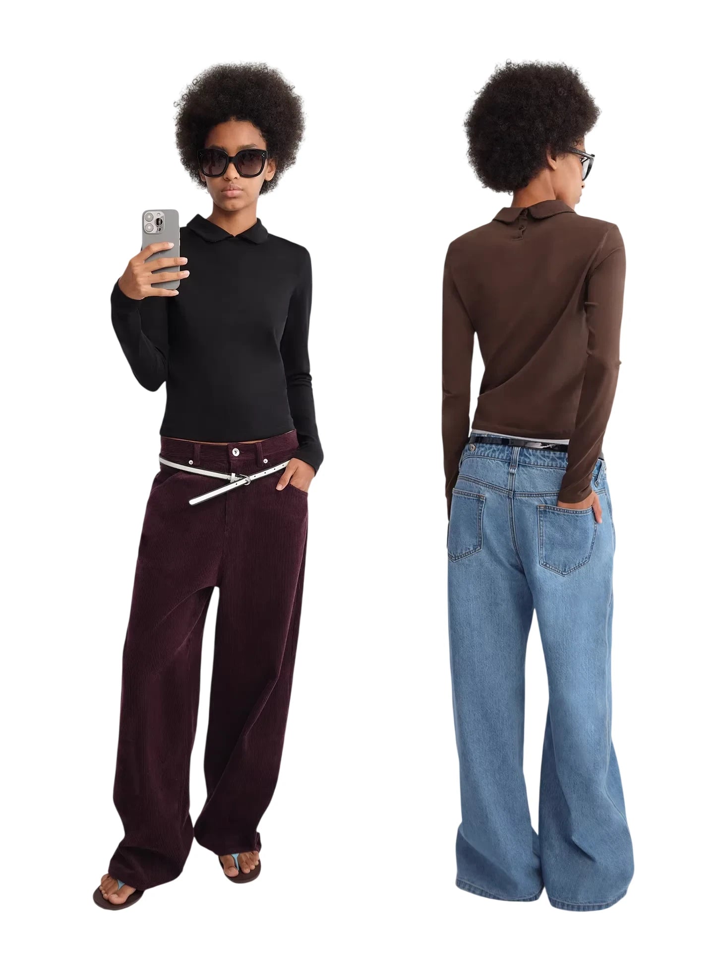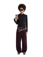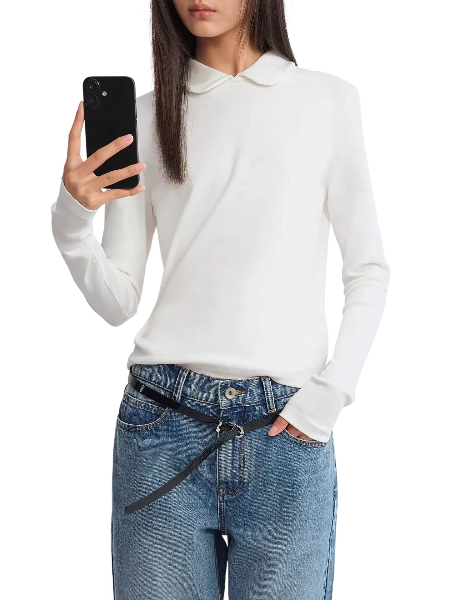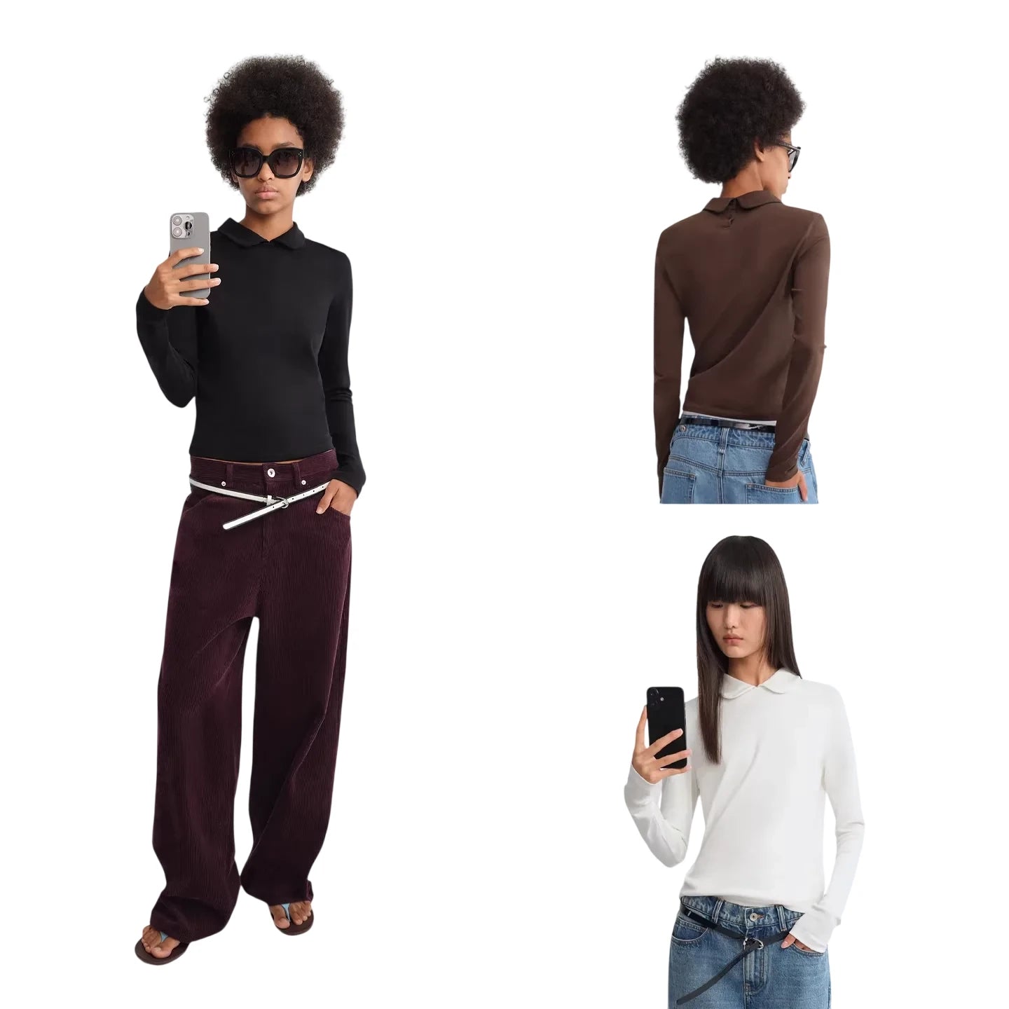This women's long sleeve knit polo top features a classic fold-down collar and a flattering fitted silhouette. Available in white, black, and brown, each color variation offers versatile styling options for casual or polished outfits. Perfect for layering or wearing on its own, this timeless piece combines comfort with minimalist style for everyday wear.