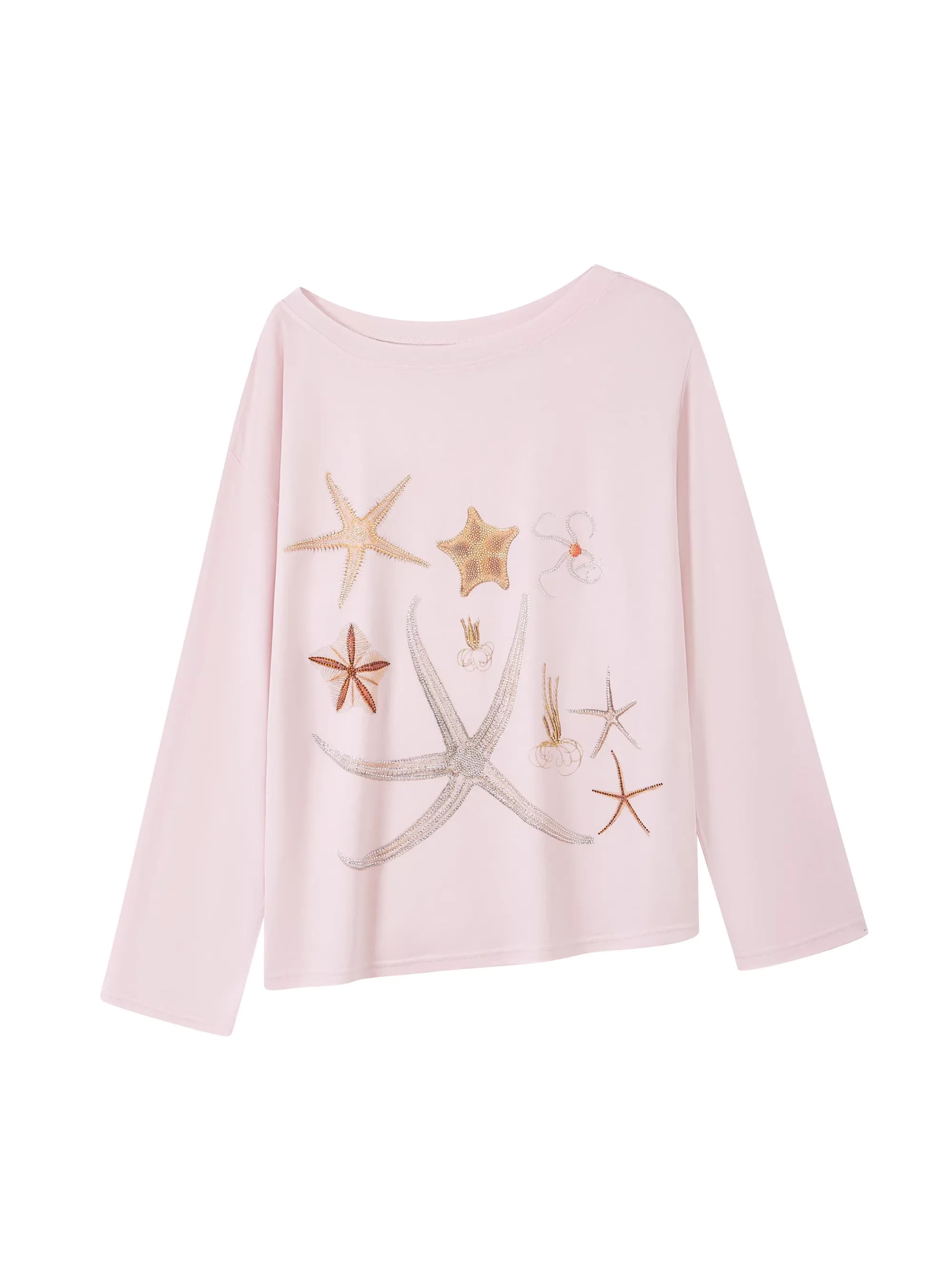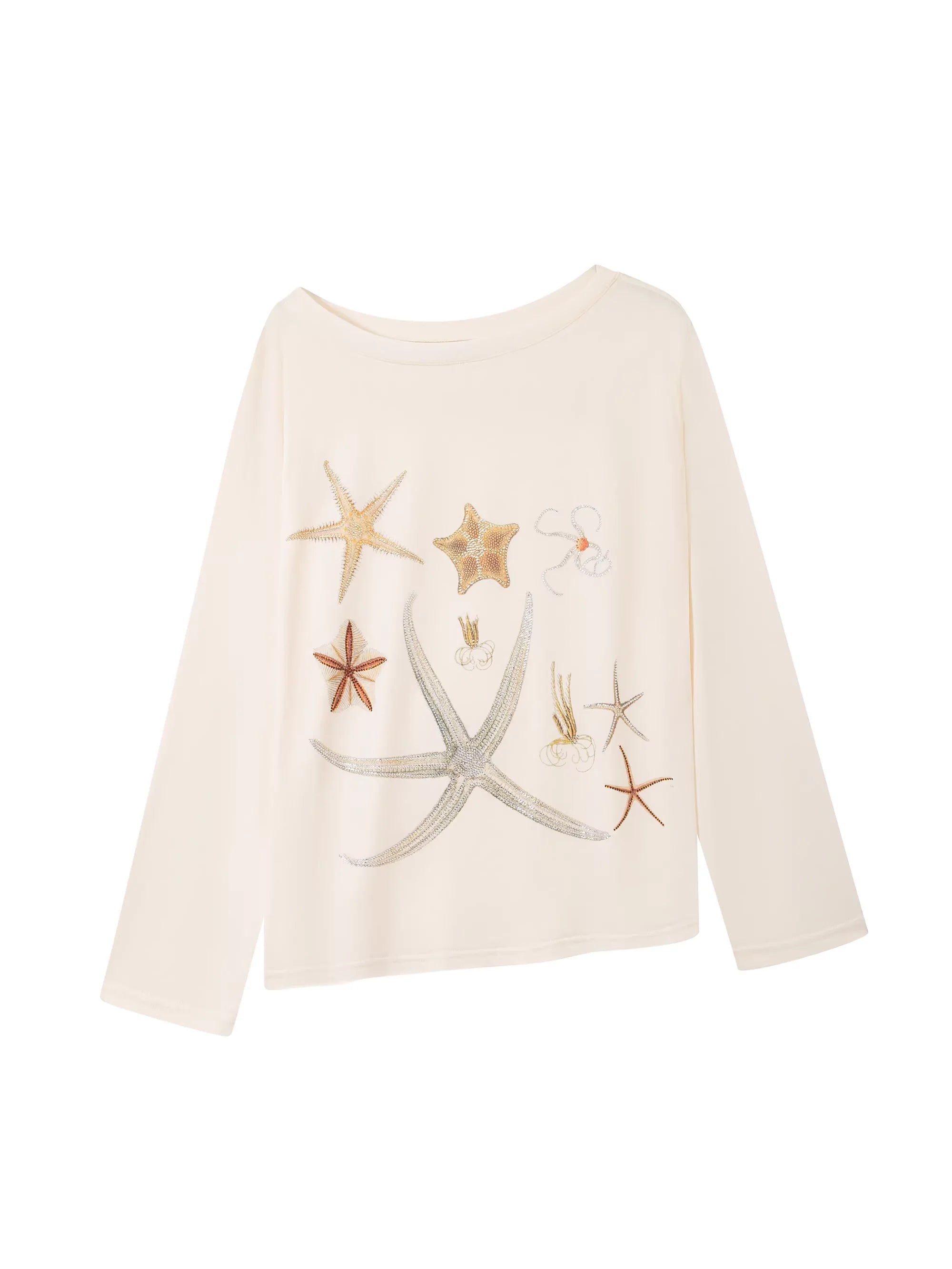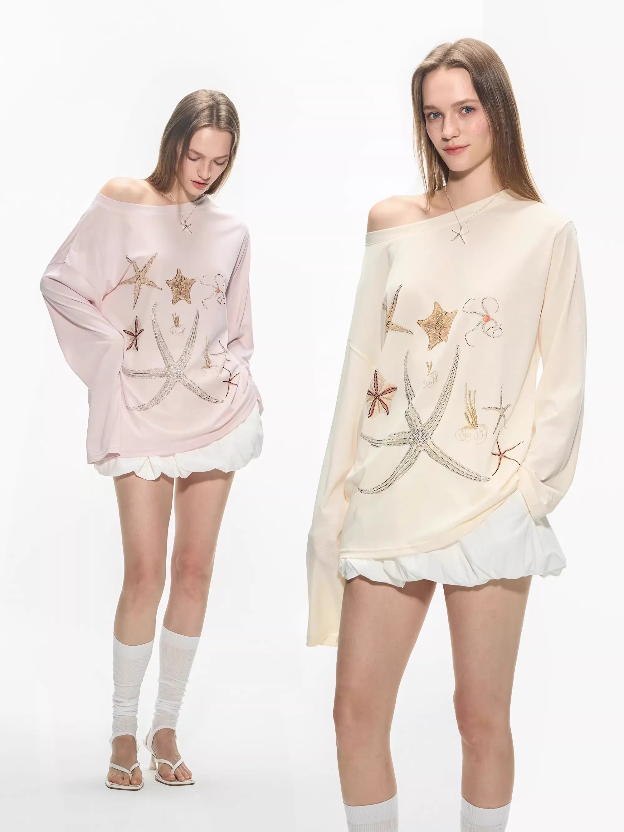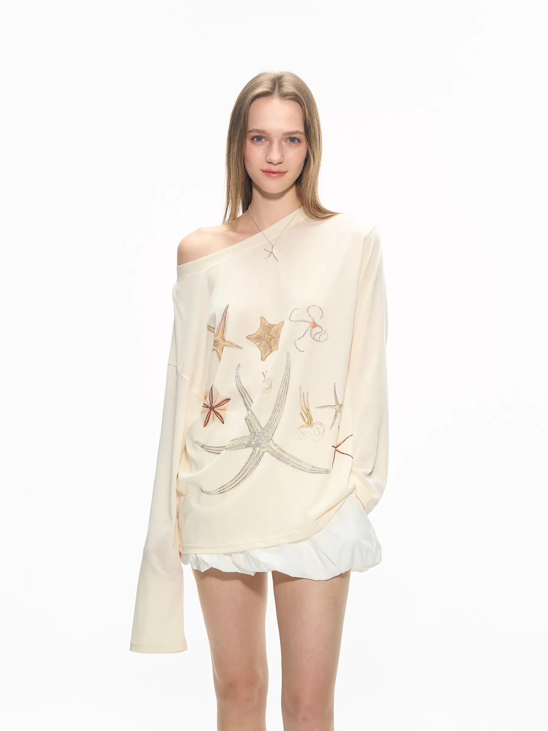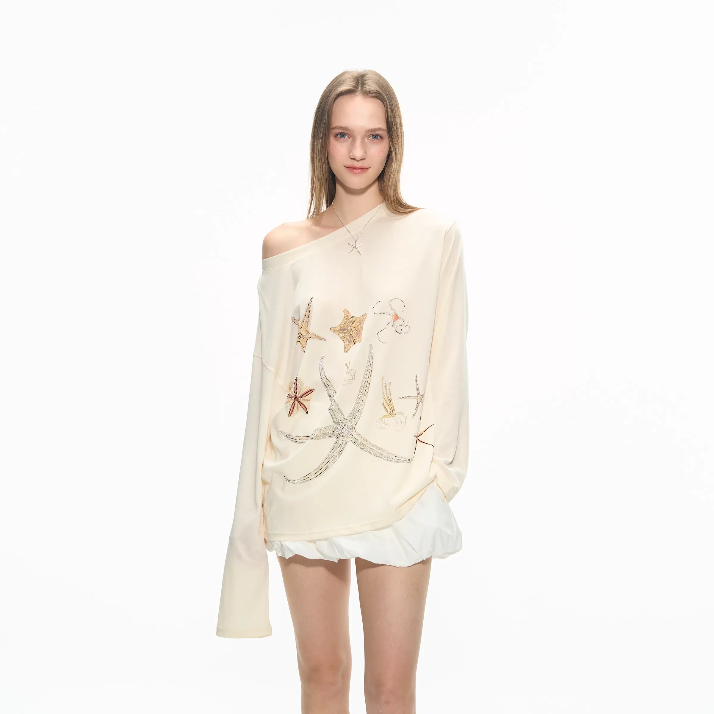 This women's long sleeve t-shirt features an asymmetrical off-shoulder neckline, offering a relaxed and stylish fit ideal for summer. Made in a cream tone, it's adorned with intricate starfish and seashell appliques in metallic and pastel hues, giving it a distinctive seaside charm. The extended sleeves and lightweight fabric provide both sun protection and breezy comfort, making it perfect as a beach cover-up or a casual statement piece for warmer days.