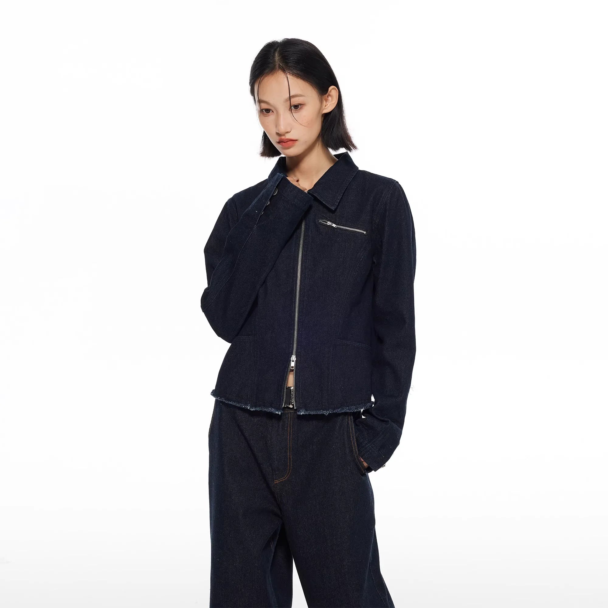 Elevate your casual wardrobe with this women's slim fit denim jacket, designed for both versatility and bold styling. Crafted in dark indigo raw denim, this jacket features a double zipper front and two horizontal zippered chest pockets for a modern edge. The pointed collar and raw, unfinished hem add distinctive touches, while the tailored silhouette enhances your shape. Perfect for commuting or everyday wear, this piece pairs effortlessly with wide-leg jeans or layered over stylish undergarments for a statement look.