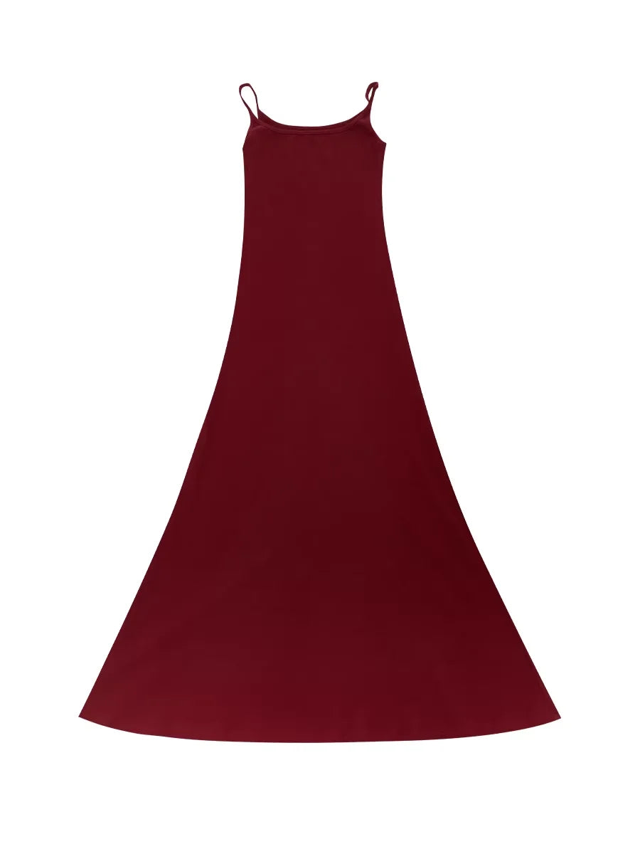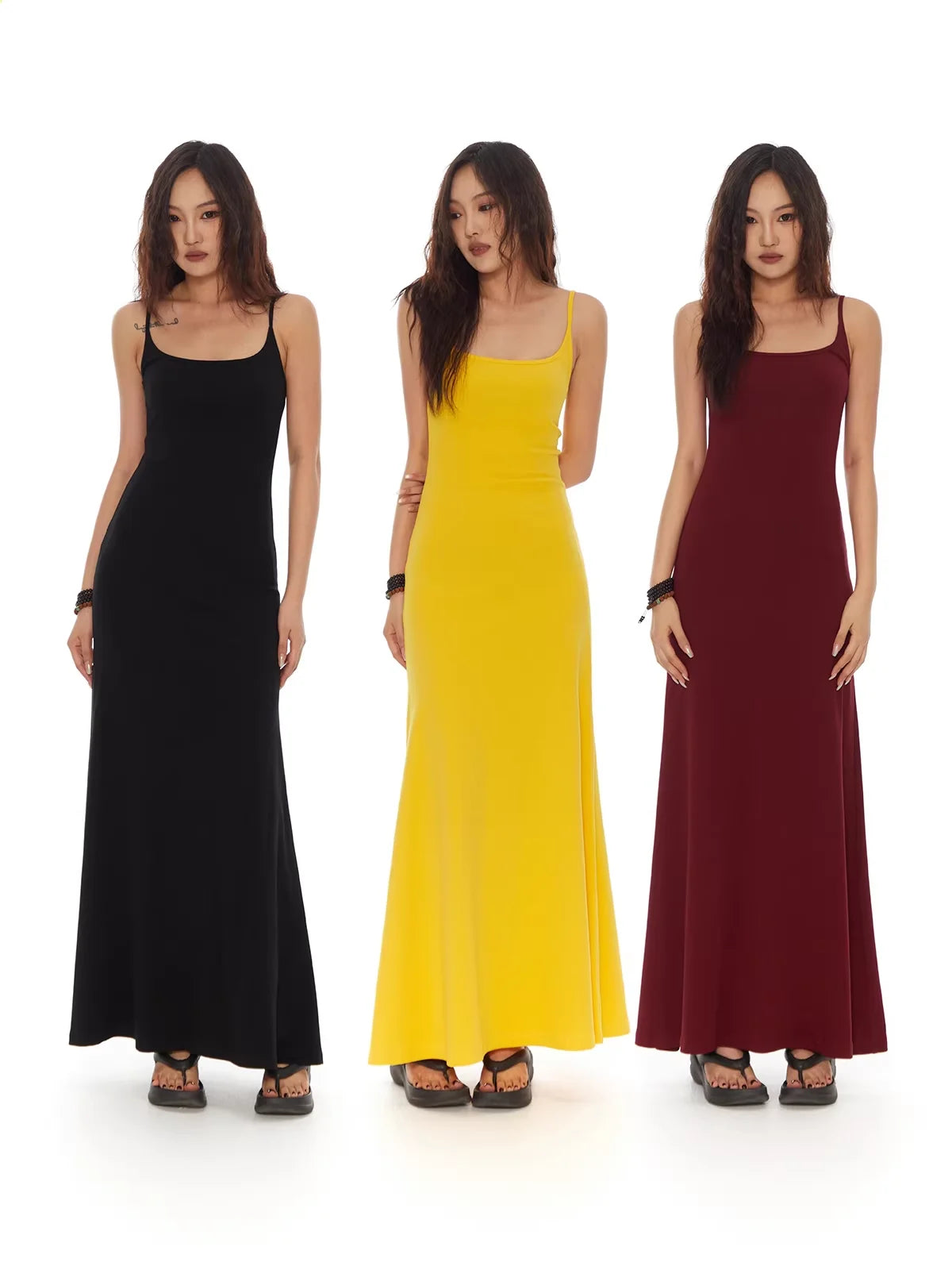 Elevate your summer wardrobe with this elegant and sexy spaghetti strap maxi dress for women. Designed with a slim fit silhouette, this dress features a fitted bodice, flattering scoop neckline, and delicate thin straps for a minimalist yet chic profile. Available in solid black, bright yellow, and deep maroon, the ankle-length design drapes gracefully, making it ideal for vacation wear or casual summer outings.