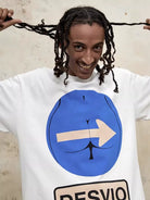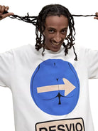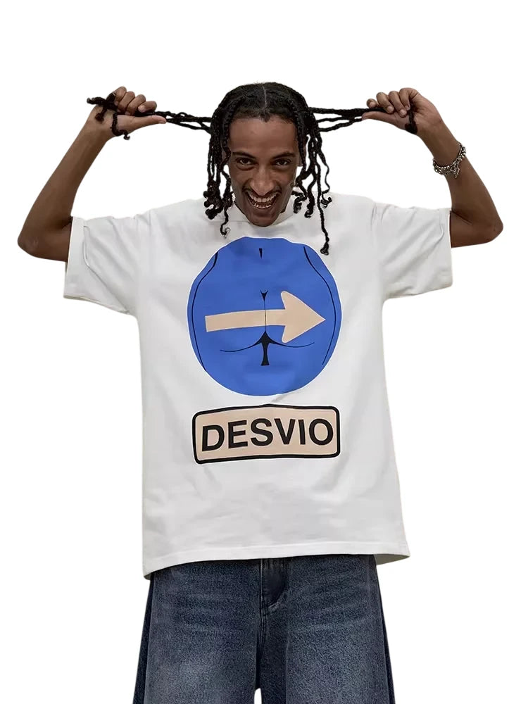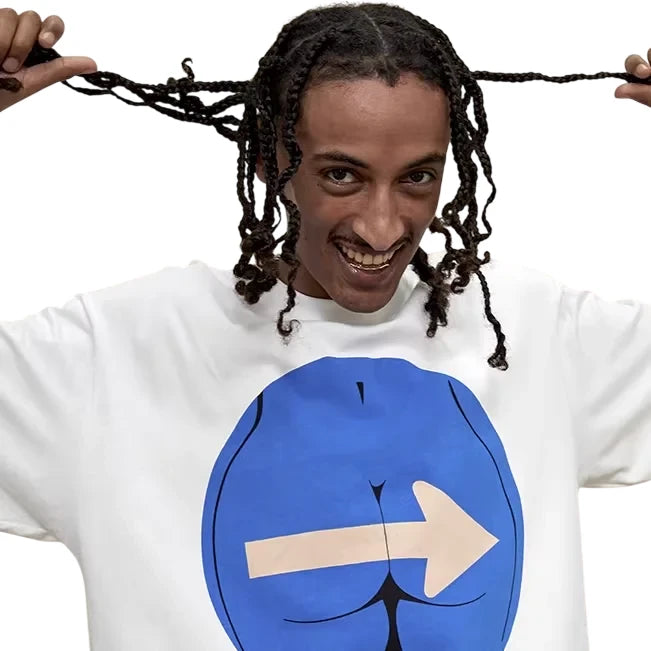 This men's casual T-shirt features a humorous road sign-inspired graphic, prominently displayed on the front. The playful print includes a large blue circle with stylized human buttocks and a bold right-pointing arrow, adding a fun and cheeky twist to your casual wardrobe. Crafted from soft cotton with a relaxed, loose fit, this short-sleeved tee offers comfort and style for everyday wear. Ideal for those who like to express their personality with a dose of humor.