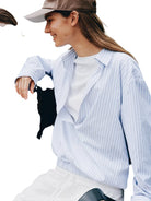 This women's shirt combines a relaxed vacation feel with modern style. Featuring a deep V-neck and a faux two-piece design, it showcases a layered look with pinstripes across a short, boxy silhouette. Ideal for casual outings, the lightweight fabric and loose fit emphasize comfort and ease. Pair it with shorts or trousers for an effortless, stylish ensemble.
