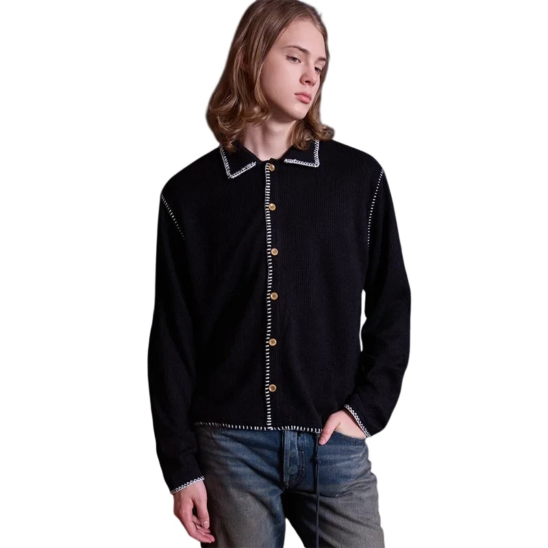 This men's textured knit cardigan features elegant hand-stitched detailing in a contrasting white thread along the collar, button placket, cuffs, and hemline. The standout wooden buttons add a rustic charm, blending tradition with contemporary style. Designed with a long-sleeve, button-up silhouette, this piece offers a comfortable and stylish layer for casual wardrobes.