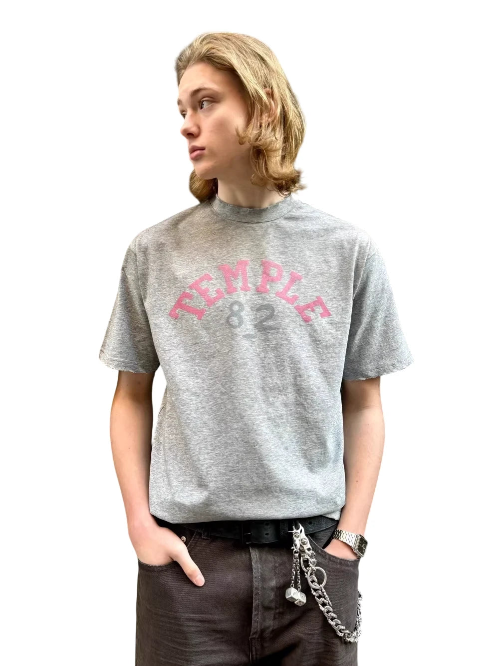 Elevate your casual look with this vintage-inspired slim fit t-shirt. Designed for men, it features short sleeves and a classic crew neckline. The cream-colored fabric is complemented by a weathered red 'TEMPLE' print across the chest, with a faded '82' below in grey, giving it an authentically distressed aesthetic. Perfect for pairing with jeans or corduroy pants, this tee adds effortless style to your everyday wardrobe.