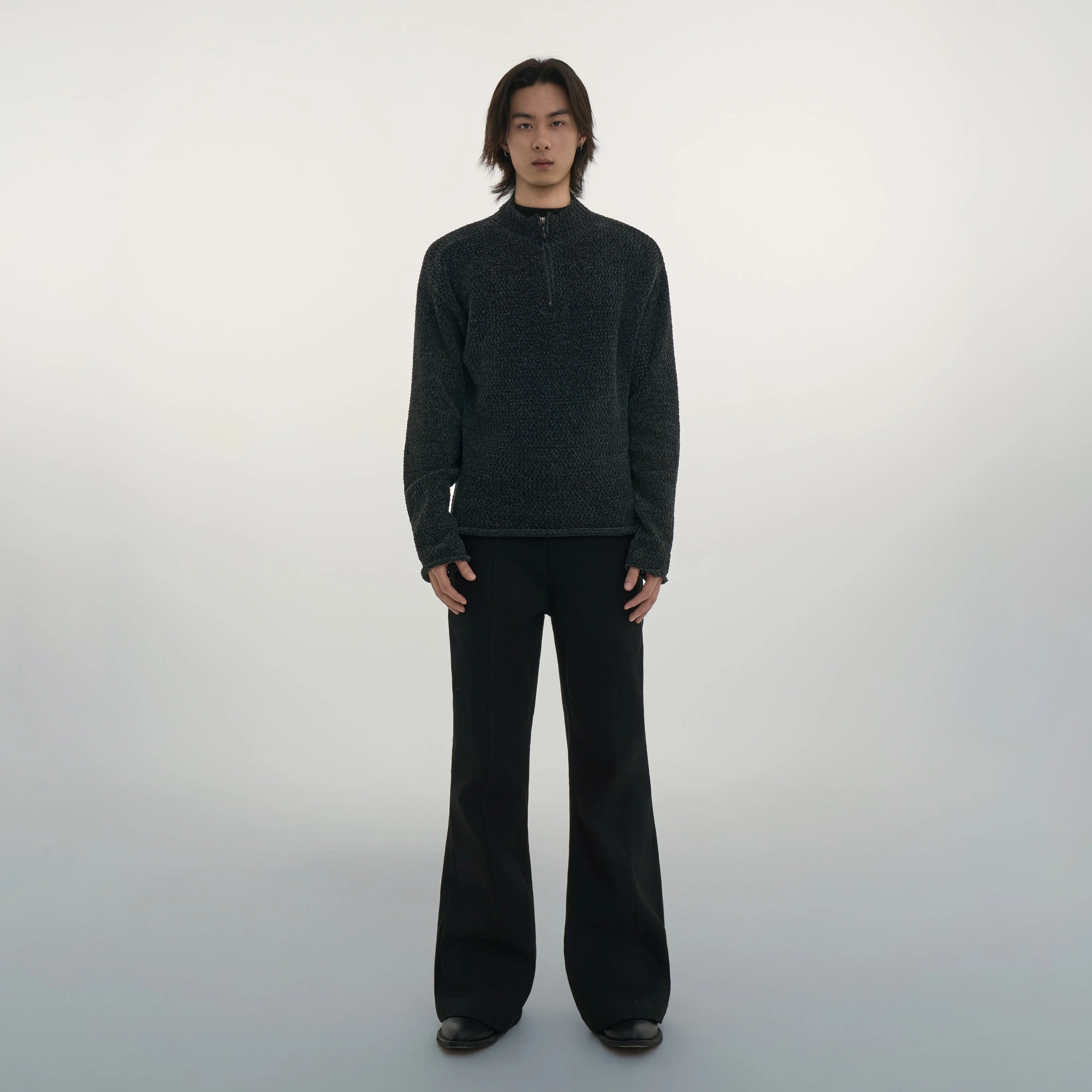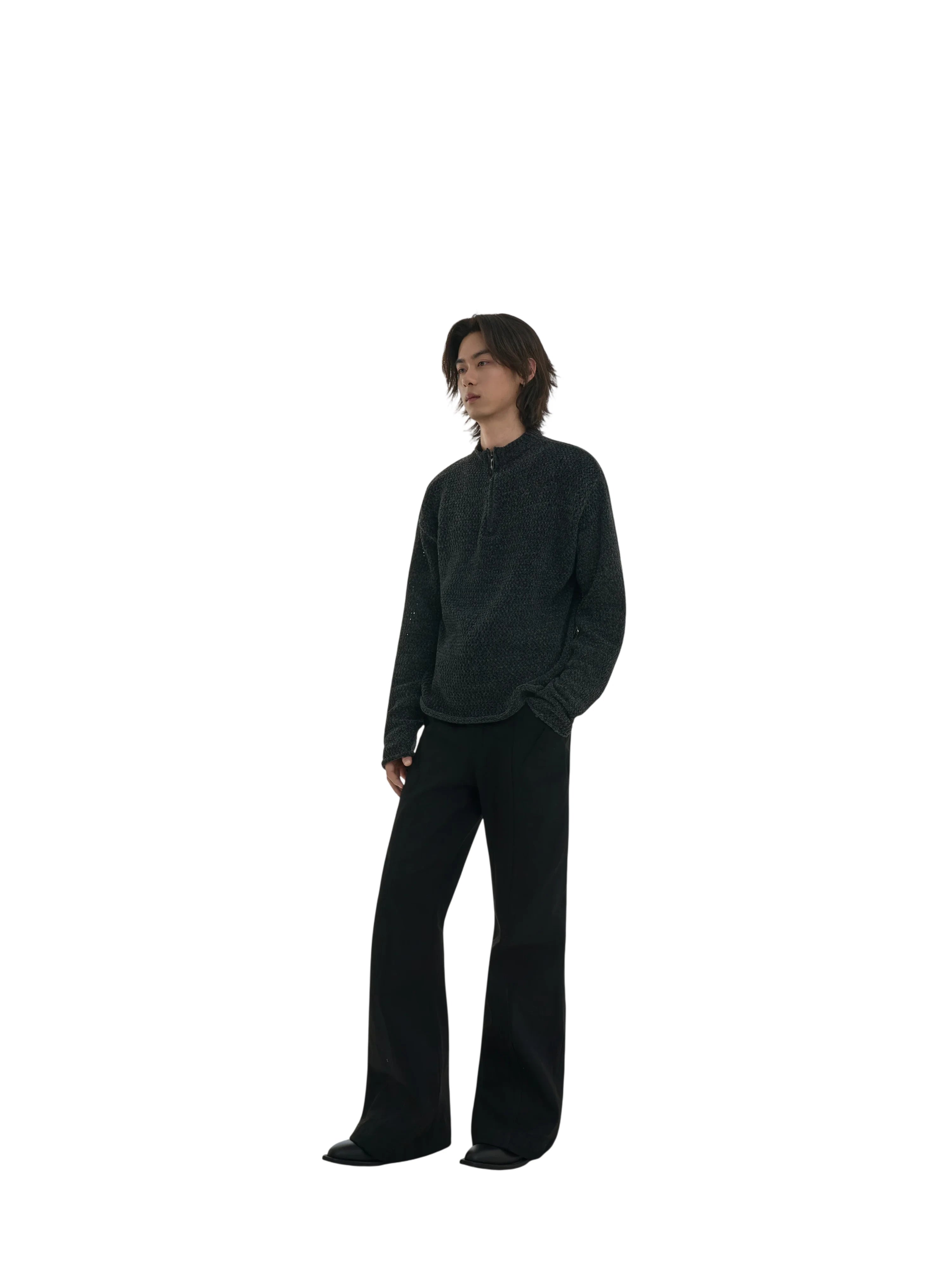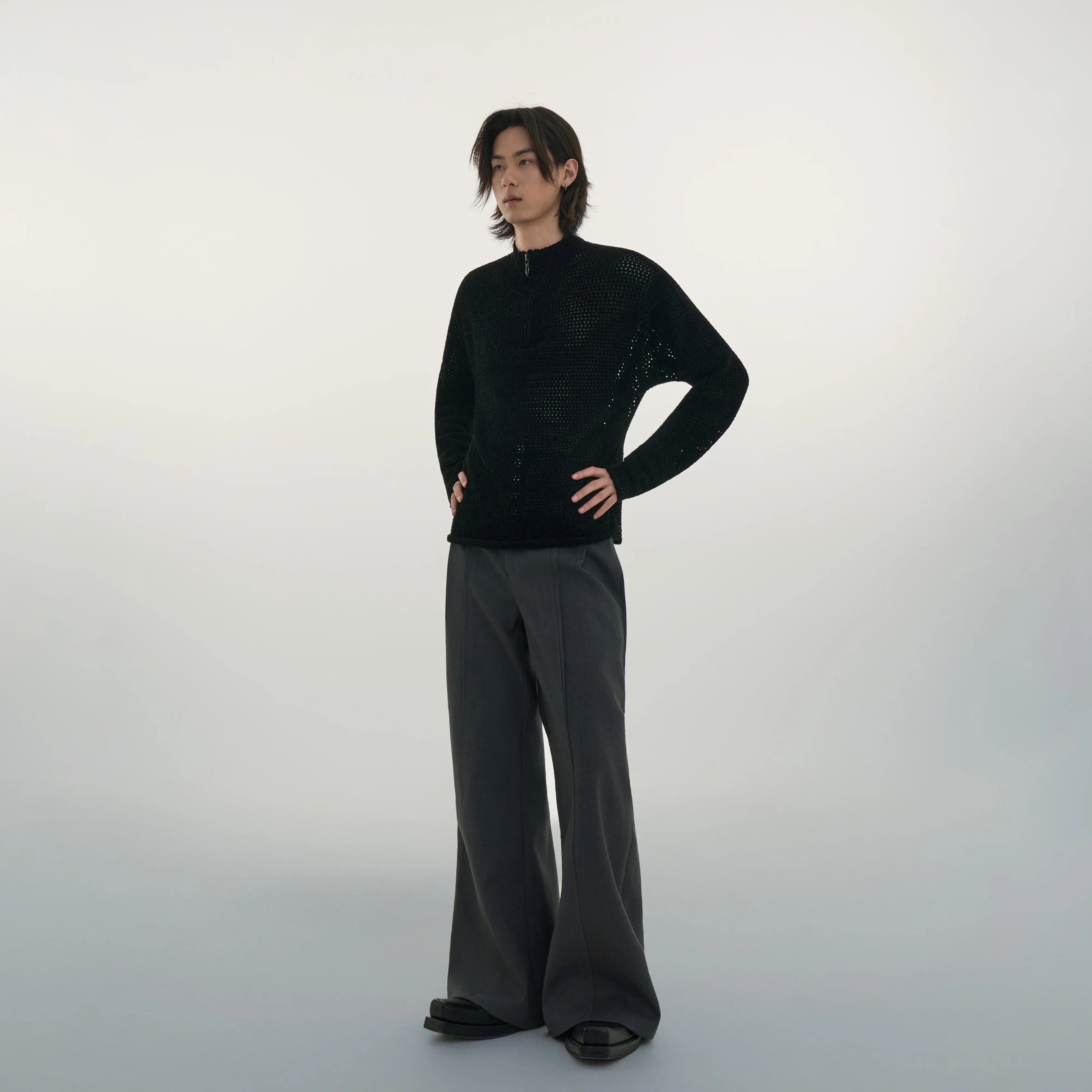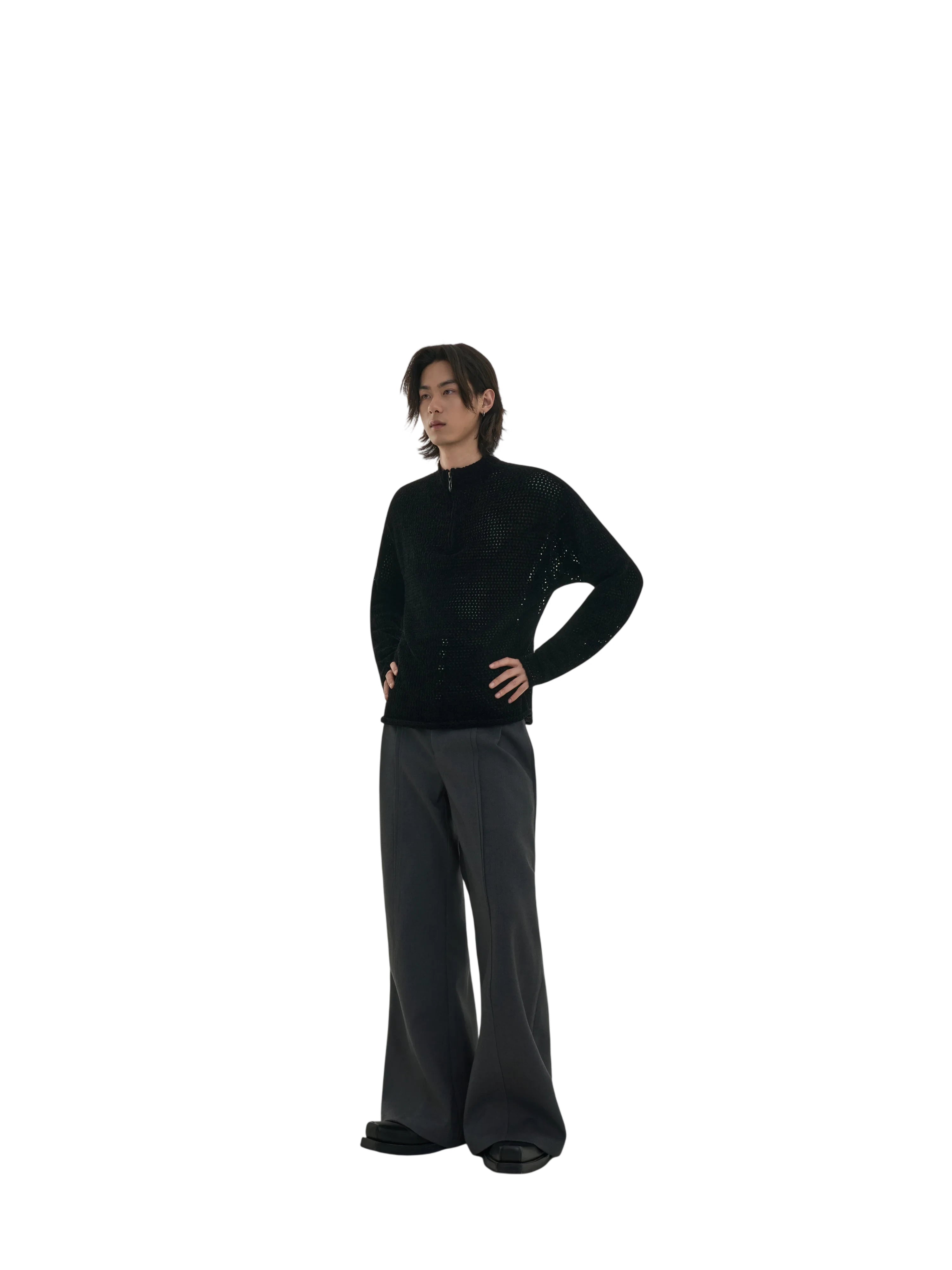 This men's pullover sweater blends rugged charm with contemporary style. Crafted from a textured, chainmail-inspired knit, it features a relaxed fit and intentional distressed detailing for a modern, worn-in look. The high collar and half-zip front enhance both comfort and utility, while the dark charcoal hue adds versatility to your wardrobe. Pair it effortlessly with wide-leg trousers or jeans for a casually elevated ensemble.