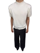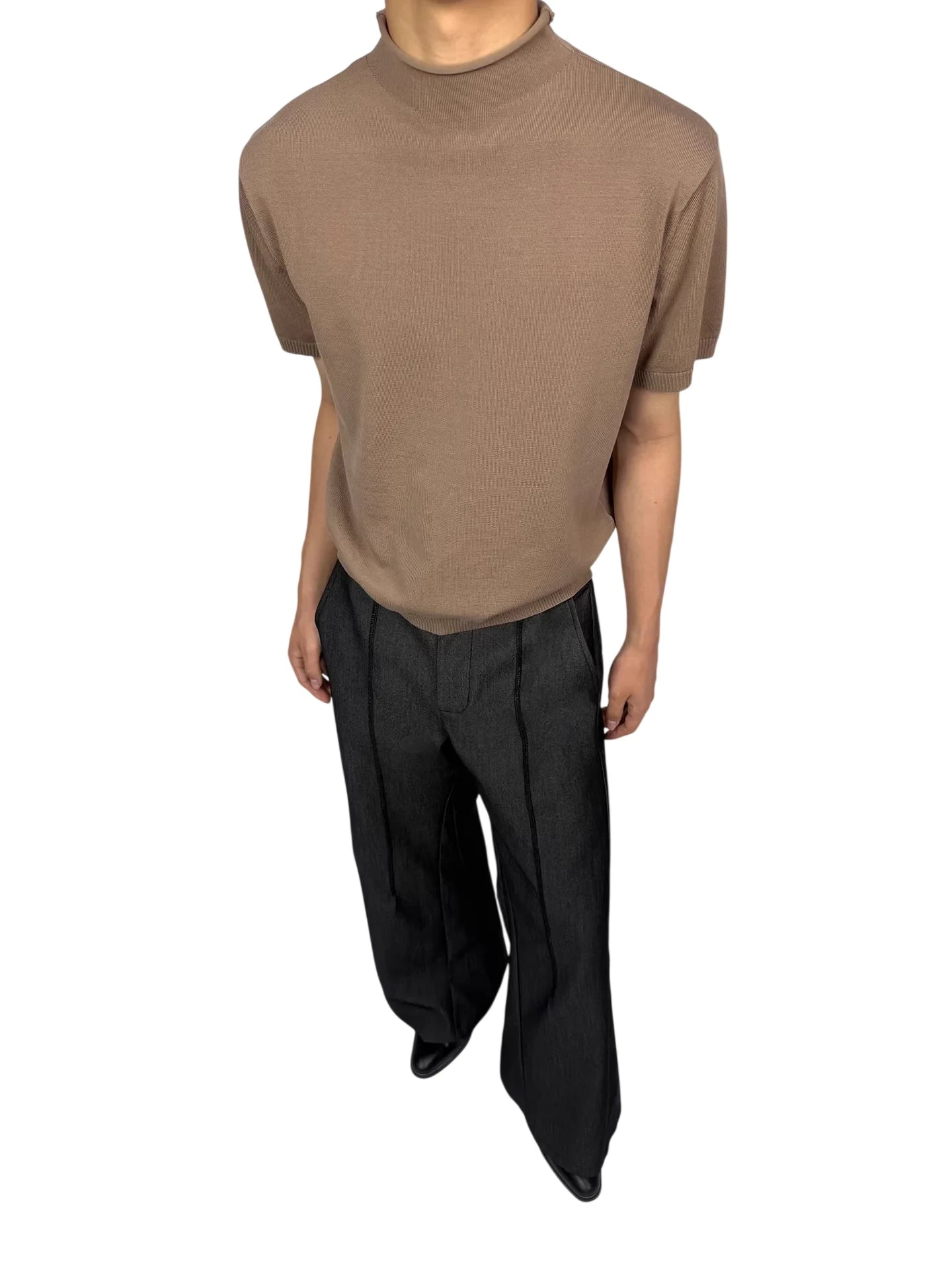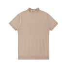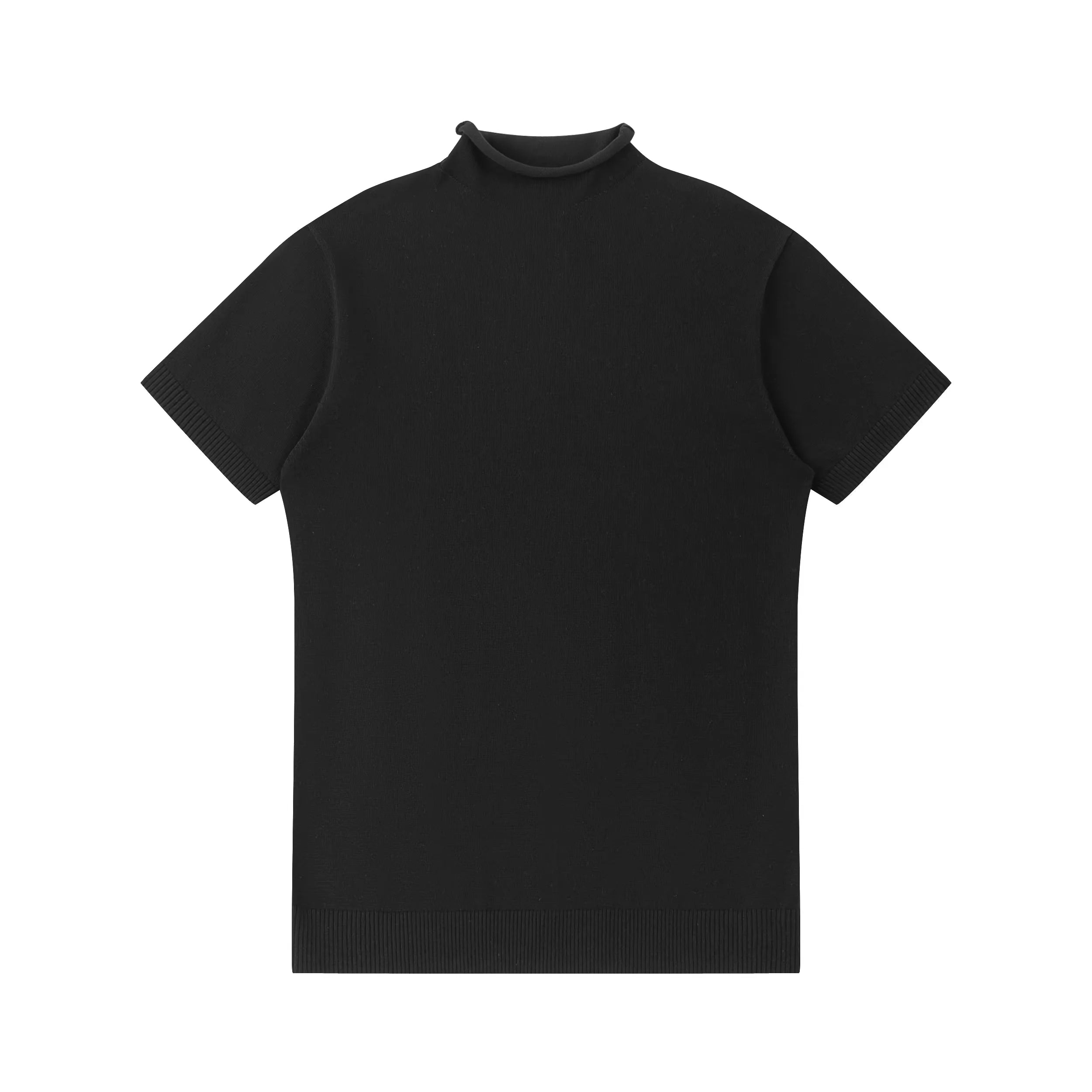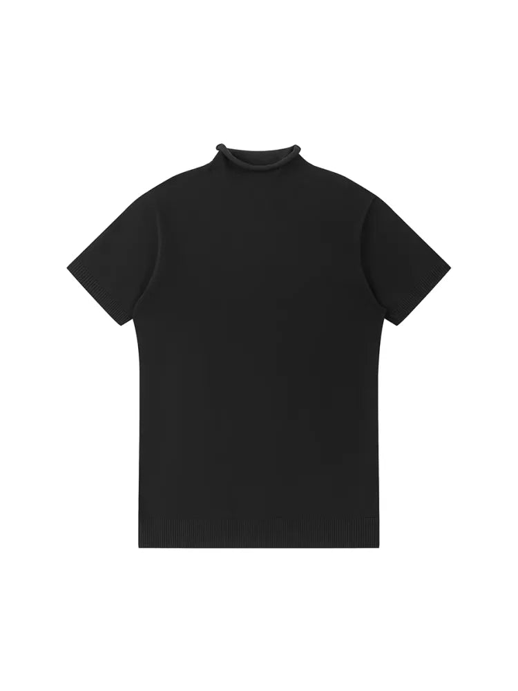 This women's short-sleeve knit top features a sleek, form-fitting silhouette crafted from a soft blend of Tencel and wool. Designed with a modern mock neck and subtle rolled edges, it offers a polished yet versatile look. Ribbed detailing at the sleeves and hem adds structure, making it ideal as a base layer or a standalone piece for both casual and semi-formal occasions.