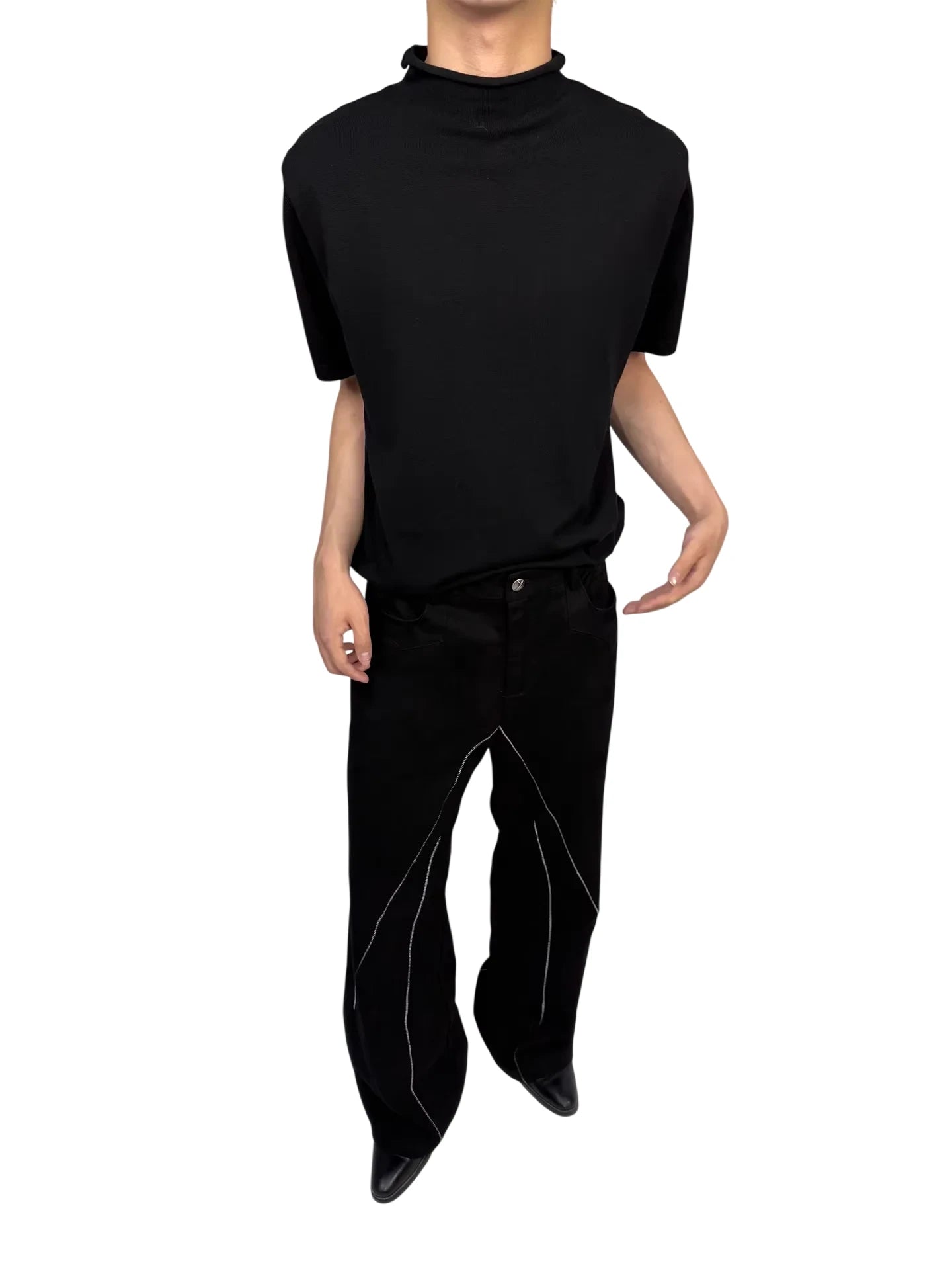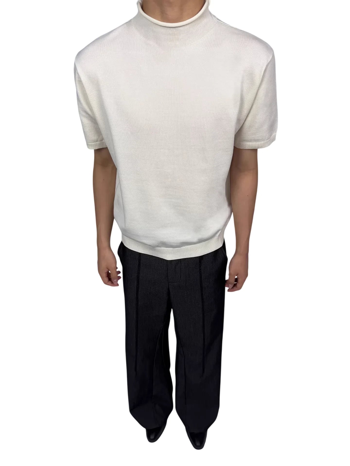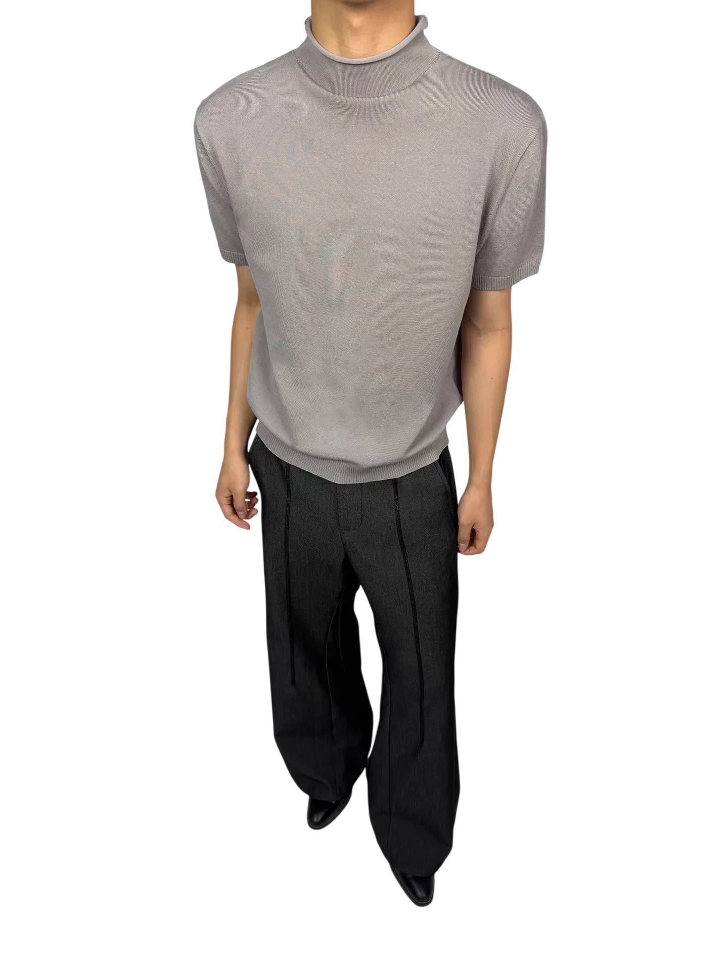 This women's short-sleeve knit top features a sleek, form-fitting silhouette crafted from a soft blend of Tencel and wool. Designed with a modern mock neck and subtle rolled edges, it offers a polished yet versatile look. Ribbed detailing at the sleeves and hem adds structure, making it ideal as a base layer or a standalone piece for both casual and semi-formal occasions.