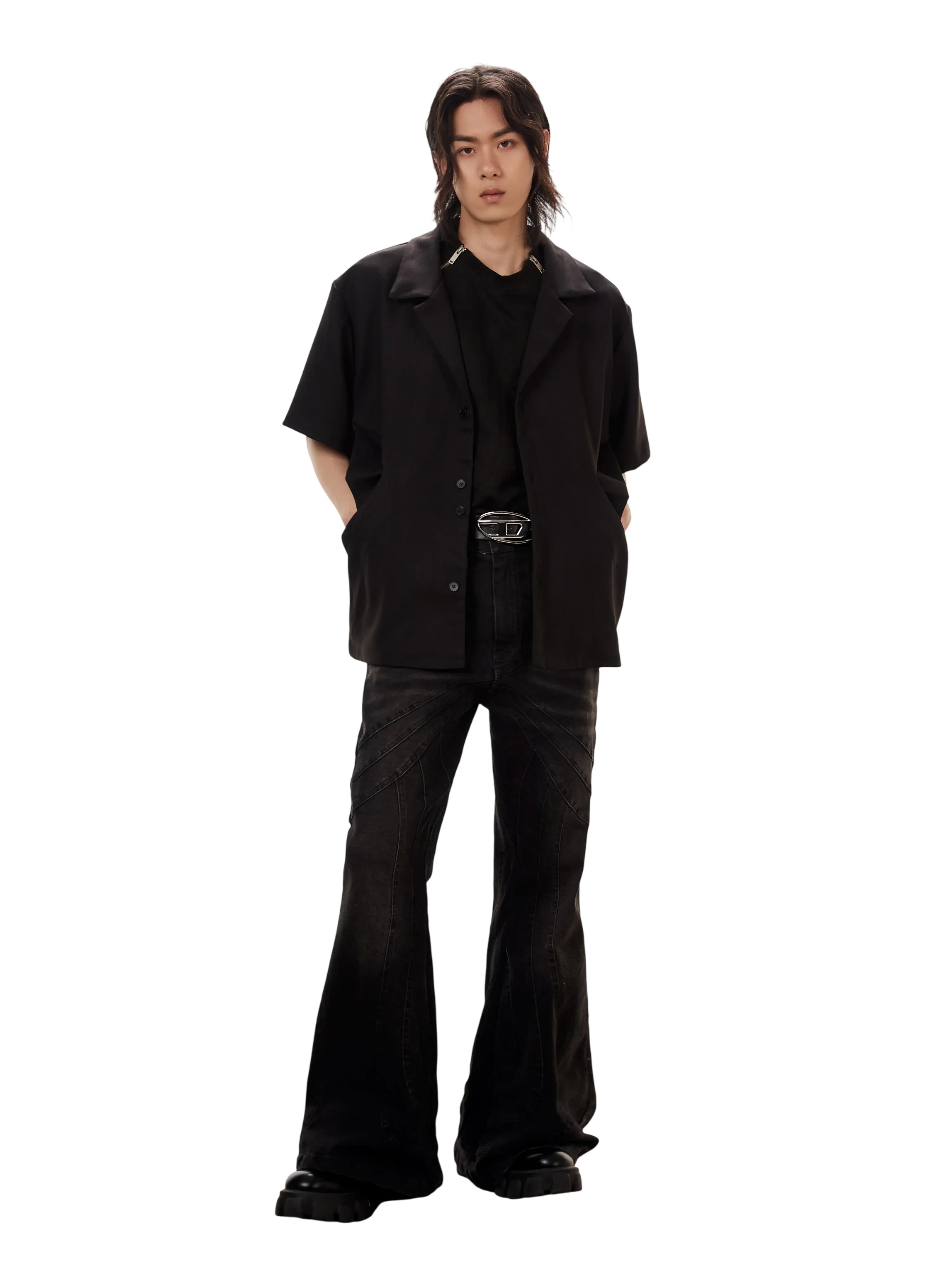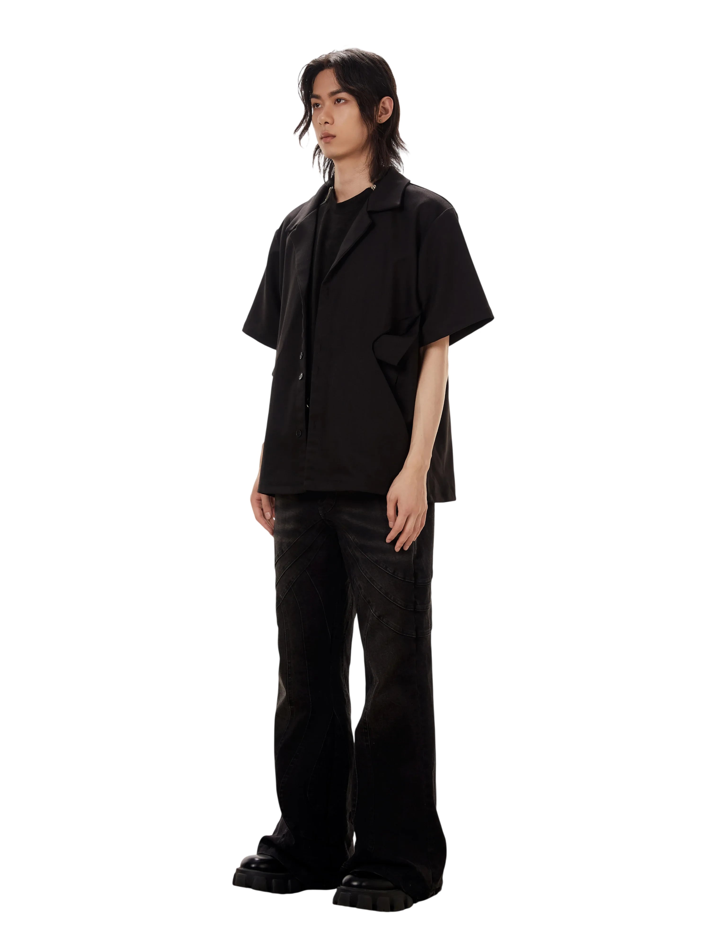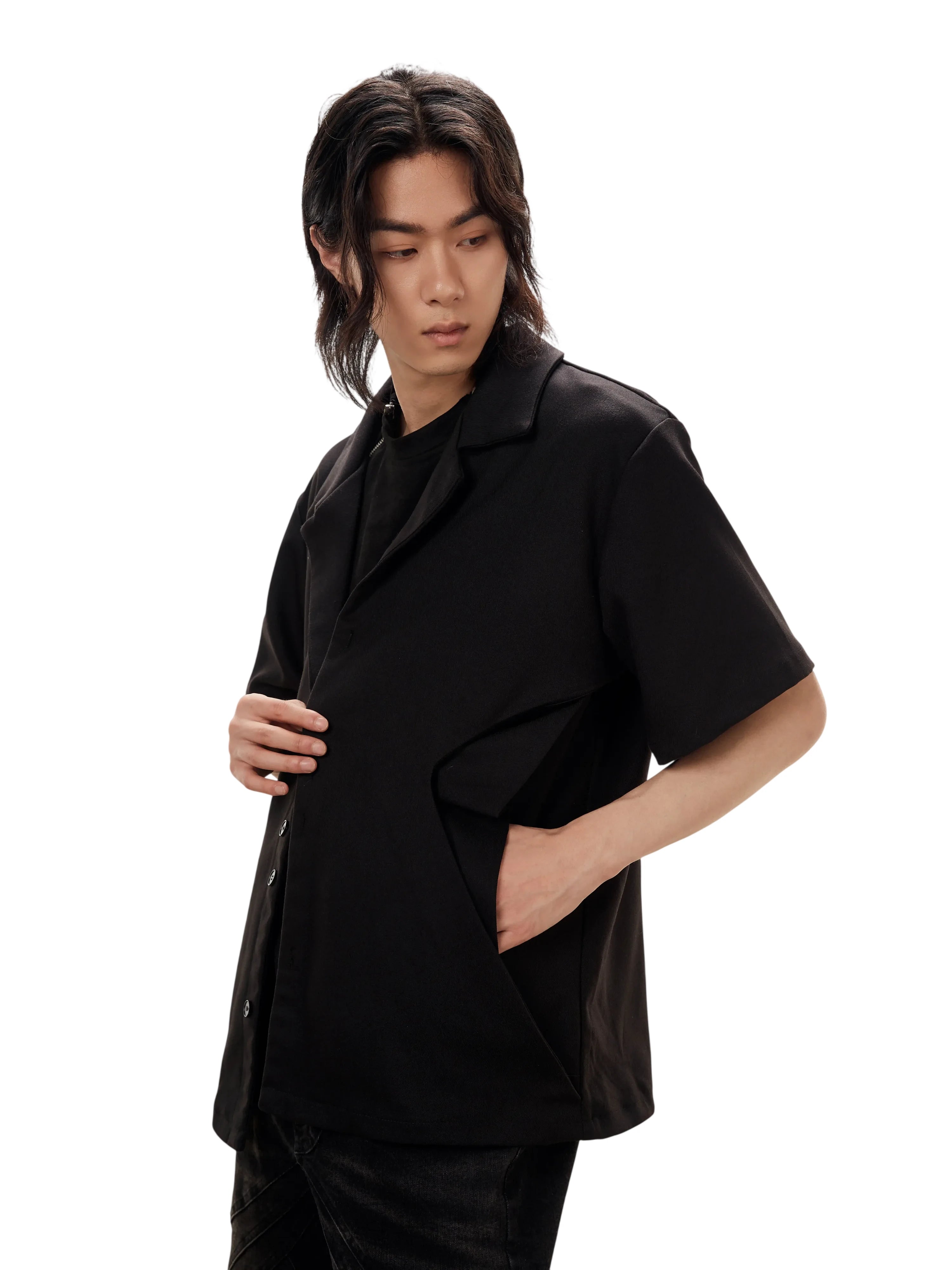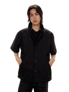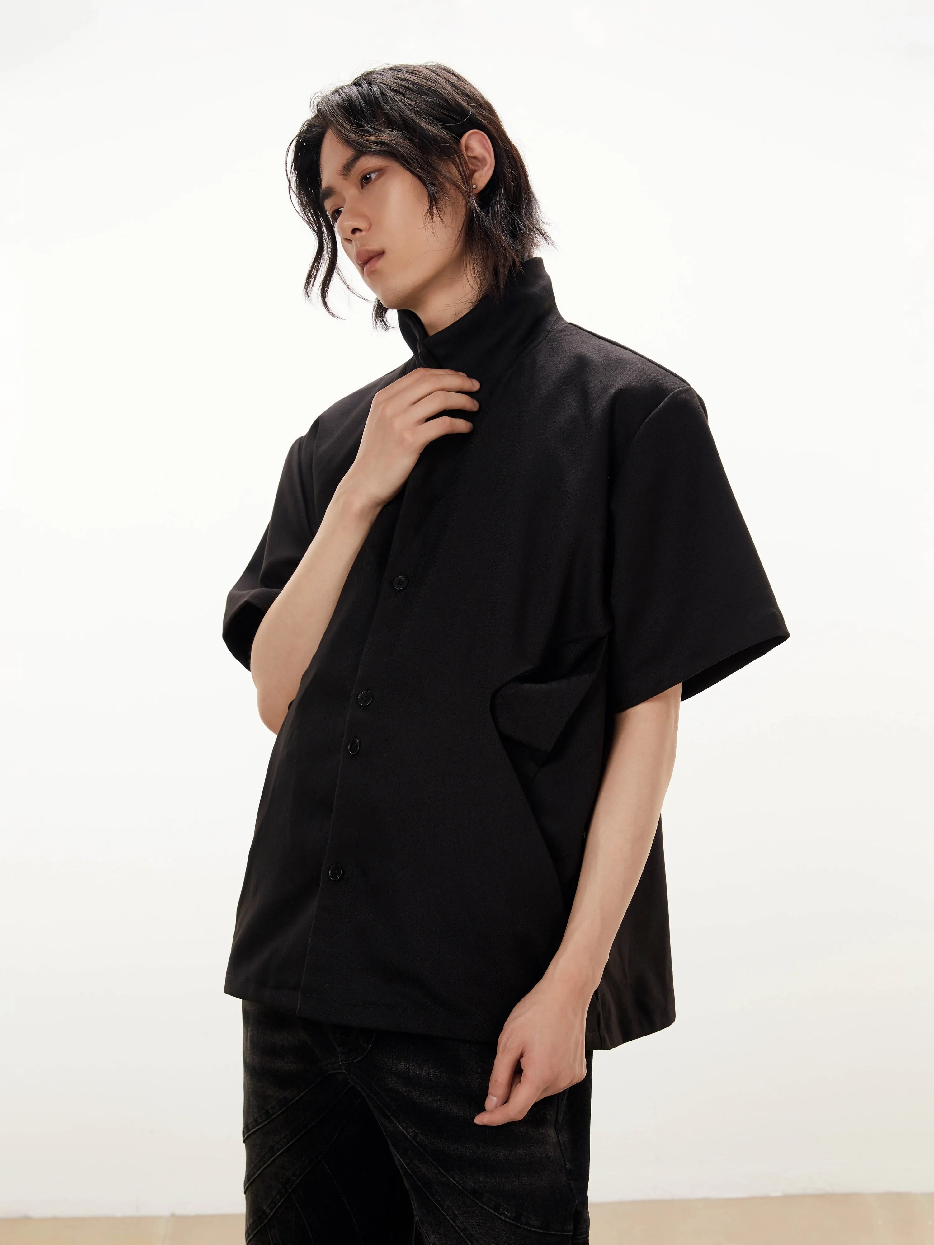 Elevate your wardrobe with this unisex short-sleeve shirt featuring a structured three-dimensional cut for a modern silhouette. Designed in a classic black tone, the shirt is crafted from heavyweight TR special fabric that offers both comfort and style. The high collar and clean front with minimal detailing provide a contemporary, minimalist look. Ideal for those who prefer sharp, architectural fashion with subtle sophistication.