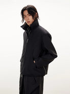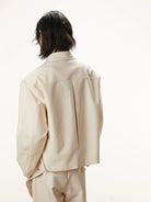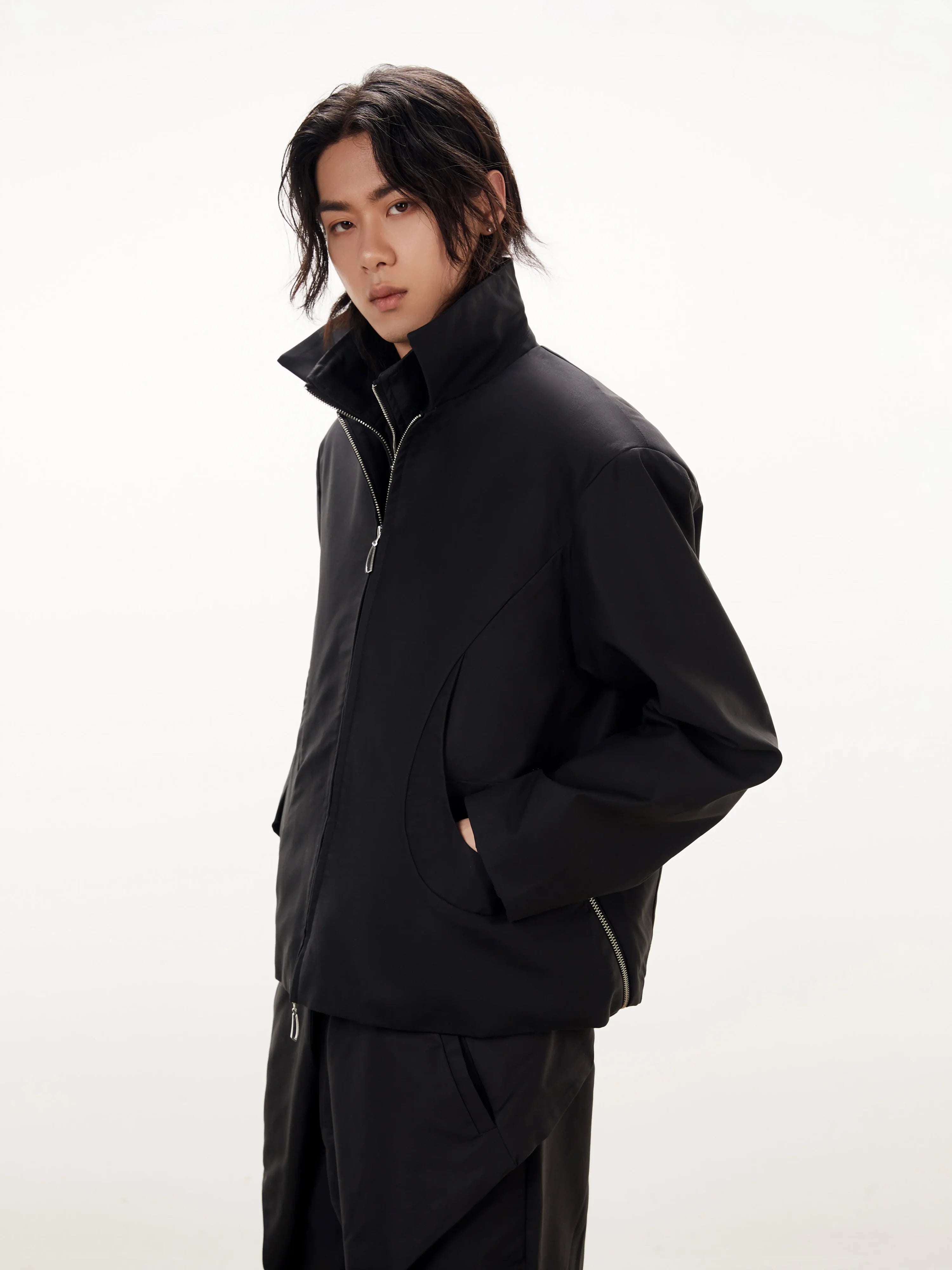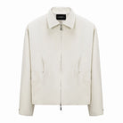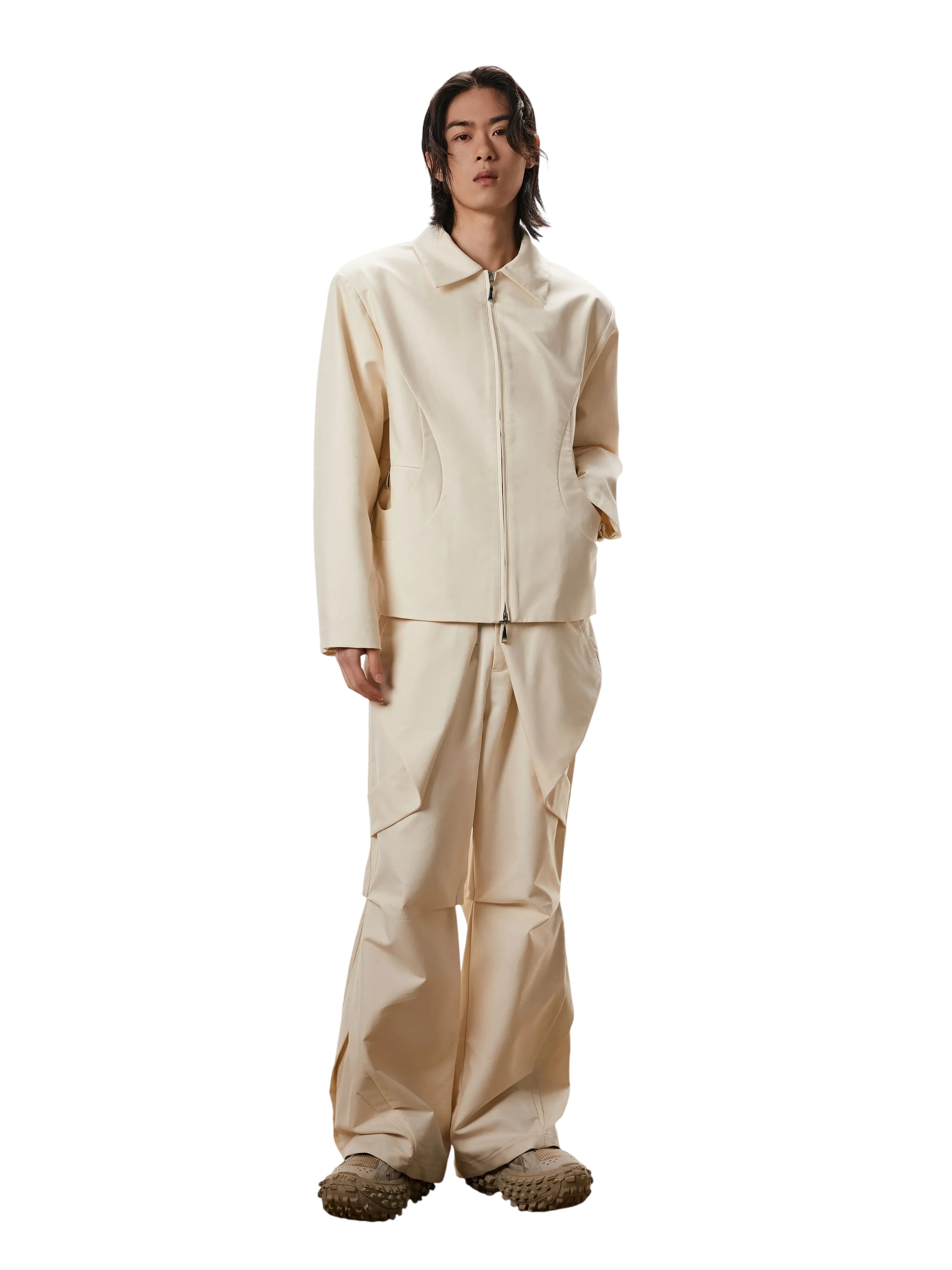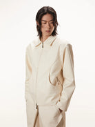 This men's structured commuter jacket features a high-density fabric construction with a clean, minimal silhouette. It includes a sharp pointed collar, front zip closure, and two side zippered pockets subtly integrated within crescent-shaped seam detailing. Designed in a soft cream tone, this jacket offers a polished, contemporary style ideal for both casual and refined settings.