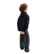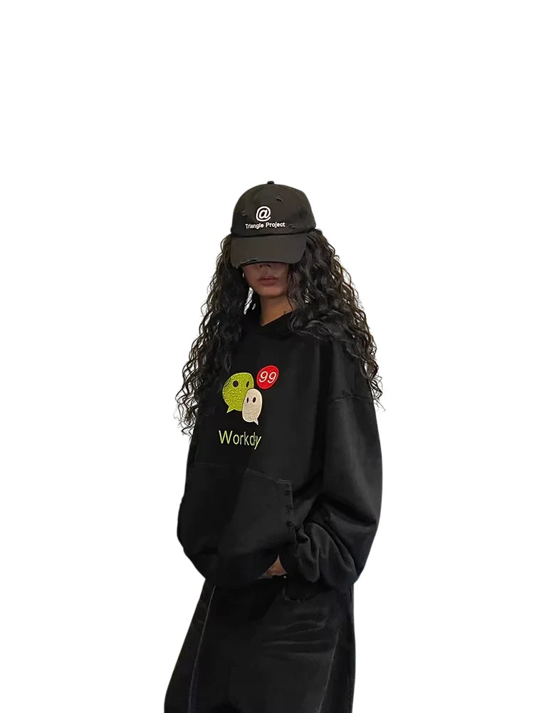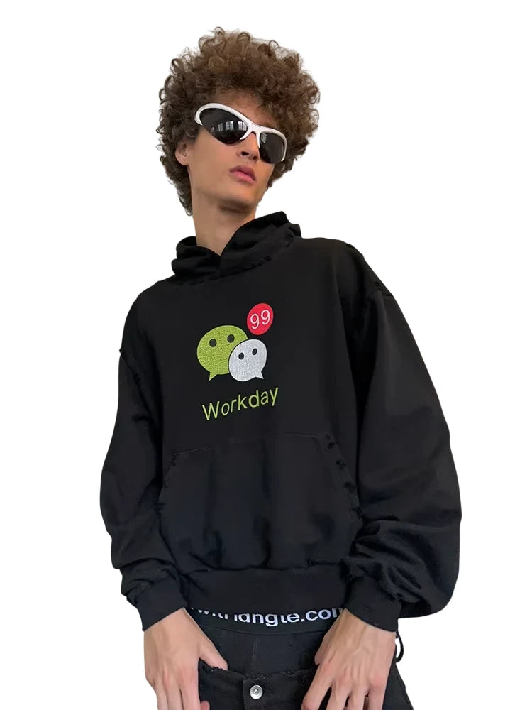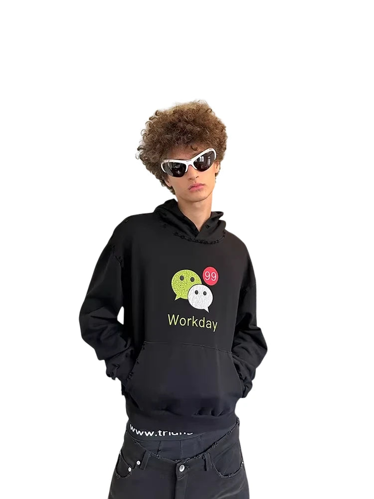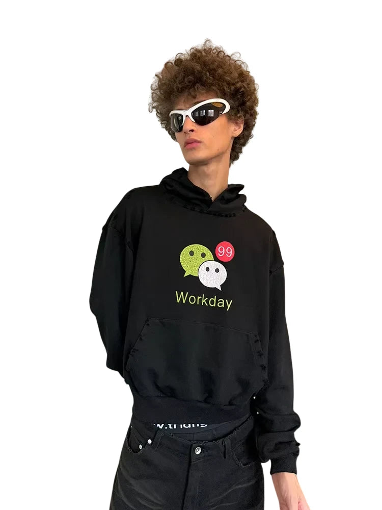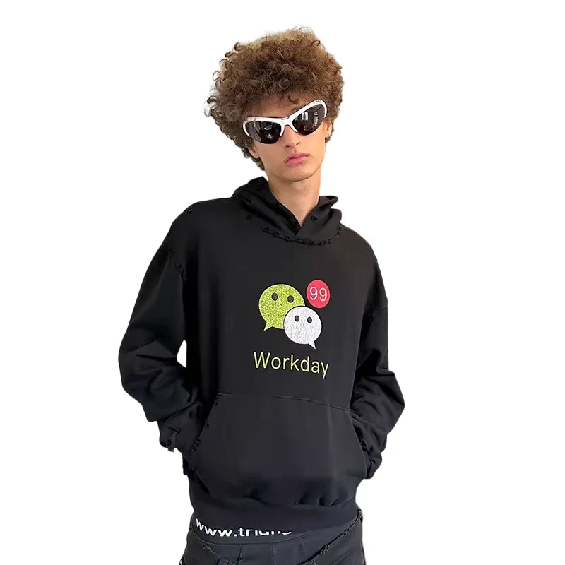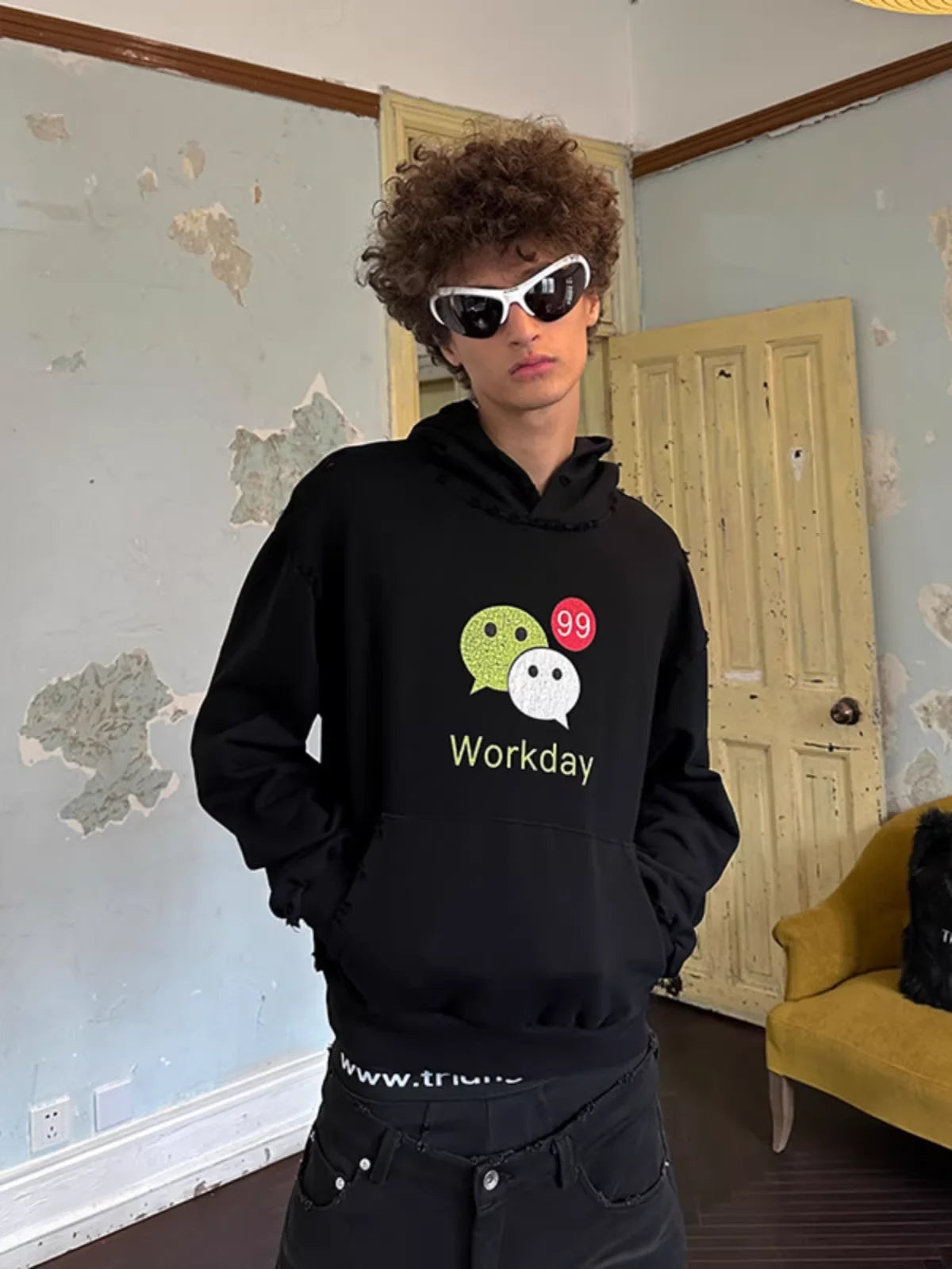 This men's black hoodie features a relaxed, loose fit with a distressed, washed finish for a stylish urban look. The front showcases a playful graphic resembling messaging app icons, including speech bubbles and a red notification dot marked with '99'. Below the illustration, the word 'Workday' appears in bold yellow-green text. Designed with a classic kangaroo pocket, ribbed cuffs, and hem, this hoodie combines comfort with a modern streetwear vibe. Perfect for casual wear with a bold, expressive twist.