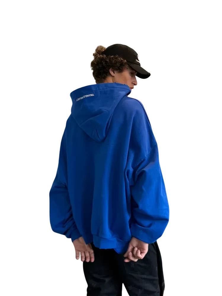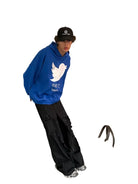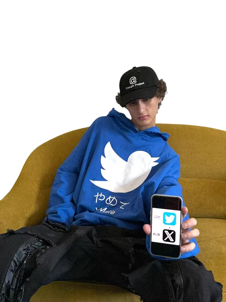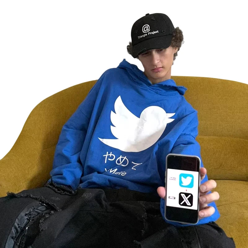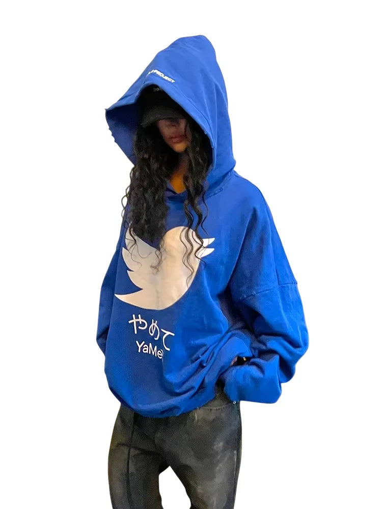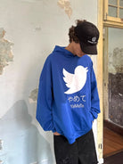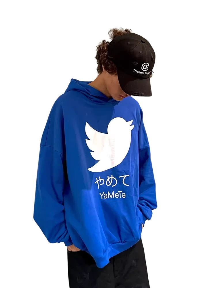 This men's oversized hoodie features a bold bird icon print on the front, inspired by social media graphics. Designed in a vibrant blue tone, the hoodie has a washed and distressed finish for a vintage, worn-in look. Japanese characters and the word 'Mate' add an urban, streetwear vibe. Perfect for a relaxed and casual style, it pairs easily with distressed pants and caps for a complete laid-back outfit.