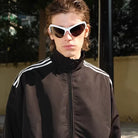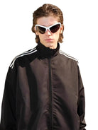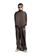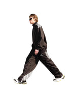 This men's nylon tracksuit set includes a loose-fitting zip-up jacket and matching track pants, designed with a sporty five-stripe detail running along the shoulders, sleeves, and sides. Made from lightweight, slightly glossy synthetic fabric, it offers both style and comfort for active or casual wear. The casual silhouette is paired with modern accents, making it ideal for streetwear-inspired looks.