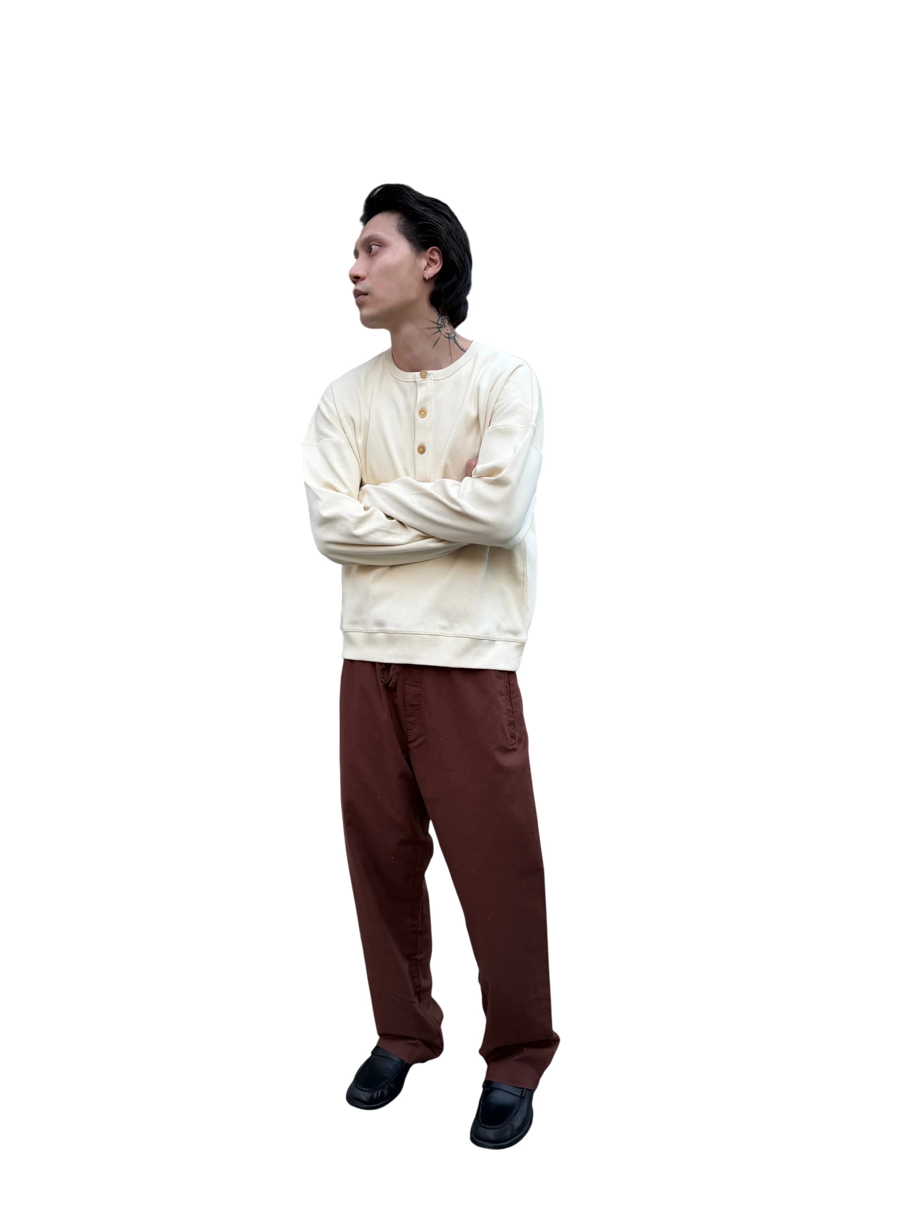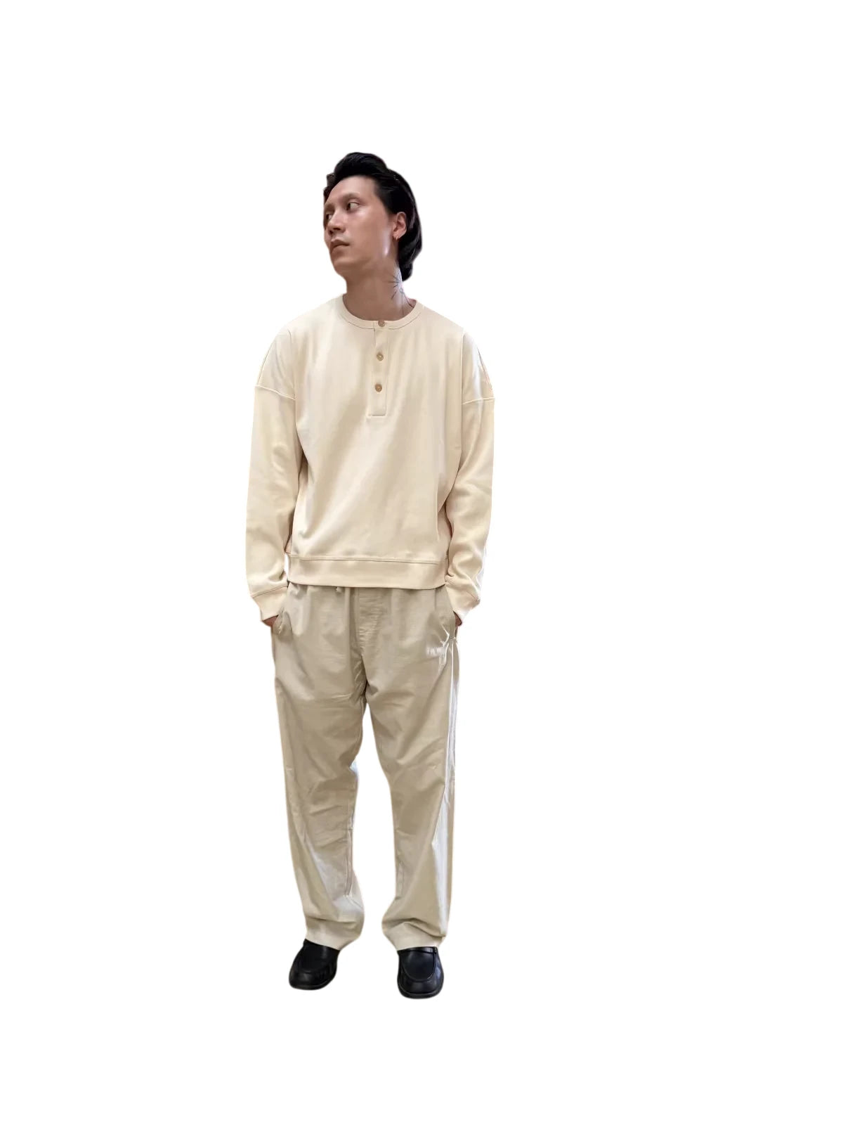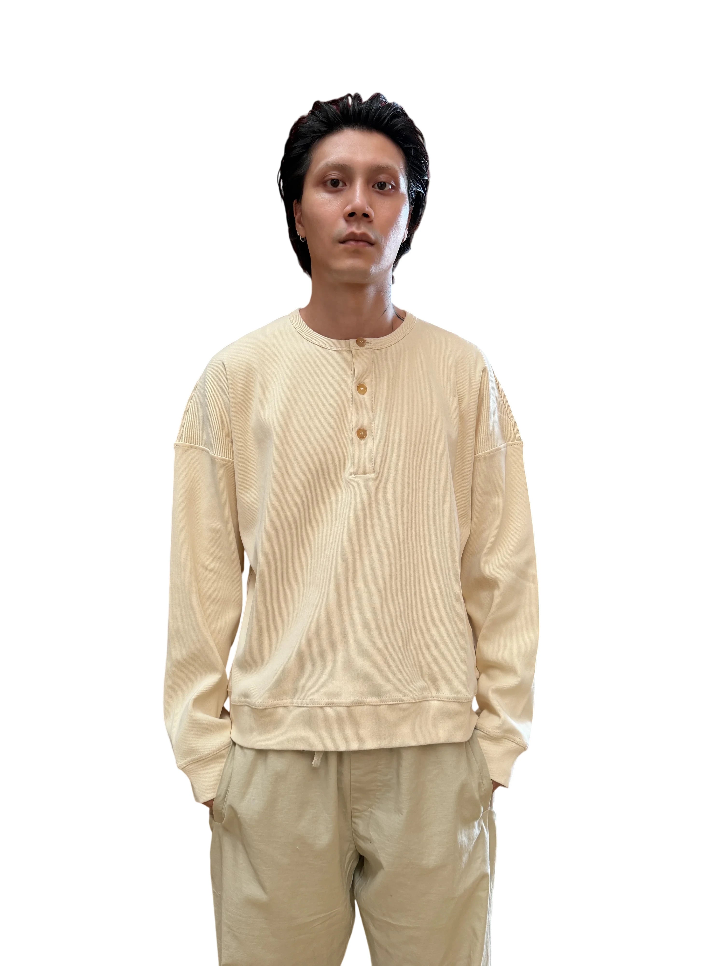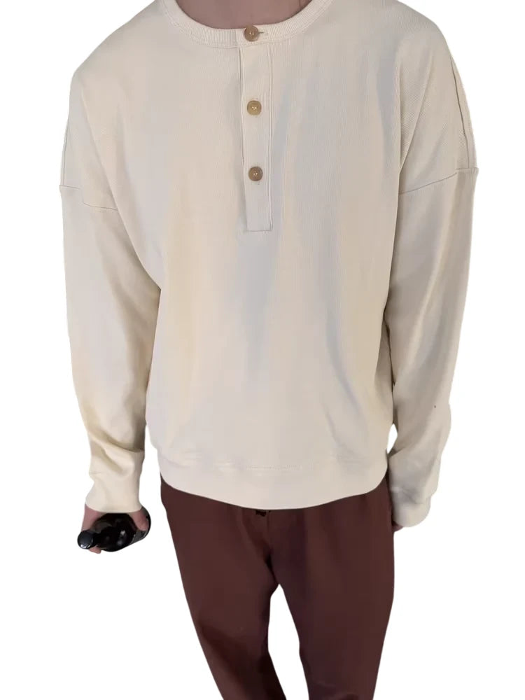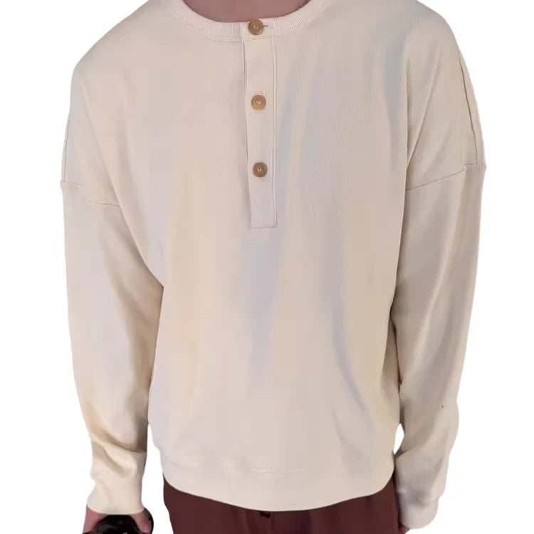 Elevate your casual wardrobe with this men's textured ribbed Henley sweatshirt. Made from a soft, comfortable fabric, it features a three-button placket and classic crew neckline. The long sleeves and relaxed fit with dropped shoulders make it perfect for laid-back days, while the off-white color adds versatile style to any outfit.