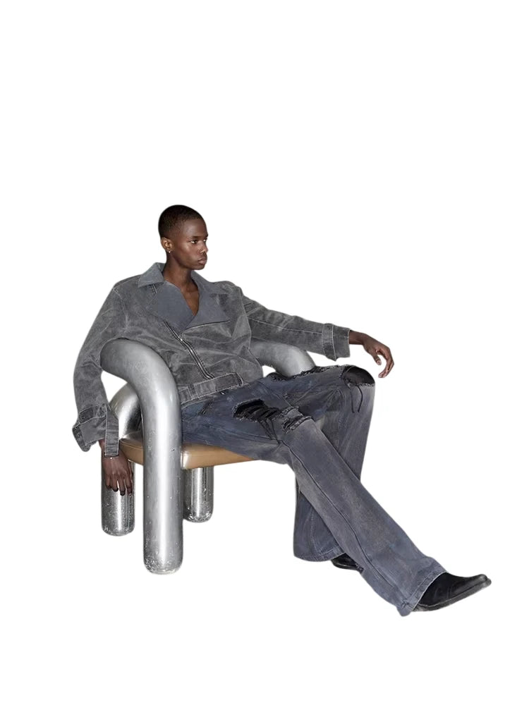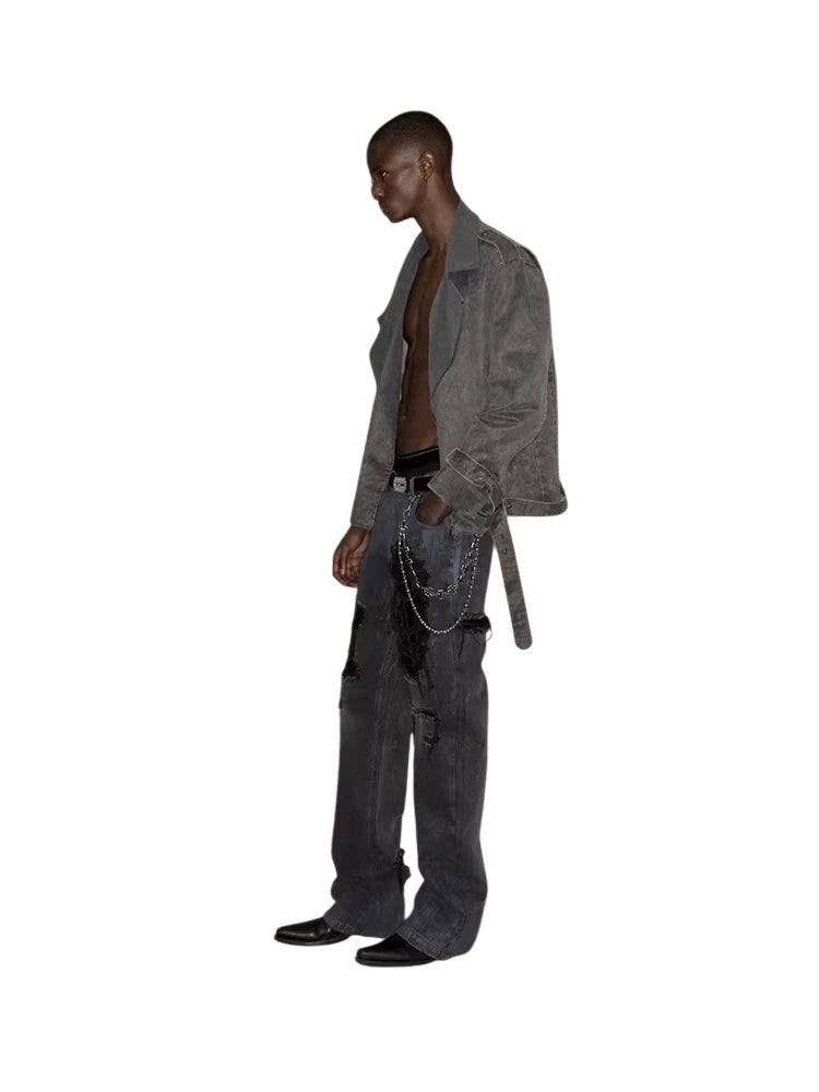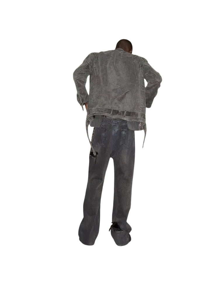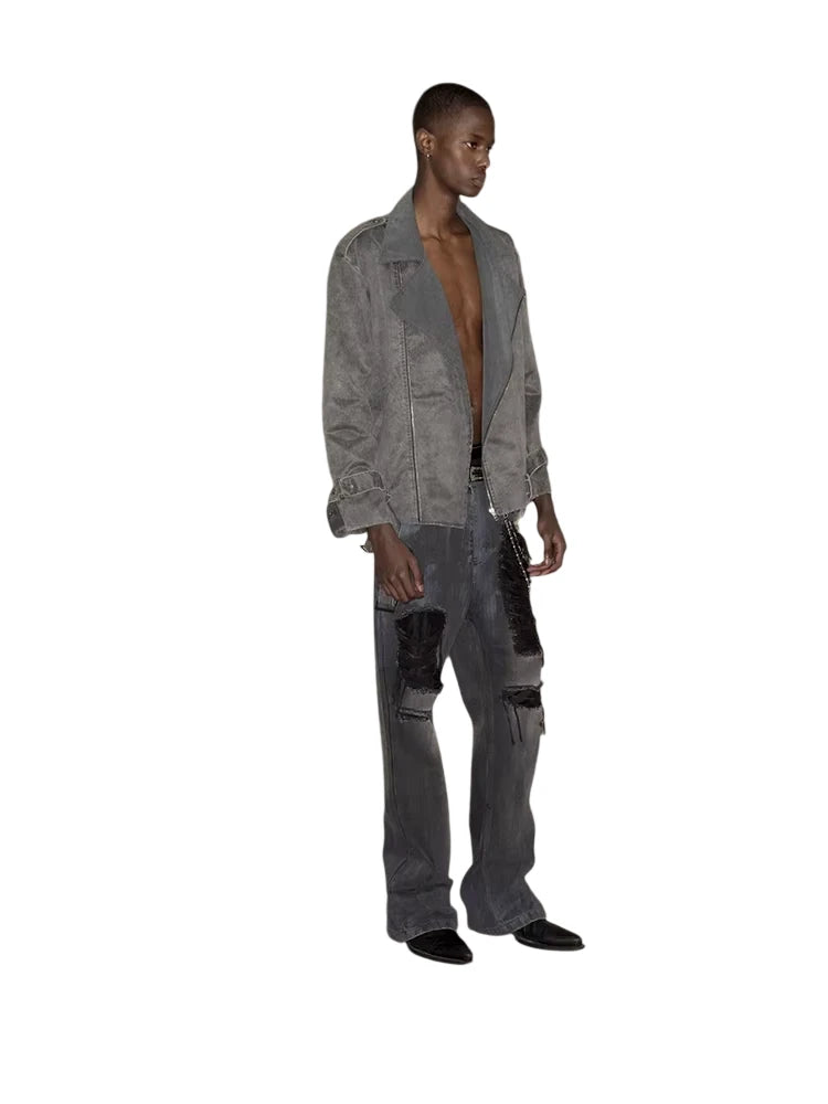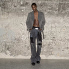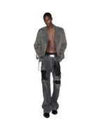 These floor-length jeans feature a bold black and blue mud-dyed finish, accented with heavy distressing and hand-painted aged details for a deconstructed, grunge-inspired appeal. The flared silhouette adds a dramatic touch, while the visible wear and patchwork create a vintage, avant-garde aesthetic. Styled here on a male model, the jeans are paired with an oversized suede trench and statement accessories for an edgy urban look.