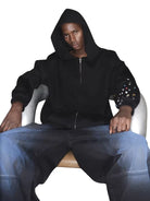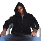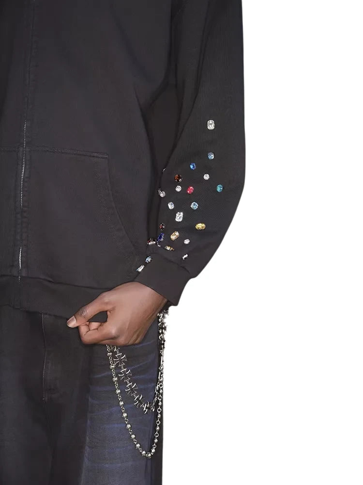 Elevate your casual wardrobe with this unisex loose fit zip hoodie, designed for both comfort and standout style. This black hoodie features a minimalist design with a relaxed silhouette, perfect for an urban, edgy look. A striking detail comes in the form of multi-colored gem embellishments adorning the right sleeve, adding a bold, artistic flair. Suitable for all genders, this pullover-style hoodie is ideal for those who appreciate detail-driven streetwear with a unique twist.