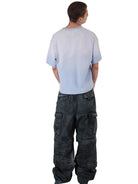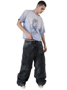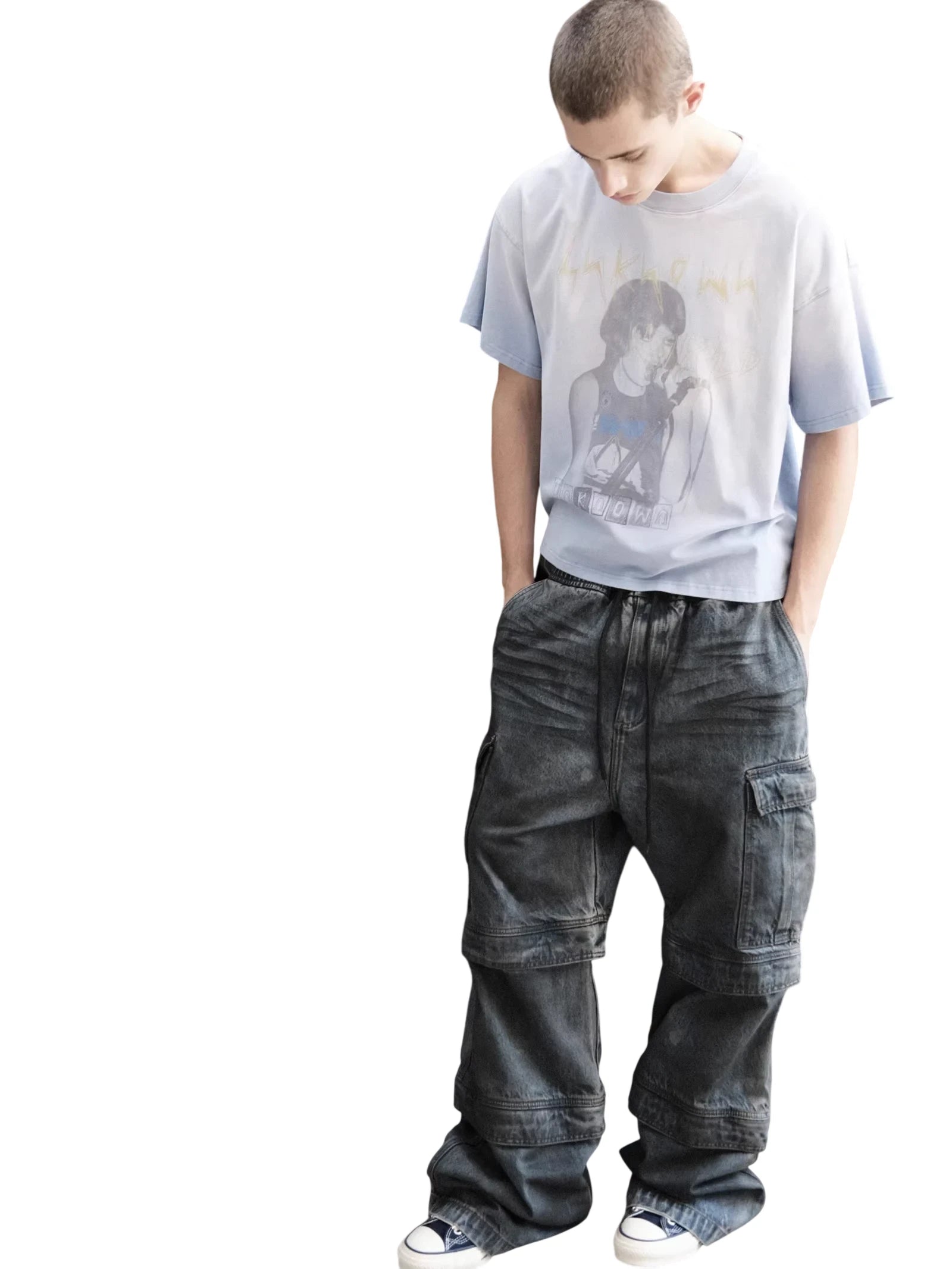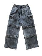 Designed for men, these 3-in-1 detachable cargo jeans feature a washed black or dark gray denim finish with a vintage, oil-stained look. The wide-leg silhouette and relaxed fit offer streetwear appeal, while multiple horizontal seam panels and large side flap pockets add to the utilitarian design. An elastic waistband with internal drawstring ensures adjustable comfort. Ideal for versatile styling and everyday functionality.