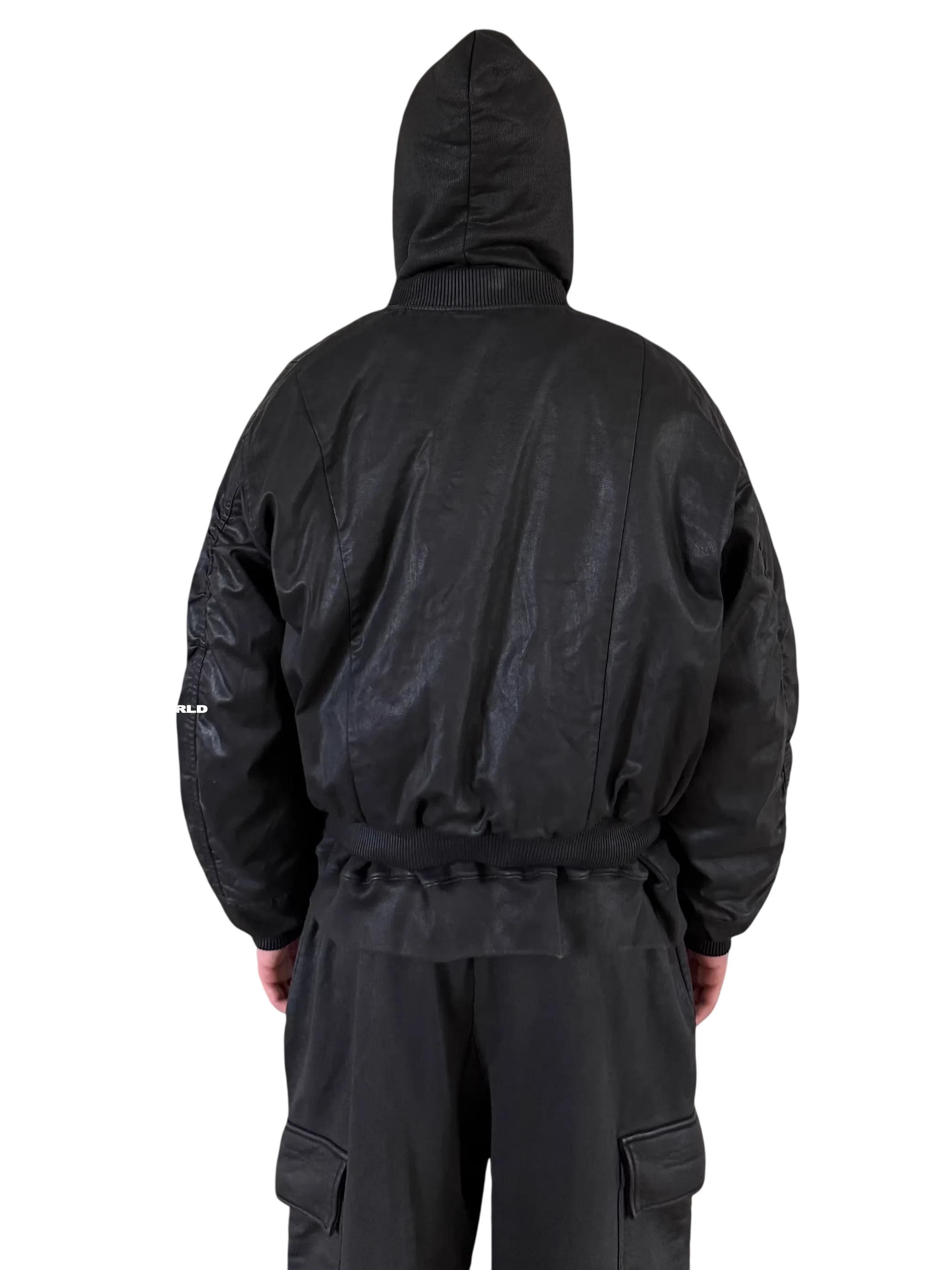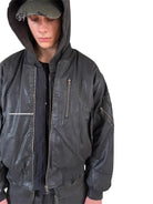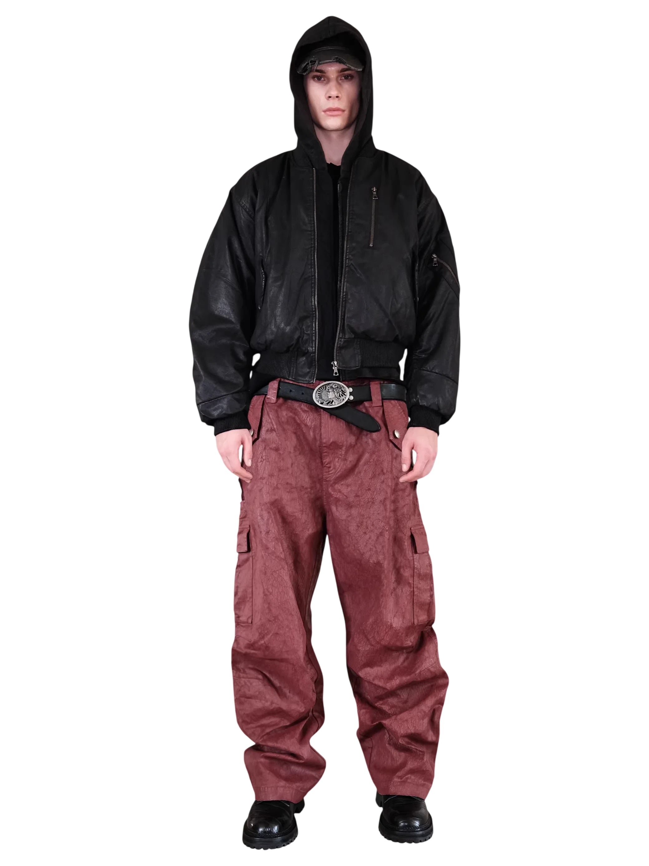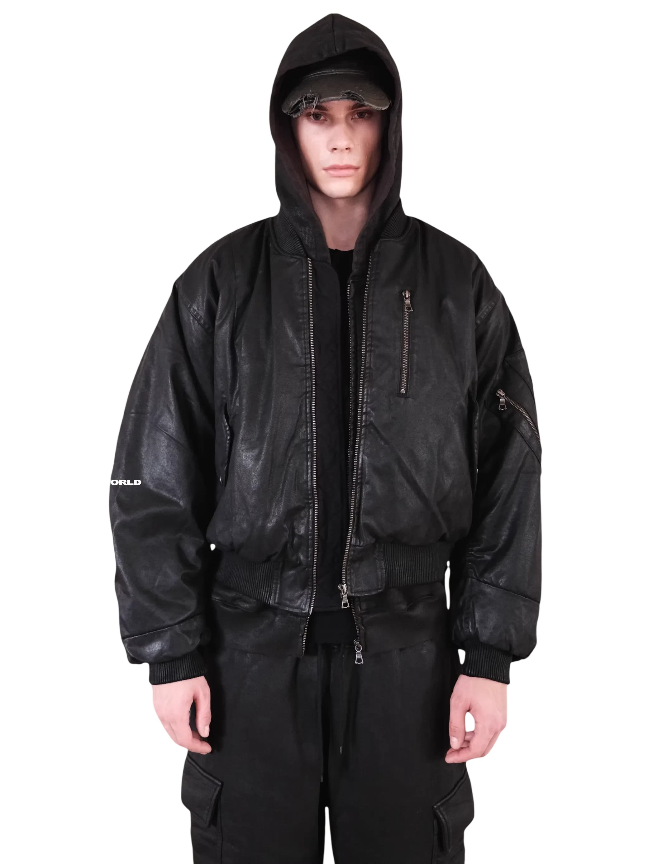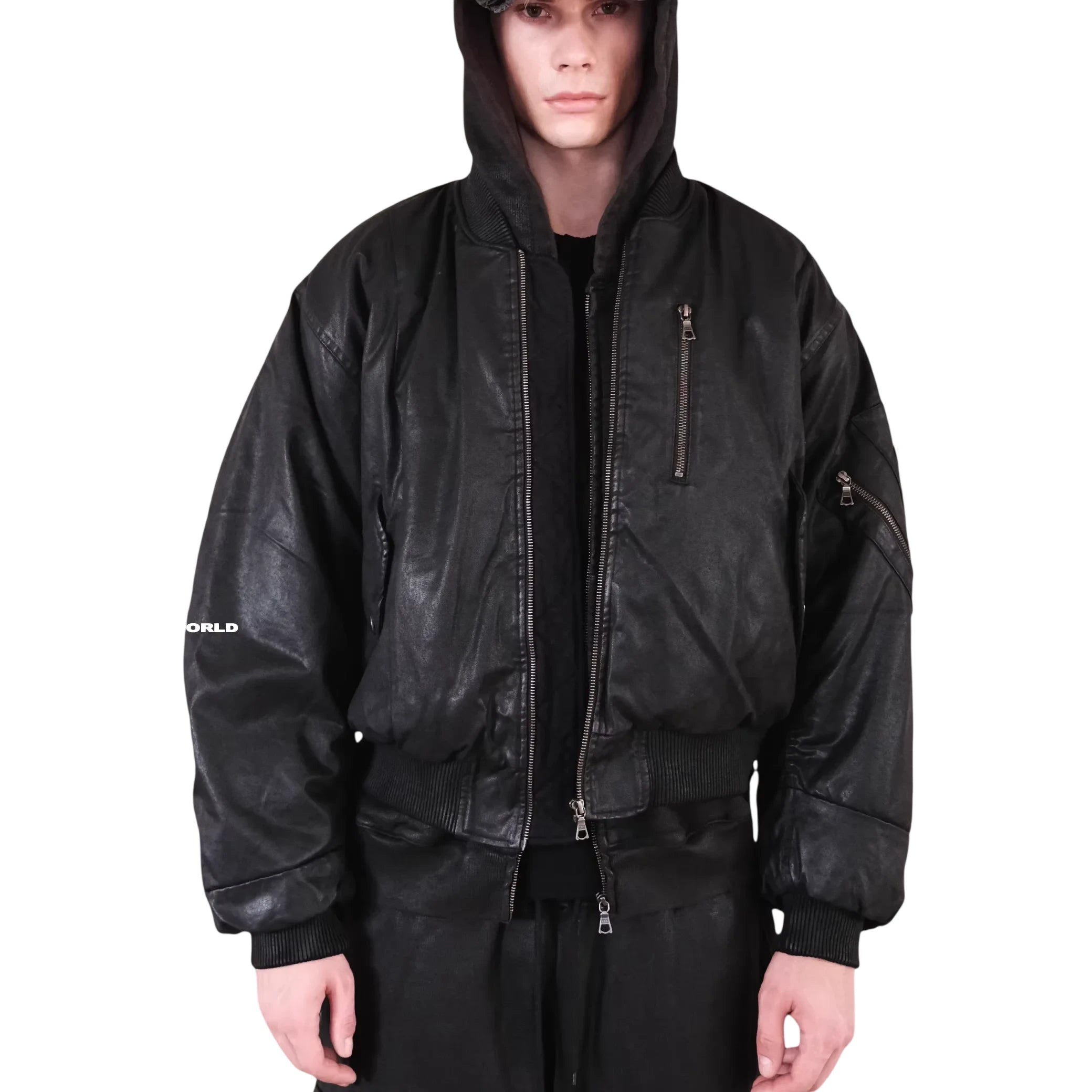 This men's oversized bomber jacket features a deconstructed silhouette crafted from a waxed, leather-like material for a rugged and durable appearance. The thick 450g wool padding provides exceptional warmth, making it ideal for colder seasons. Designed with practical elements, it includes a central front zipper, a vertical chest zipper pocket, and a zippered pocket on the left sleeve. Ribbed cuffs and waistband ensure a secure and comfortable fit, while the jacket layers effortlessly over a hoodie or other winter attire.