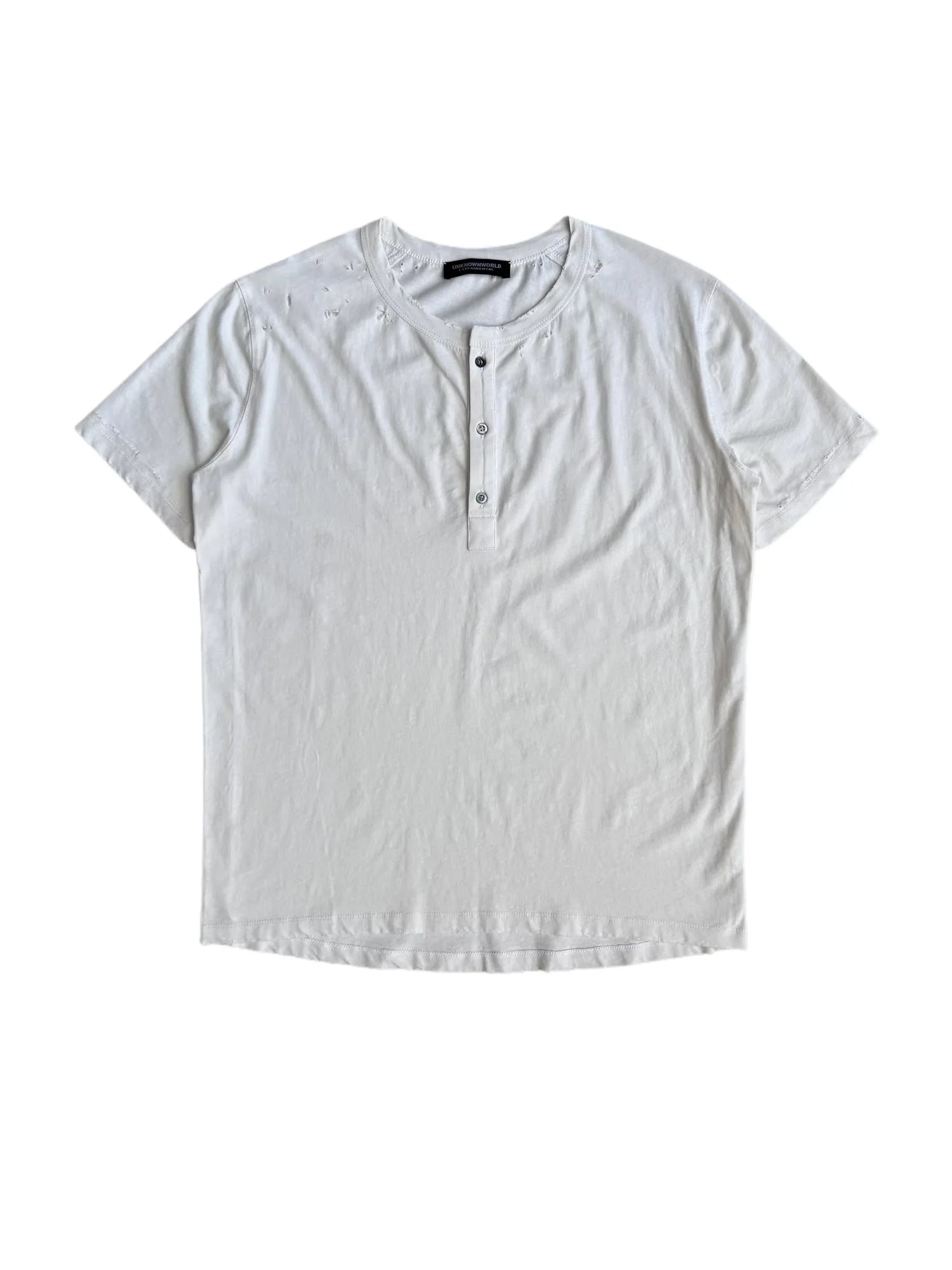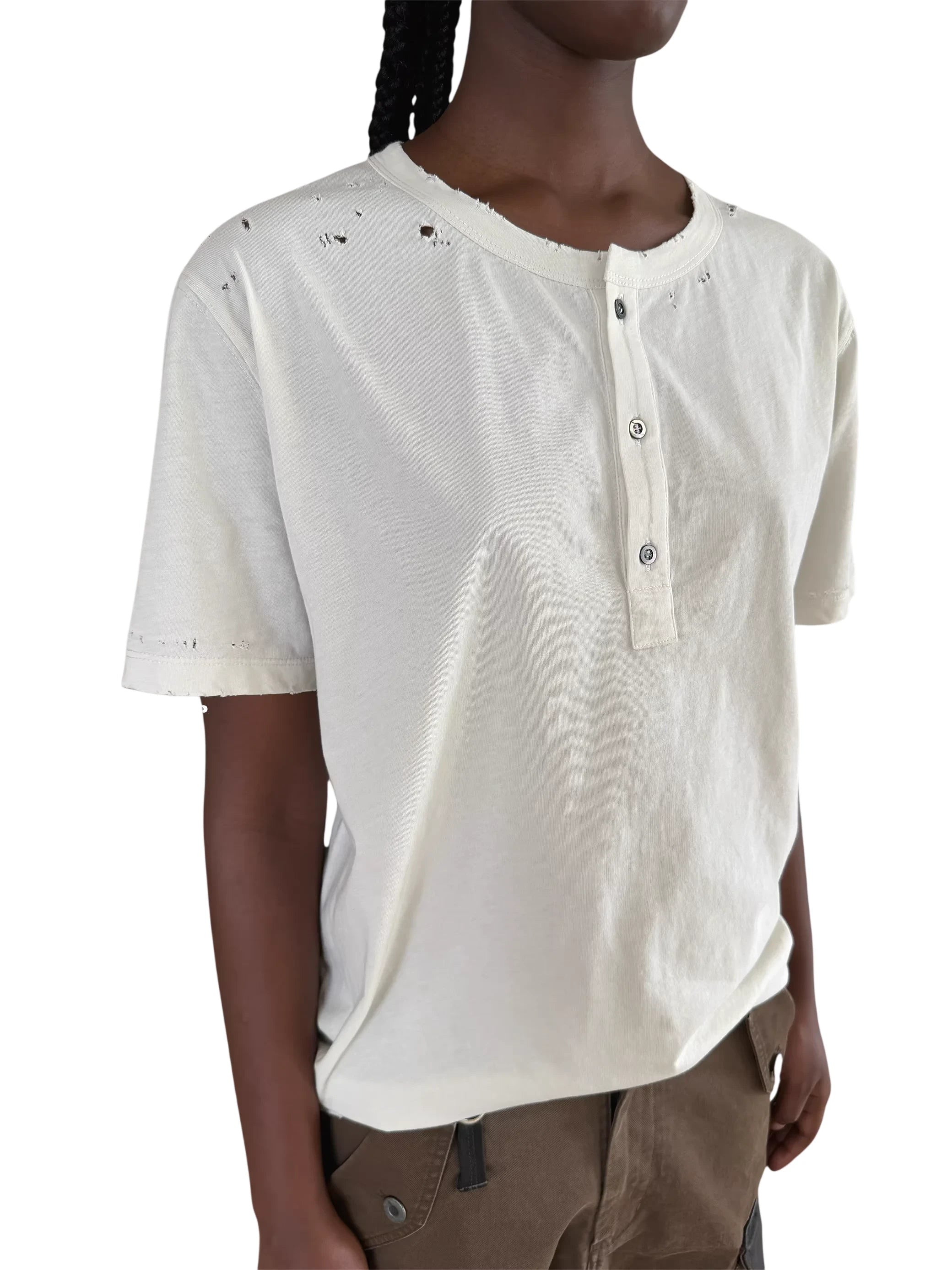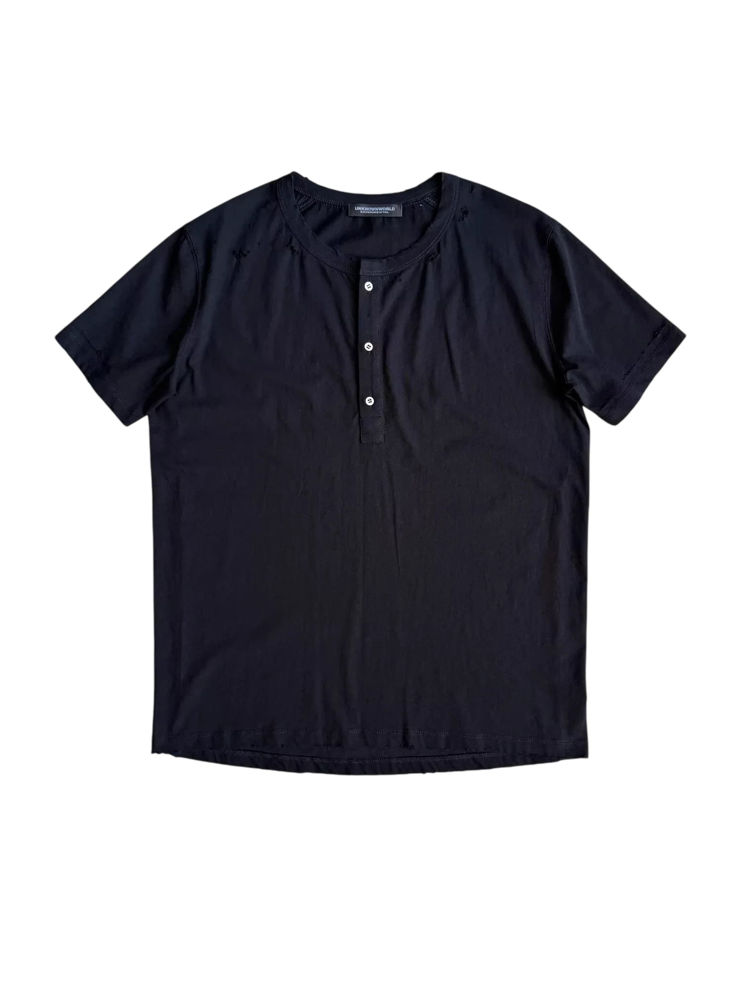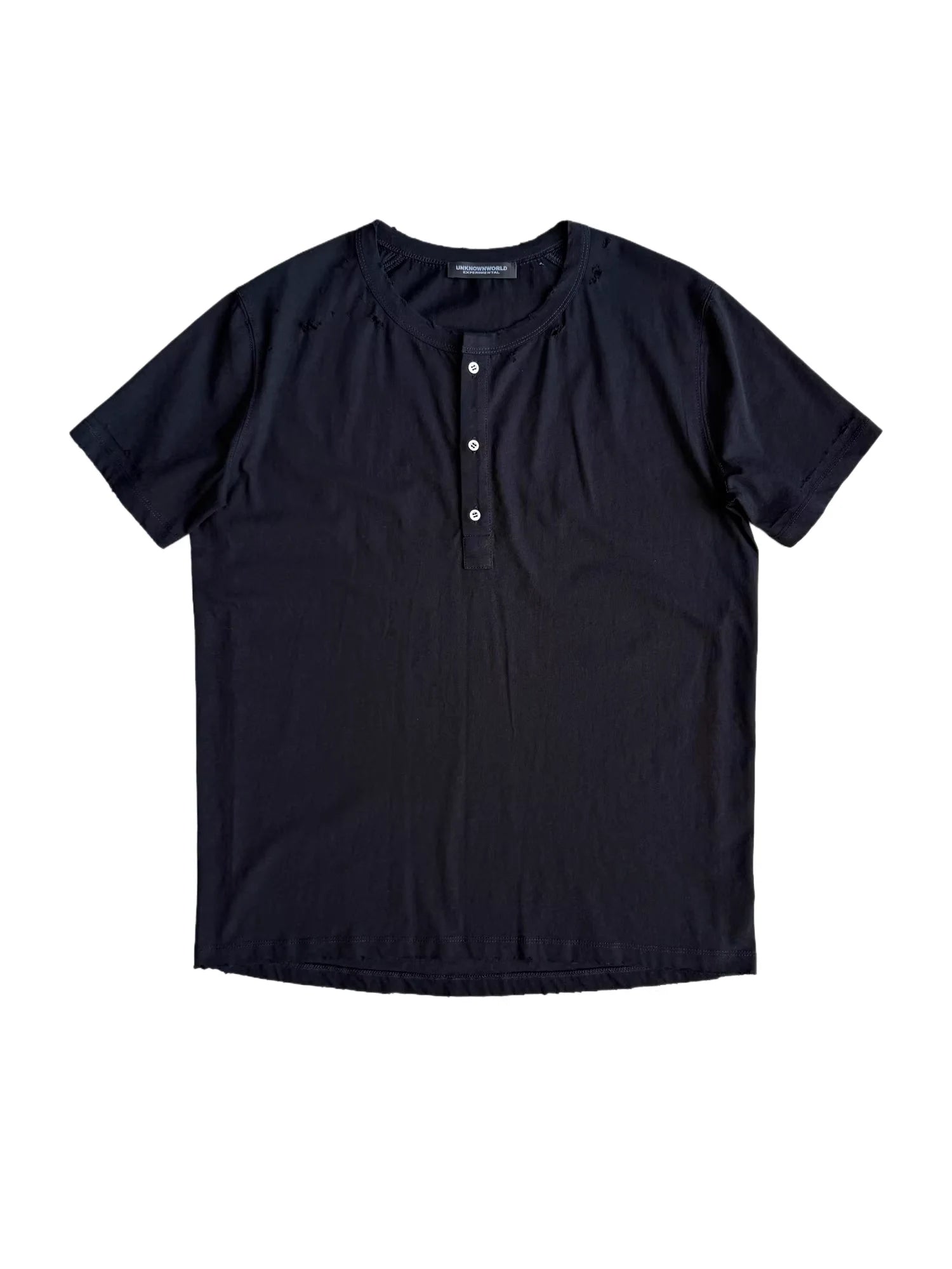 UNKNOWNWORLD Distressed Henley Short Sleeve Shirt with Mother-of-Pearl Buttons