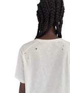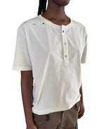 This women's short-sleeved henley shirt features a relaxed, casual fit with a three-button placket adorned with elegant mother-of-pearl buttons. Made from a soft, skin-friendly fabric, it offers everyday comfort and style. The distressed detailing adds a subtle rugged edge, perfect for pairing with a variety of casual outfits.